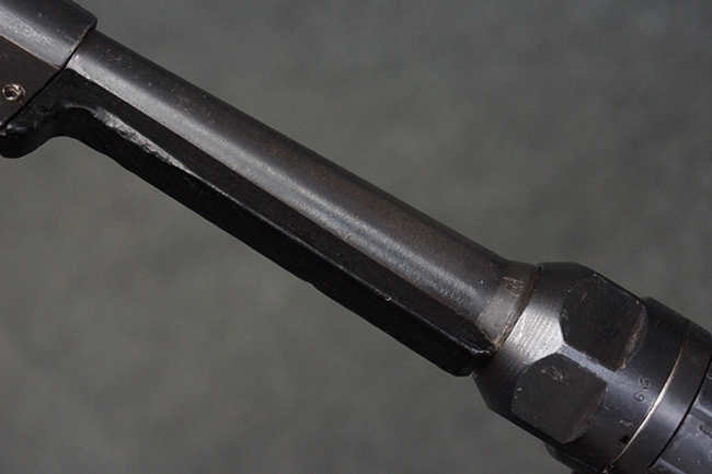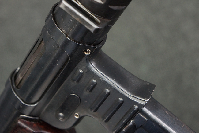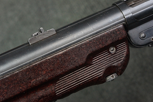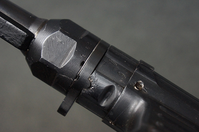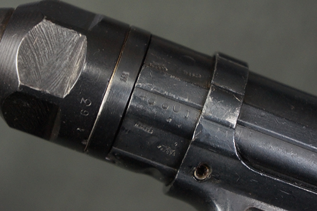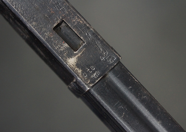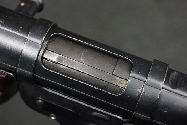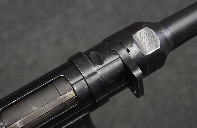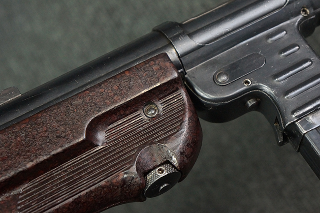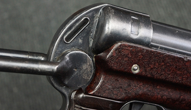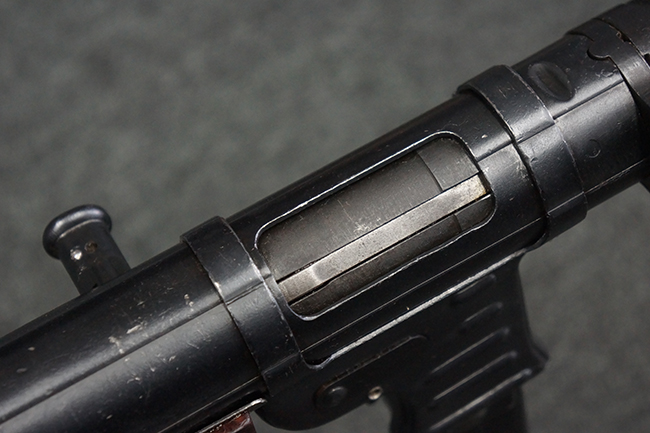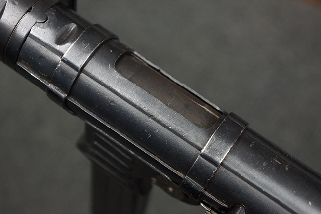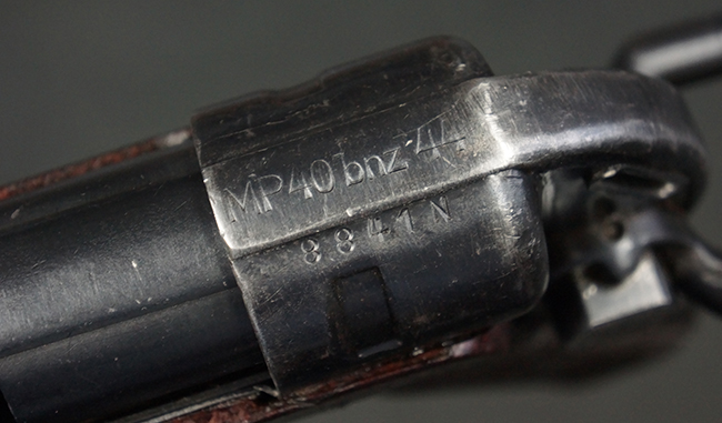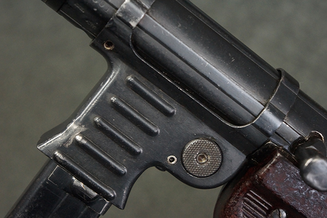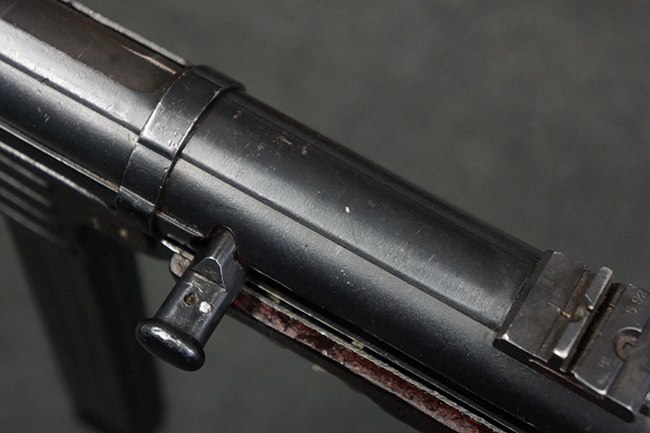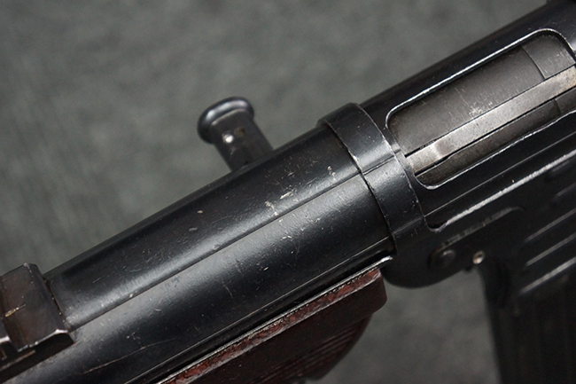 本品のレシーバー・エンド・キャップ上面には「MP40」のモデル名及び1944年ステアー社製を示す「bnz. 44」の刻印が入っています。 マガジン・ハウジングは両面に5本の強化リブが追加されたタイプとなっています。 シリアルNo.はアッパー・レシーバーが4880、バレル・ナットが263、フロント・サイト・ガードが992、リア・サイトが592、折り畳みストックが809 (もしくは608)、リコイル・スプリング・チューブが388となっています。 尚、分解用ラッチにはハーネル社を示す「fxo」のメーカー・コードが確認出来ます。 本品のレシーバー・エンド・キャップとロア・レシーバーをプレスにより一体成型されたタイプで、プレスにより鋼板を折り込む方法でロア・レシーバー全体を成形しており、エンド・キャップ上面からロア・レシーバーの外縁部にかけて補強板のように見える板状の継ぎ目が見られます。 マズル・リングは後期型の中央に溝のあるH型、バレル・ナットは六角型のタイプ、バレル・レストは樹脂製となっており、コッキング・ハンドルは1942年半ば以降に本格的に導入されたボルト・セーフティ機能を備えた2ピース・タイプが装備されています。