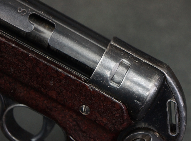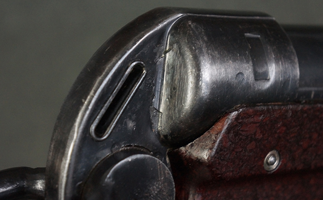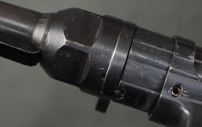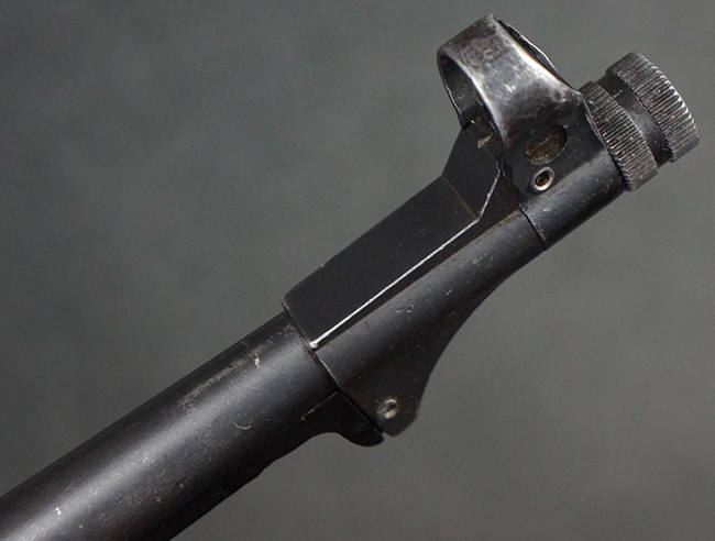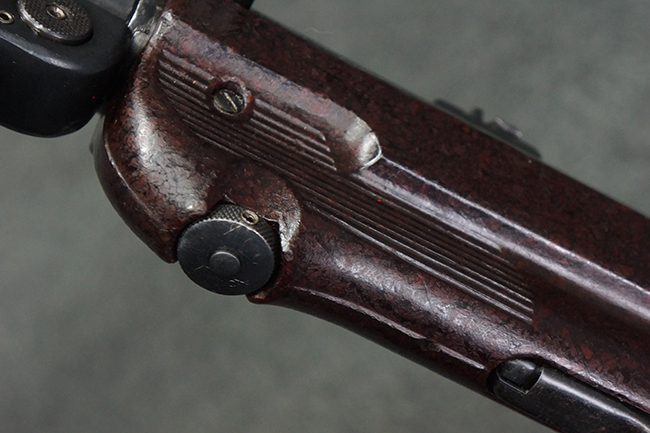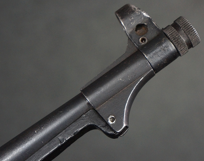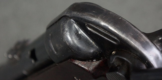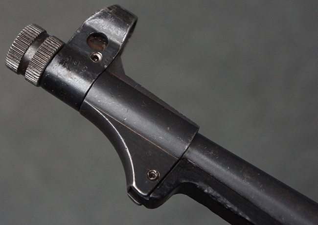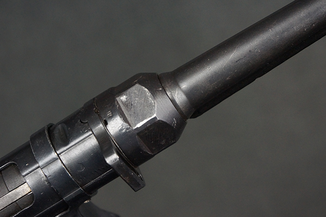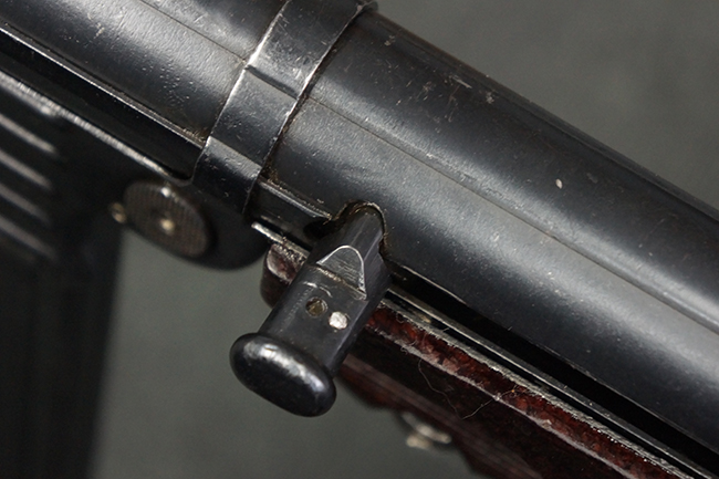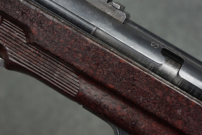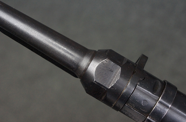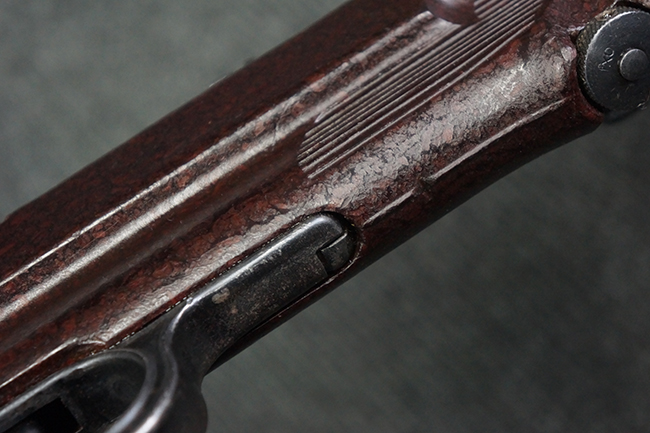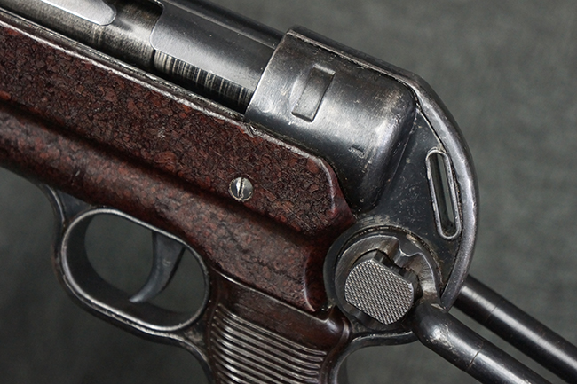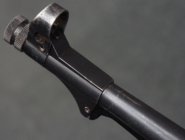 本品のレシーバー・エンド・キャップ上面には「MP40」のモデル名及び1944年ステアー社製を示す「bnz. 44」の刻印が入っています。 マガジン・ハウジングは両面に5本の強化リブが追加されたタイプとなっています。 シリアルNo.はアッパー・レシーバーが4880、バレル・ナットが263、フロント・サイト・ガードが992、リア・サイトが592、折り畳みストックが809 (もしくは608)、リコイル・スプリング・チューブが388となっています。 尚、分解用ラッチにはハーネル社を示す「fxo」のメーカー・コードが確認出来ます。 本品のレシーバー・エンド・キャップとロア・レシーバーをプレスにより一体成型されたタイプで、プレスにより鋼板を折り込む方法でロア・レシーバー全体を成形しており、エンド・キャップ上面からロア・レシーバーの外縁部にかけて補強板のように見える板状の継ぎ目が見られます。 マズル・リングは後期型の中央に溝のあるH型、バレル・ナットは六角型のタイプ、バレル・レストは樹脂製となっており、コッキング・ハンドルは1942年半ば以降に本格的に導入されたボルト・セーフティ機能を備えた2ピース・タイプが装備されています。
