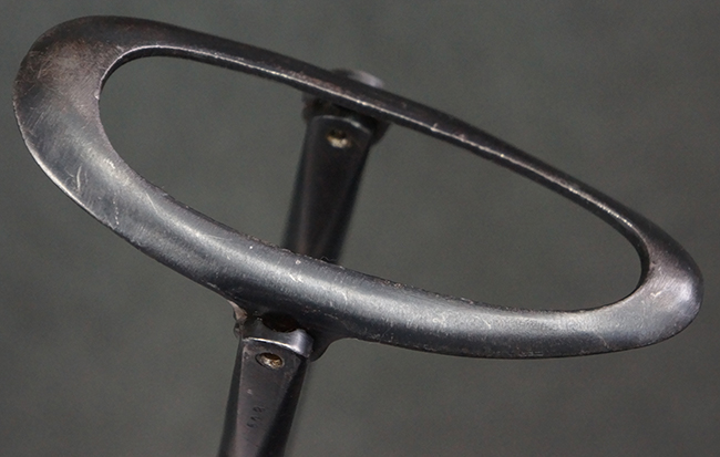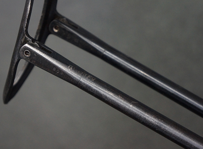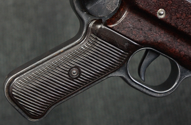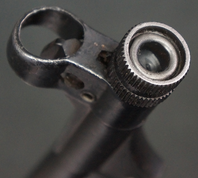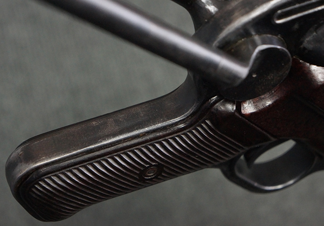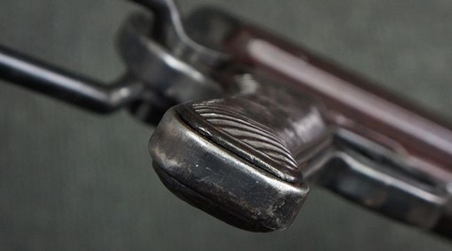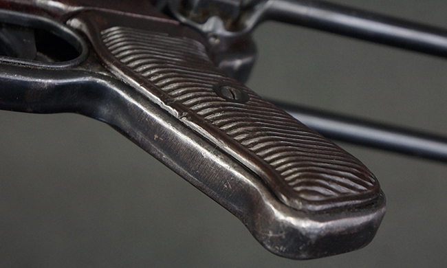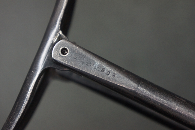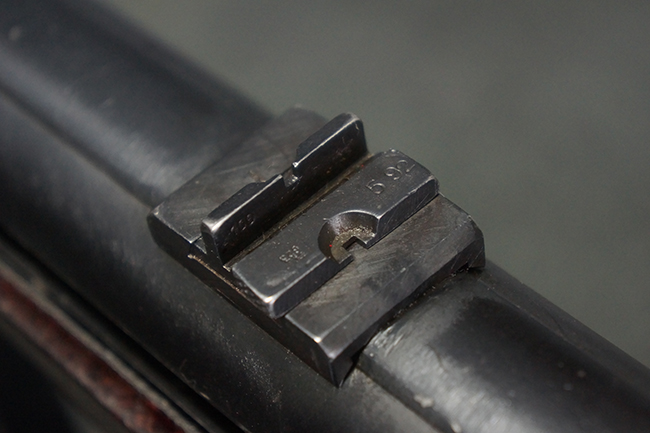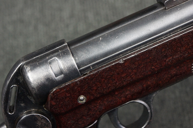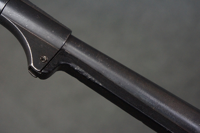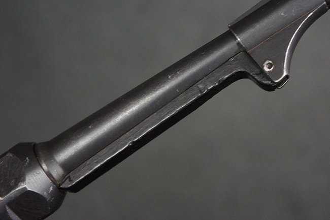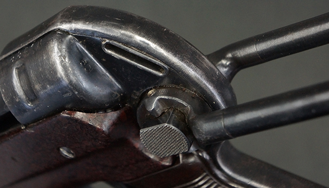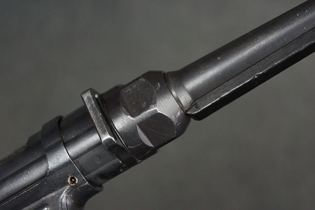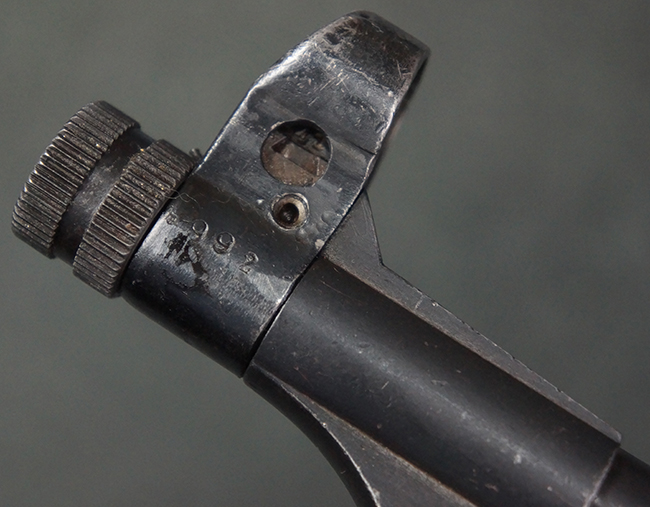 本品のレシーバー・エンド・キャップ上面には「MP40」のモデル名及び1944年ステアー社製を示す「bnz. 44」の刻印が入っています。 マガジン・ハウジングは両面に5本の強化リブが追加されたタイプとなっています。 シリアルNo.はアッパー・レシーバーが4880、バレル・ナットが263、フロント・サイト・ガードが992、リア・サイトが592、折り畳みストックが809 (もしくは608)、リコイル・スプリング・チューブが388となっています。 尚、分解用ラッチにはハーネル社を示す「fxo」のメーカー・コードが確認出来ます。 本品のレシーバー・エンド・キャップとロア・レシーバーをプレスにより一体成型されたタイプで、プレスにより鋼板を折り込む方法でロア・レシーバー全体を成形しており、エンド・キャップ上面からロア・レシーバーの外縁部にかけて補強板のように見える板状の継ぎ目が見られます。 マズル・リングは後期型の中央に溝のあるH型、バレル・ナットは六角型のタイプ、バレル・レストは樹脂製となっており、コッキング・ハンドルは1942年半ば以降に本格的に導入されたボルト・セーフティ機能を備えた2ピース・タイプが装備されています。