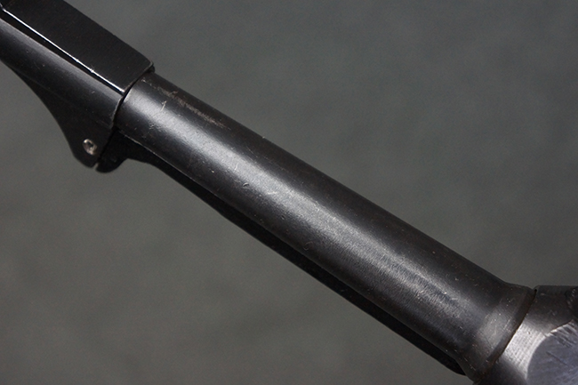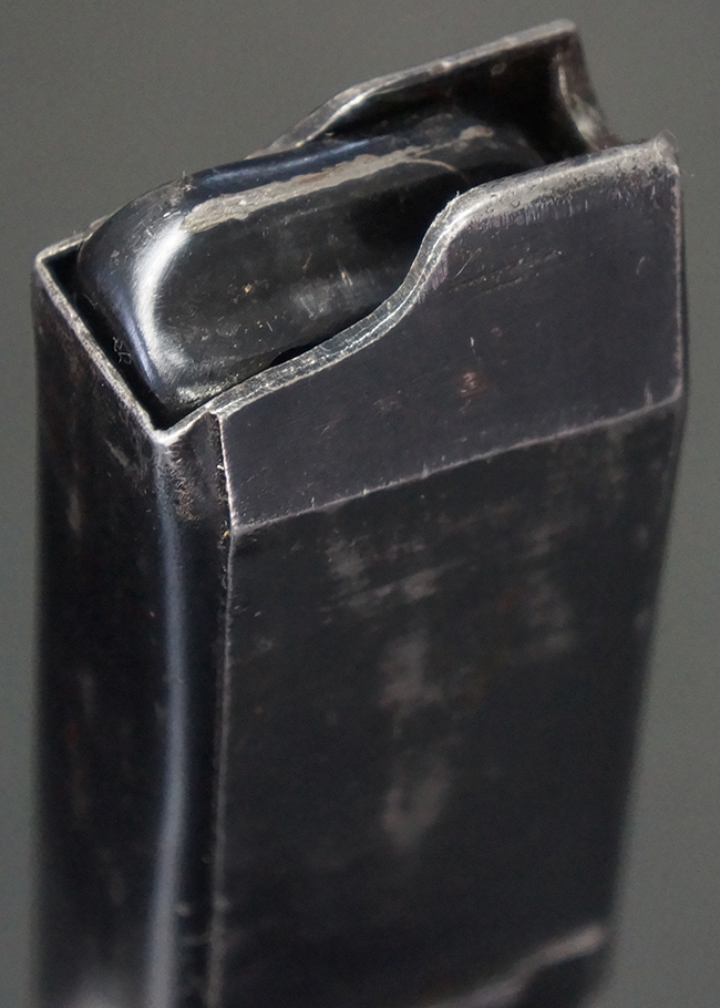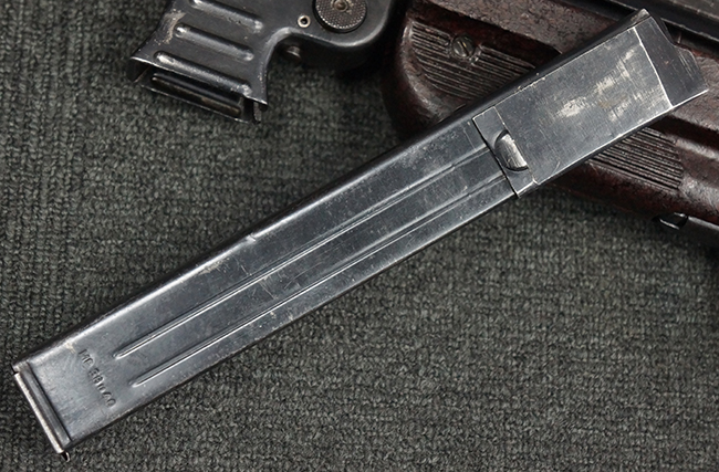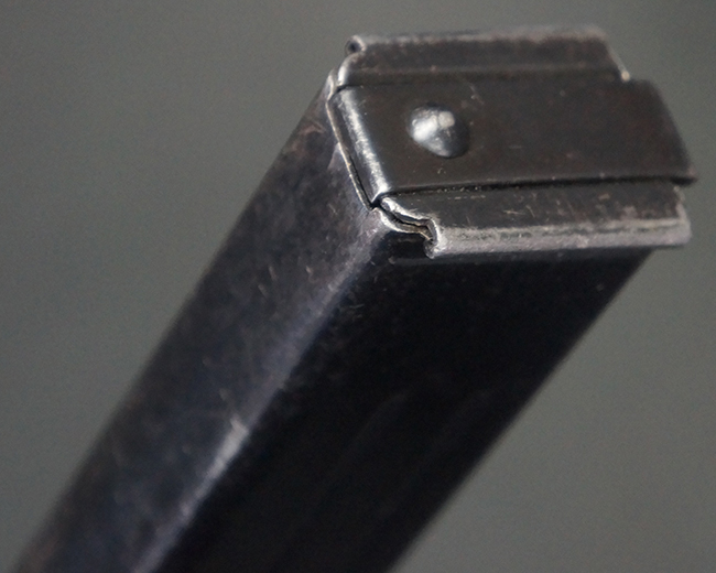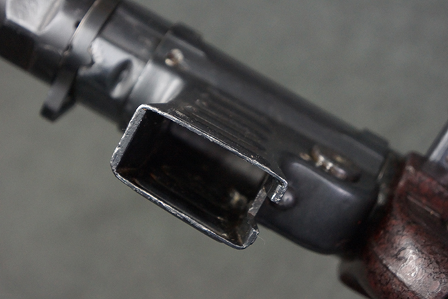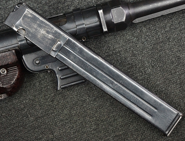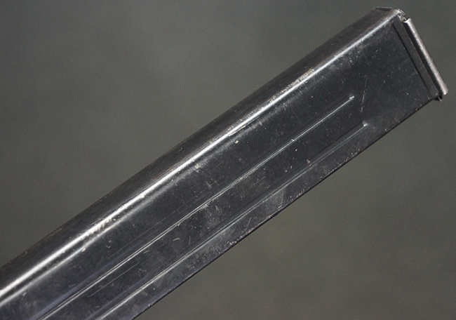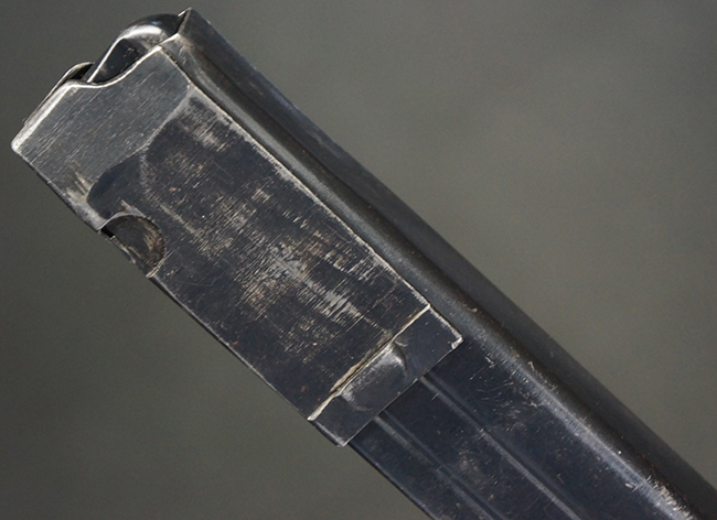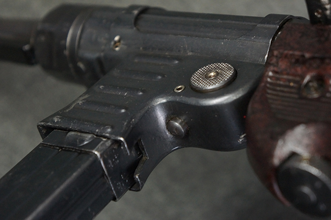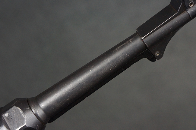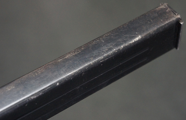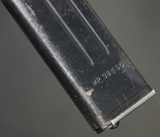 本品の機関部や銃身といった金属部はやや打ち傷や擦れの他、一部に表面錆痕や仕上げが落ちて金属の地肌が表れている箇所が見られるものの、現状目立った欠損等は見受けられません。 樹脂製のハンドガードやグリップ・パネル、バレル・レストについても、やや打ち傷や線傷、若干の摩耗は見られるものの、大きな破損等は見られず、比較的良好な状態が保たれています。 アッパー・レシーバーとロア・レシーバーの取り付けについてはやや遊びが見られ、マガジン・ハウジングにも若干のがたつきが見られます。 マガジンの着脱やリア・サイトの切り替え、ストックの展開・折り畳み操作については問題なく行う事が可能です。 マガジンは取り付け時に前後にやや遊びが見られますが、固定自体はしっかりとしています。 ストックは展開時及び折り畳み時にやや遊びが見られます。 付属のマガジンには「MP38 u 40」及び1942年Frank'sche Eisenwerke AG製を示す「bte 42」の刻印が入っており、やや打ち傷や擦れ、経年による褪色の他、一部にアタリや仕上げが薄くなり金属の地肌が表れている箇所が見られます。 尚、マガジン・スプリングは入っています。