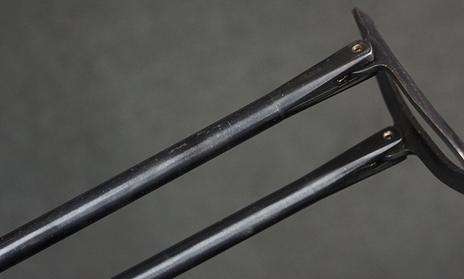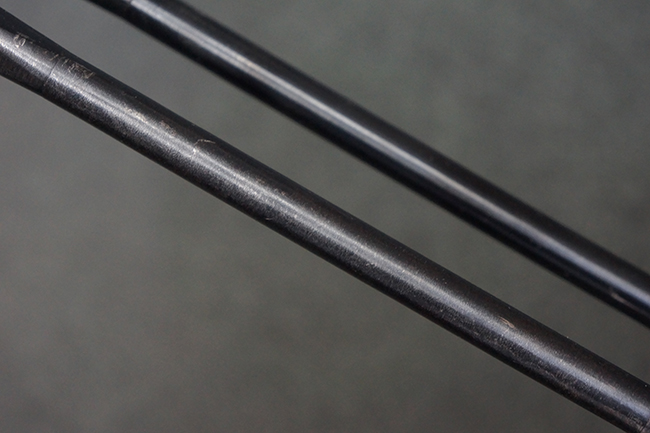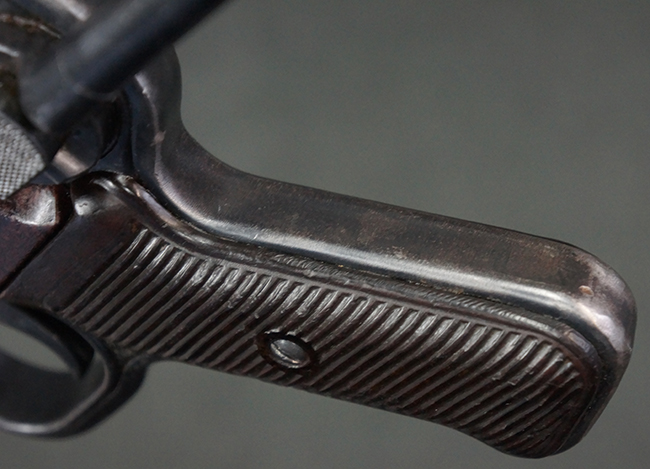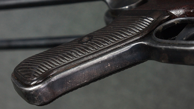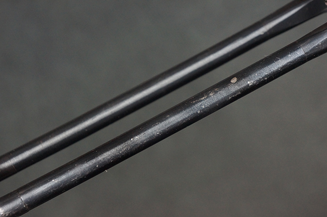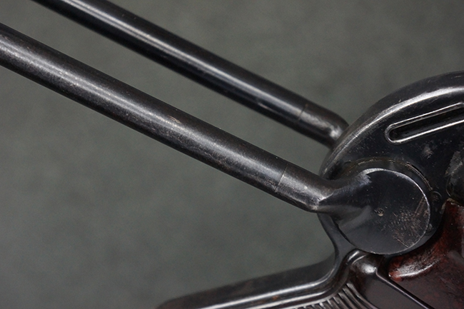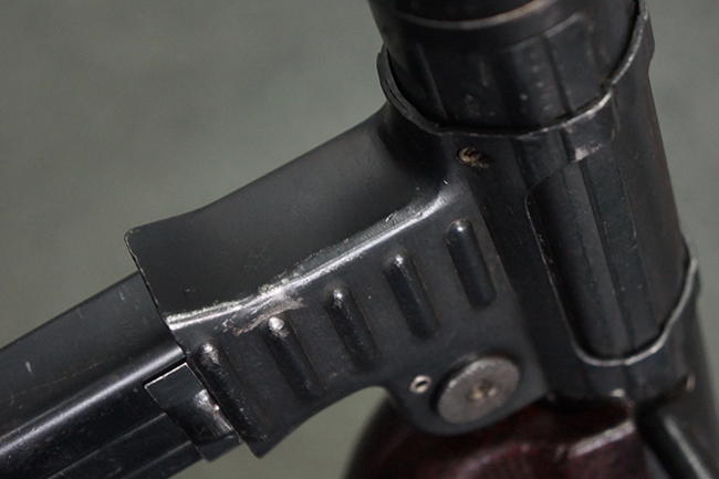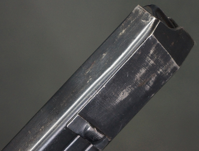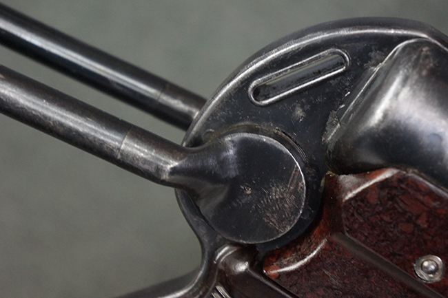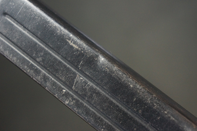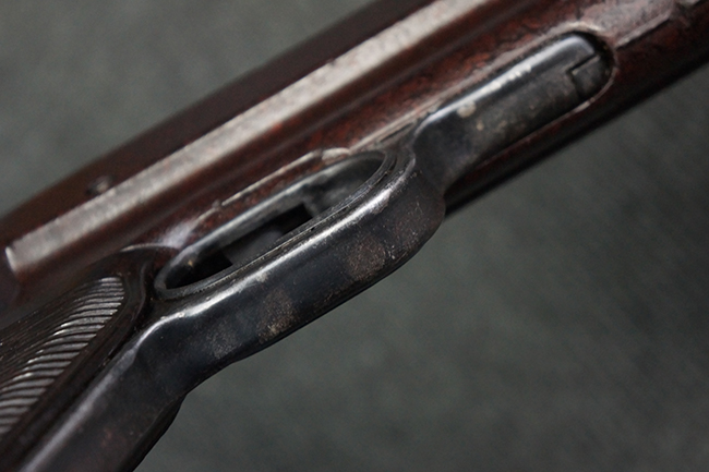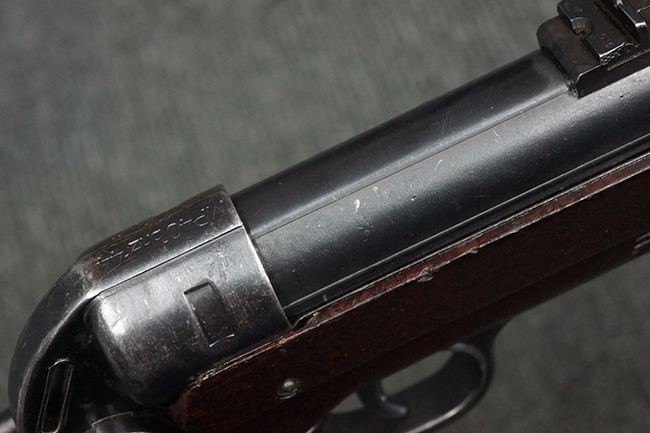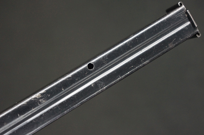 本品の機関部や銃身といった金属部はやや打ち傷や擦れの他、一部に表面錆痕や仕上げが落ちて金属の地肌が表れている箇所が見られるものの、現状目立った欠損等は見受けられません。 樹脂製のハンドガードやグリップ・パネル、バレル・レストについても、やや打ち傷や線傷、若干の摩耗は見られるものの、大きな破損等は見られず、比較的良好な状態が保たれています。 アッパー・レシーバーとロア・レシーバーの取り付けについてはやや遊びが見られ、マガジン・ハウジングにも若干のがたつきが見られます。 マガジンの着脱やリア・サイトの切り替え、ストックの展開・折り畳み操作については問題なく行う事が可能です。 マガジンは取り付け時に前後にやや遊びが見られますが、固定自体はしっかりとしています。 ストックは展開時及び折り畳み時にやや遊びが見られます。 付属のマガジンには「MP38 u 40」及び1942年Frank'sche Eisenwerke AG製を示す「bte 42」の刻印が入っており、やや打ち傷や擦れ、経年による褪色の他、一部にアタリや仕上げが薄くなり金属の地肌が表れている箇所が見られます。 尚、マガジン・スプリングは入っています。