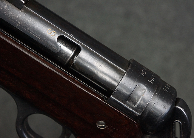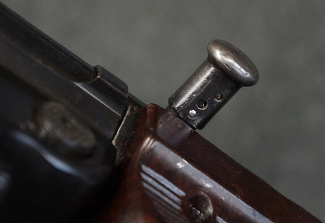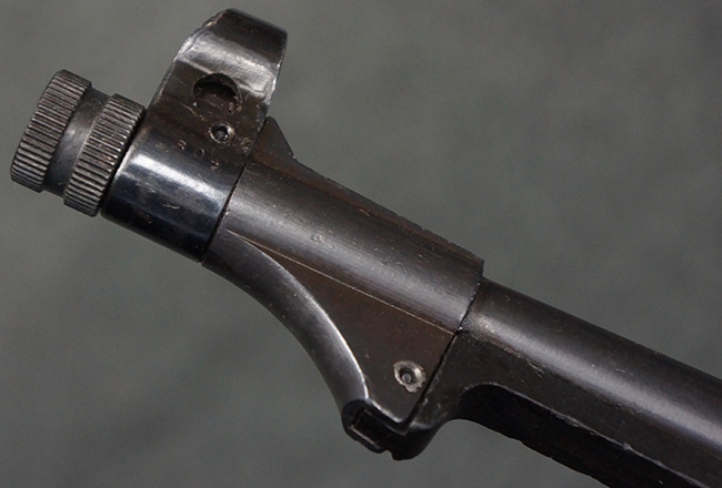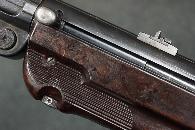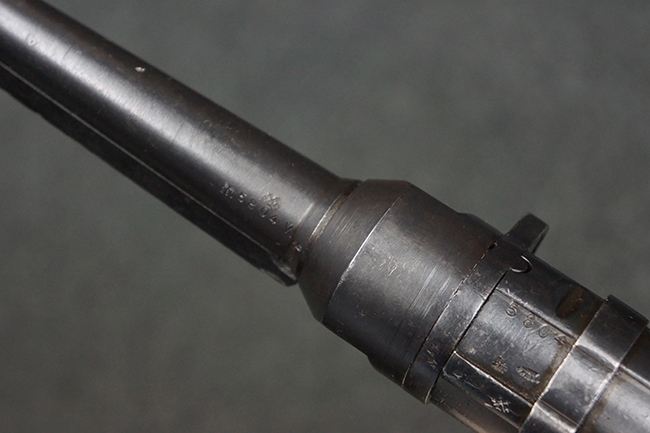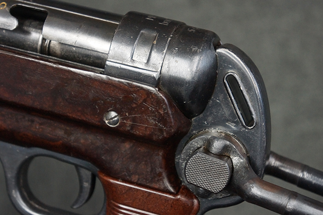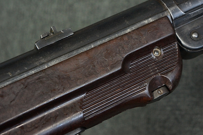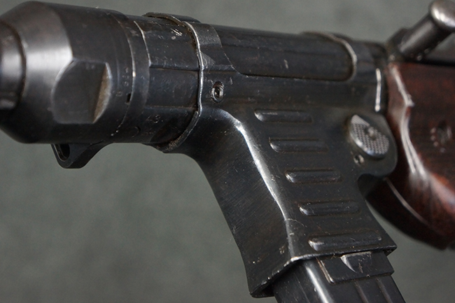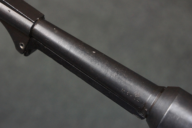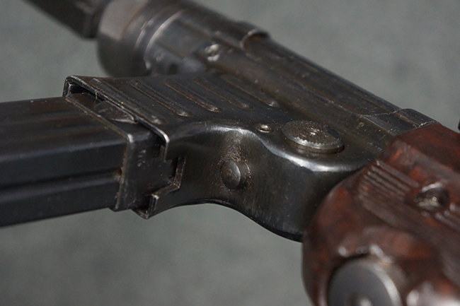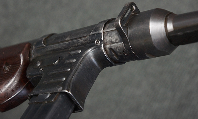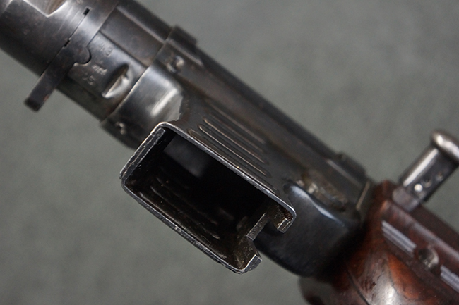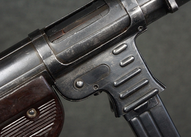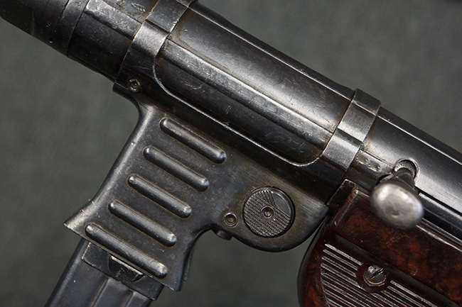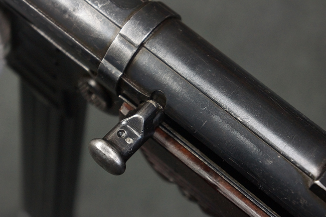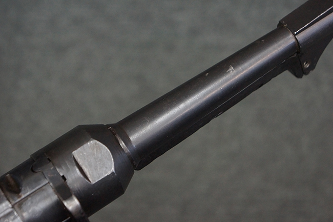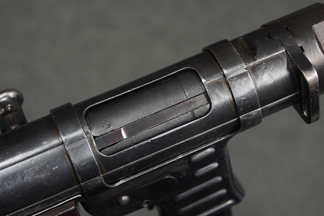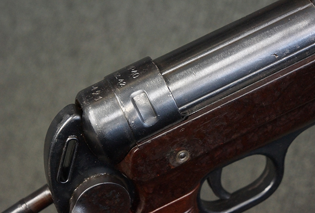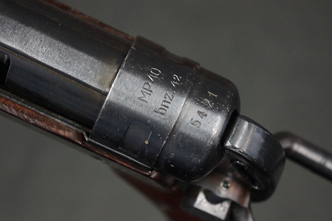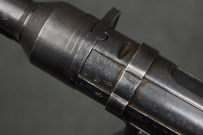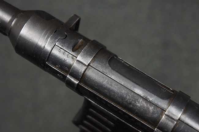 本品のレシーバー・エンド・キャップ上面には「MP40」のモデル名及び1942年ステアー社製を示す「bnz. 42」の刻印が入っています。 マガジン・ハウジングは両面に5本の強化リブが追加されたタイプとなっています。 シリアルNo.はアッパー・レシーバー、銃身、バレル・ナット、リア・サイト、フロント・サイト・ガードが5(804)Vでマッチしており、リコイル・スプリング・チューブが323となっています。 グリップ及び折り畳みストックのシリアルNo.は現状確認出来なくなっています。 尚、アッパー・レシーバーにはMerz-Werke Gebr社を示す「cos」のサブ・コントラクター刻印及び1943年製を示す「43」の刻印が確認出来ます。 グリップ・フレームはプレス製で一体製造したものを左右貼り合わせたタイプで、トリガー・ガードも従来型と比べてより厚みのある形状となっています。 マズル・リングは後期型の中央に溝のあるH型、バレル・ナットは平面部分が2箇所のみのタイプ、バレル・レストは樹脂製となっており、コッキング・ハンドルは1942年半ば以降に本格的に導入されたボルト・セーフティ機能を備えた2ピース・タイプが装備されています。