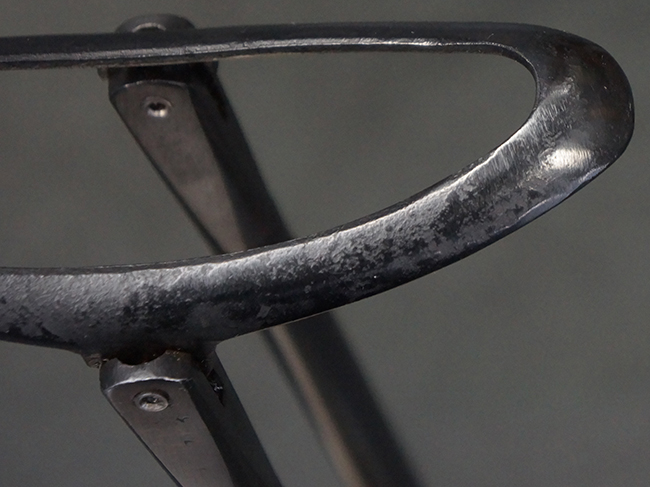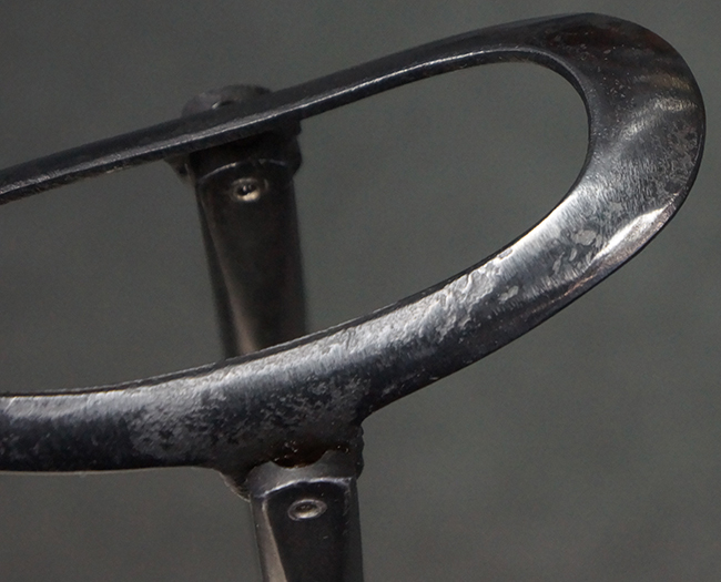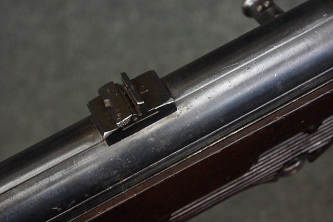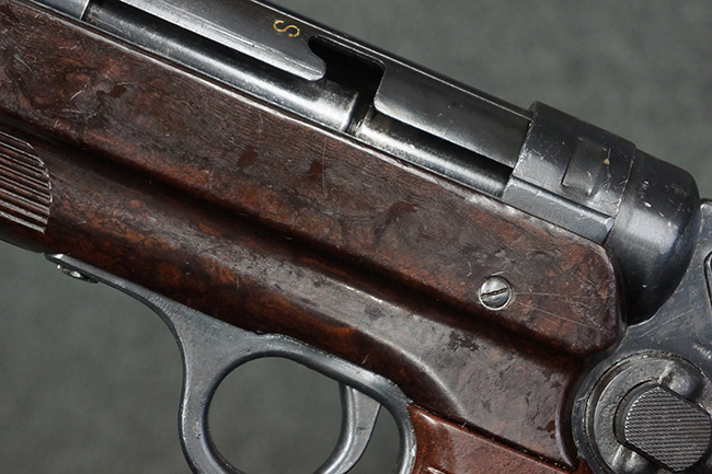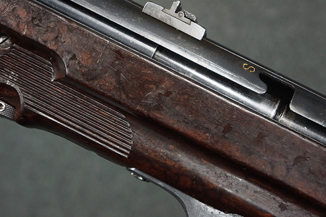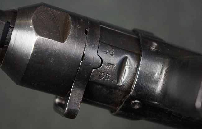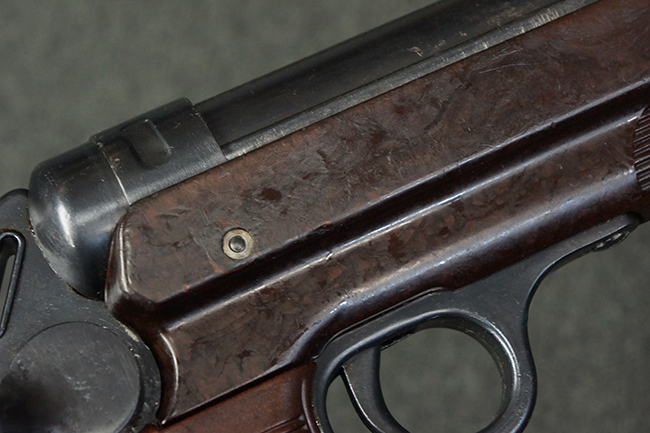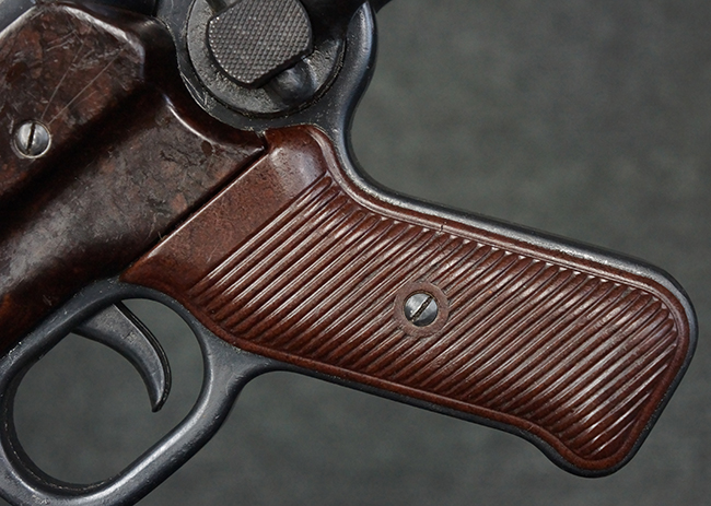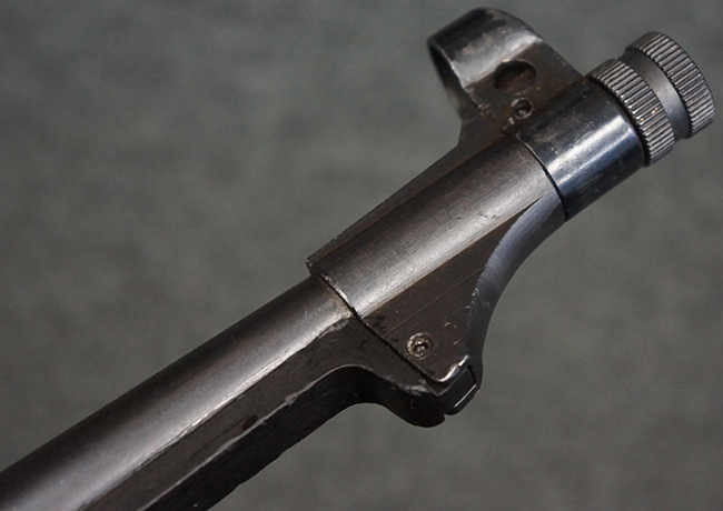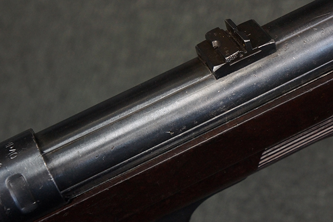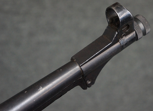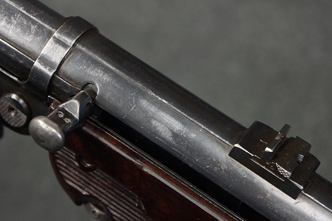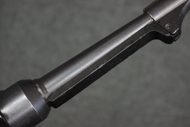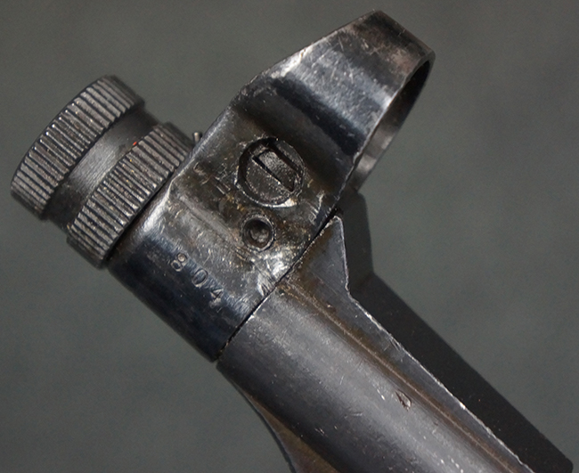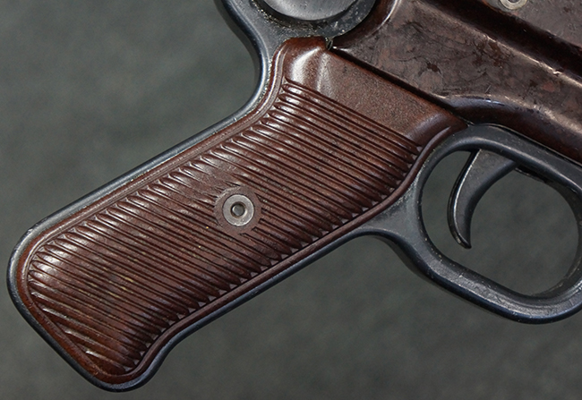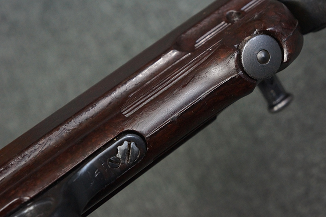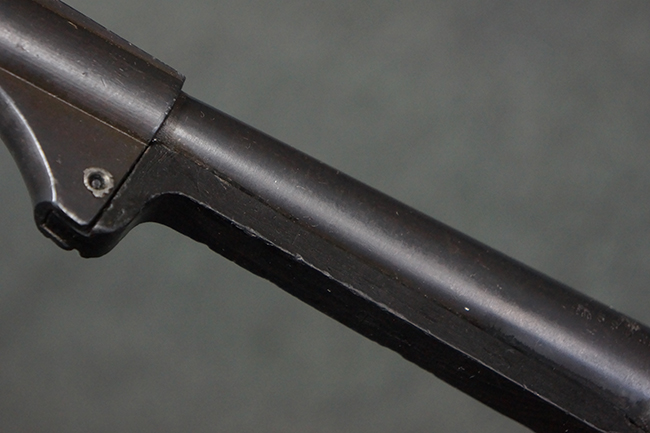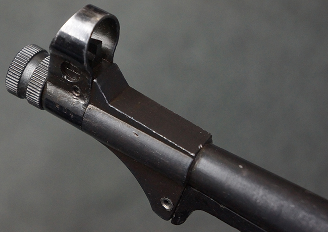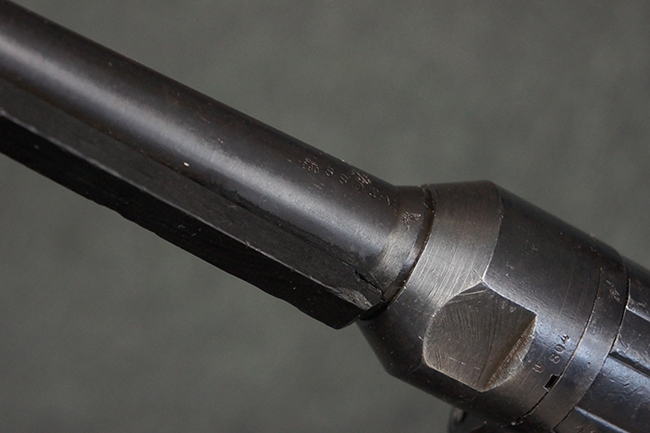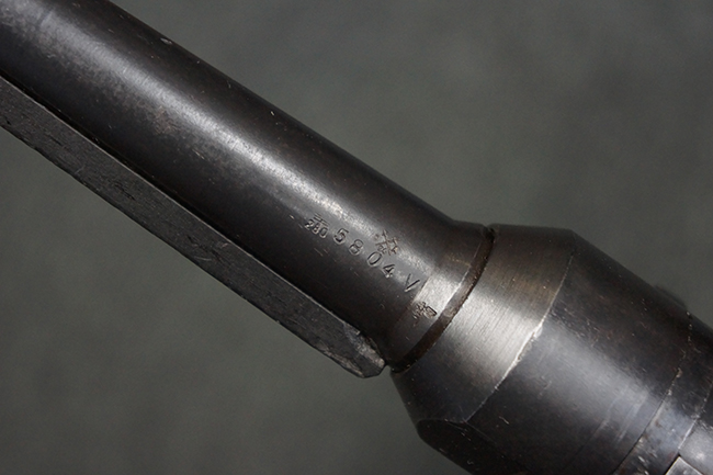 本品のレシーバー・エンド・キャップ上面には「MP40」のモデル名及び1942年ステアー社製を示す「bnz. 42」の刻印が入っています。 マガジン・ハウジングは両面に5本の強化リブが追加されたタイプとなっています。 シリアルNo.はアッパー・レシーバー、銃身、バレル・ナット、リア・サイト、フロント・サイト・ガードが5(804)Vでマッチしており、リコイル・スプリング・チューブが323となっています。 グリップ及び折り畳みストックのシリアルNo.は現状確認出来なくなっています。 尚、アッパー・レシーバーにはMerz-Werke Gebr社を示す「cos」のサブ・コントラクター刻印及び1943年製を示す「43」の刻印が確認出来ます。 グリップ・フレームはプレス製で一体製造したものを左右貼り合わせたタイプで、トリガー・ガードも従来型と比べてより厚みのある形状となっています。 マズル・リングは後期型の中央に溝のあるH型、バレル・ナットは平面部分が2箇所のみのタイプ、バレル・レストは樹脂製となっており、コッキング・ハンドルは1942年半ば以降に本格的に導入されたボルト・セーフティ機能を備えた2ピース・タイプが装備されています。