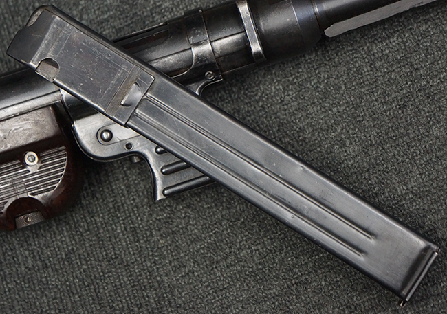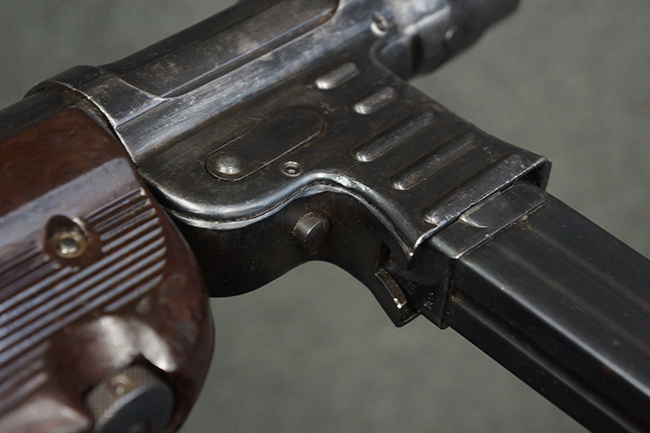 MP40のバリエーションの内、1941~1942年頃にエルマ社、ステアー社、ハーネル社で製造されたタイプは、マガジン・ハウジングの両側面に5本の強化リブが追加されているのが特徴で、これ以降に製造されたタイプでは全てマガジン・ハウジング表面にリブが追加されるようになりました。 グリップ・フレームは初期型と同様に前後二分割でプレス成型したものを溶接で組み合わせて製造されています。コッキング・ハンドルについては、1942年6月以降フォワード・ロック・セーフティ機能を備えたタイプの生産が本格的に開始された為、セーフティ機能付きのコッキング・ハンドルが付いた個体と初期型のフック型コッキング・ハンドルが付いた個体の両方が存在します。
