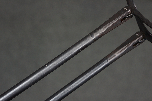 MP38ではレシーバーを無垢の鉄材からの削り出しで製作していた他、グリップ・フレームが鋳造アルミ合金製でしたが、MP40では生産性を向上させるためにレシーバー及びグリップ・フレームに鋼板プレス加工を採用しました。 これにより製造工程が簡略化された他、ドイツ国内で調達が難しかったアルミニウムの節約にも繋がりました。 また、MP38ではマガジンに弾薬を装填した状態で銃を後部から落下させた際に、ボルトが前進位置から跳ね上がって暴発する危険性がありましたが、1940年後半にドイツの銃器設計者ヒューゴ・シュマイザーによってコッキング・ハンドルを内側に押し込む事によりボルトを閉鎖位置で固定するフォワード・ロック・セーフティが開発されました。 このセーフティ機能を備えた新たな2ピース型のコッキング・ハンドルは、1942年半ば以降に製造されたMP40から本格的に装備されるようになりました。