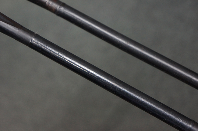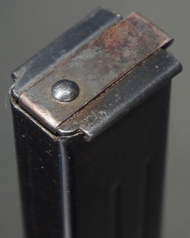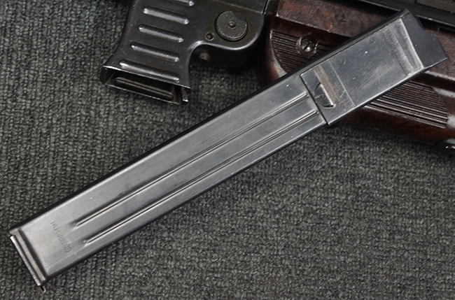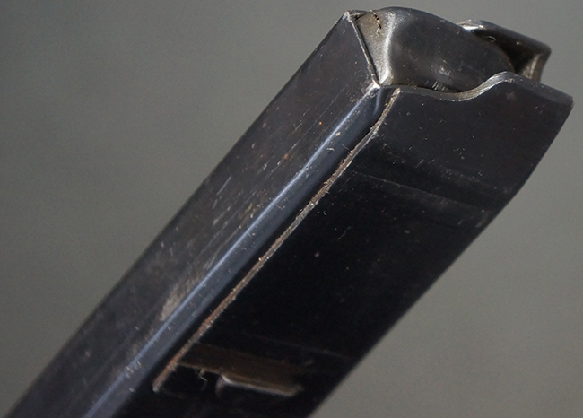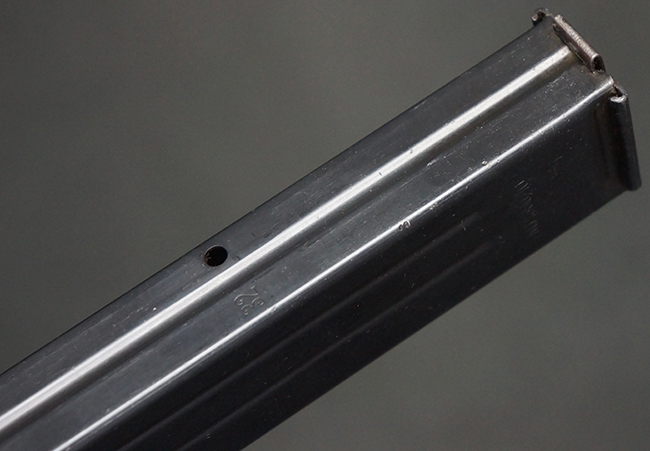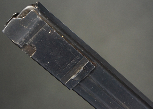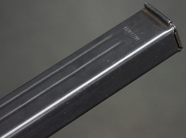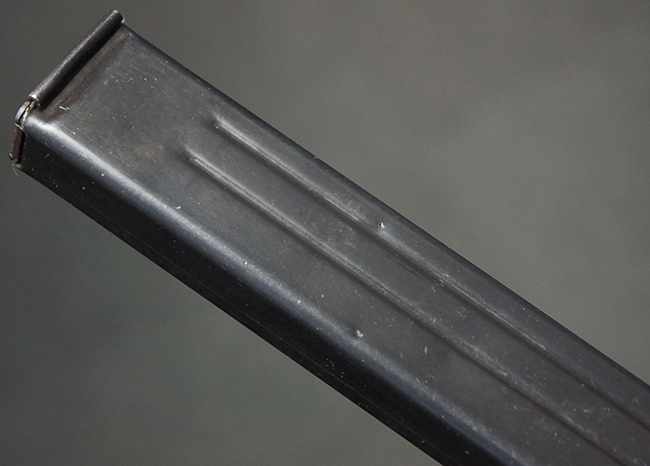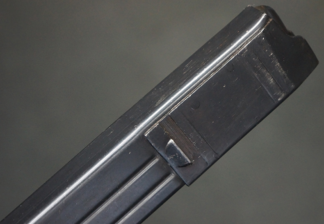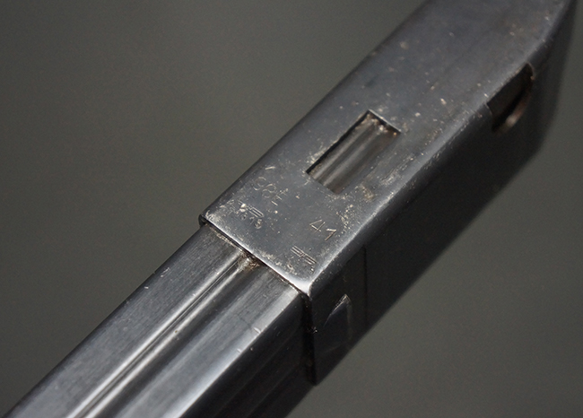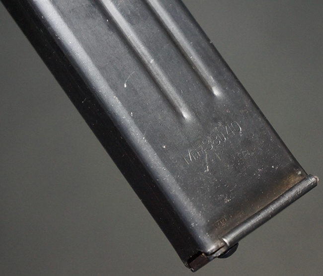 本品の機関部や銃身といった金属部はやや打ち傷や擦れの他、一部に表面錆痕が見られるものの、現状目立った欠損等は見受けられず、オリジナルのブルー仕上げも比較的残っています。 樹脂製のハンドガードやグリップ・パネル、バレル・レストについても、やや打ち傷や線傷は見られるものの、大きな破損等は見られず、比較的良好な状態が保たれています。 アッパー・レシーバーとロア・レシーバーの取り付けについては僅かな遊びは見られるものの、殆ど気にならないレベルのものです。 マガジンの着脱やリア・サイトの切り替え、ストックの展開・折り畳み操作については問題なく行う事が可能です。 マガジンは取り付け時に前後に僅かに遊びが見られますが、十分許容レベルで、固定もしっかりとしています。 ストックは展開時及び折り畳み時の遊びも比較的少なく、ロックもしっかりと掛かります。 付属のマガジンには「M.P.38 u. 40」及びステアー社で1941年に製造された事を示す「98E 41」の刻印が入っており、若干の打ち傷や擦れ、一部表面錆痕が見られるものの、大きな凹みや変形は見られず、概ねしっかりとした状態が保たれています。 尚、マガジン・スプリングは入っています。