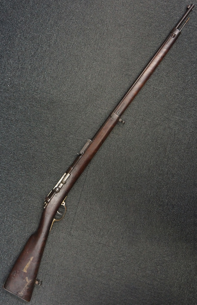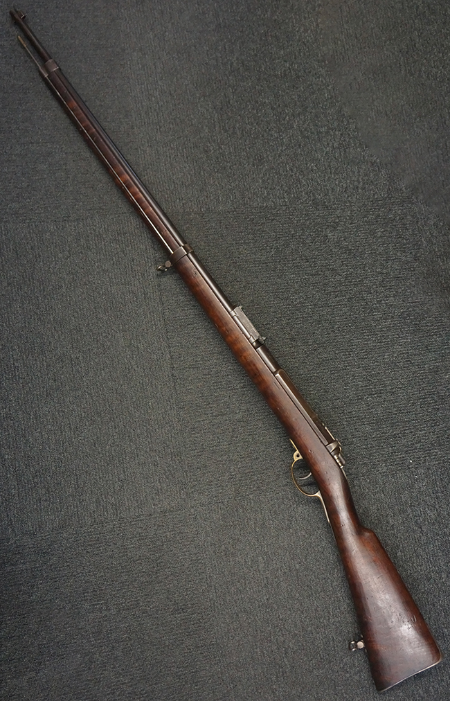 ベースとなったモーゼル Gew.71 (Gewehr 71) は、パウル・モーゼルとヴィルヘルム・モーゼルのモーゼル兄弟が開発し、ドイツ軍が最初に採用した金属製薬莢式の弾薬を使用する小銃で、1871年にプロシア陸軍制式となりました。 1871年の普仏戦争 (1870-1871年) ではプロイセン王国がフランスに勝利しましたが、主力小銃は30年近く前に制式となったドライゼ小銃で、新型小銃の配備が急務となっていました。 普仏戦争の勝利と同時にドイツ帝国統一が成し遂げられ、モーゼル Gew.71 小銃はバイエルン王国を除く全ドイツ諸国の制式小銃となりました。 ドイツ統一後もバイエルン王国は独自のM1869 ウェルダー 歩兵銃を装備しており、1877年になって初めてGew.71 小銃を制式としました。 Gew.71 小銃のボルトを90度回転させて閉鎖する方法は、近代ボルト・アクション・ライフルの基となり、元祖ボルト・アクションと呼ばれることもあります。 Gew.71 小銃はAmberg、Danzig、Spandauといった王立造兵廠で製造されました。 口径11mmの黒色火薬仕様の弾薬を使用し、単発という以外は、その後のモーゼル・アクションと基本的な部分で同じシステムです。 また、当初トライアルで検案とされ追加された安全装置は、左右にレバーを反転させて切り替える、所謂モーゼル・アクションのセーフティ・レバーで、このシステムはGew.71 小銃で導入されたものです。 その後1884年には、アルフレート・フォン・クロパチェクによって設計されたチューブ・マガジンを追加する改良が行われ、8連発となりました。 この連発式に改良されたモデルはGew.71/84と呼ばれています。