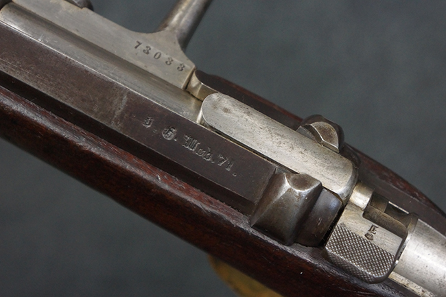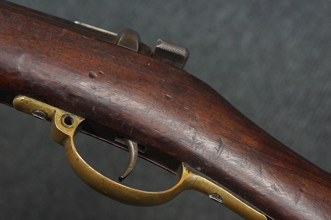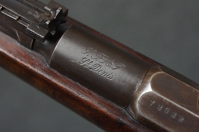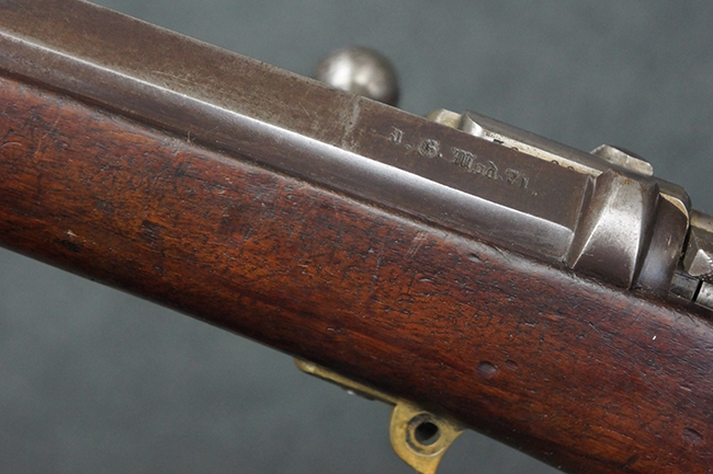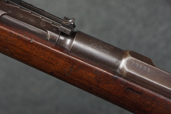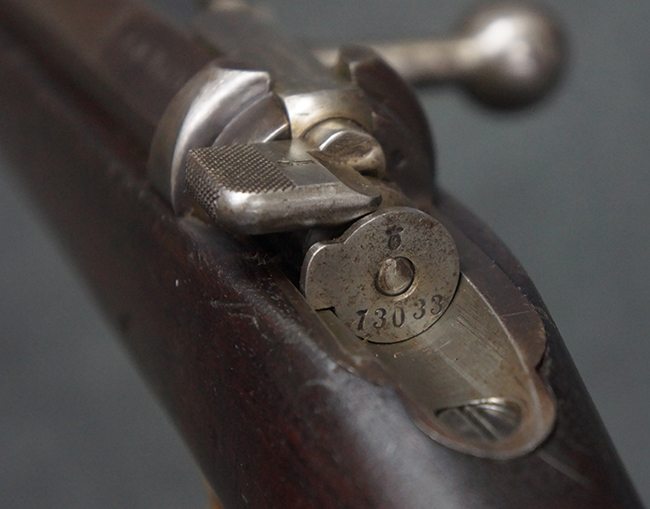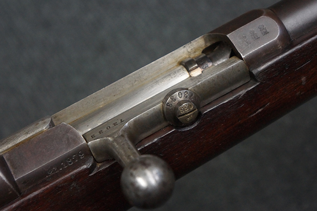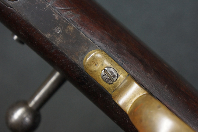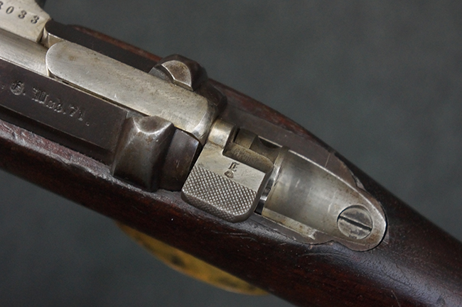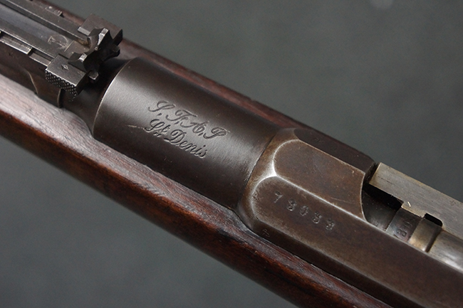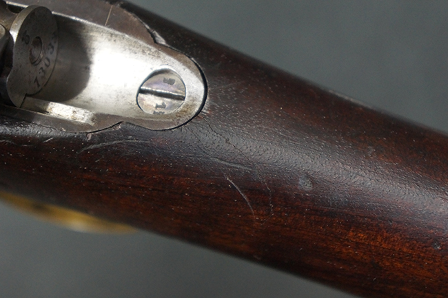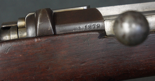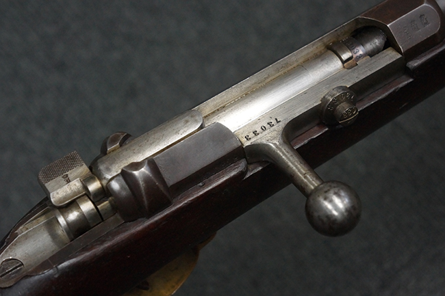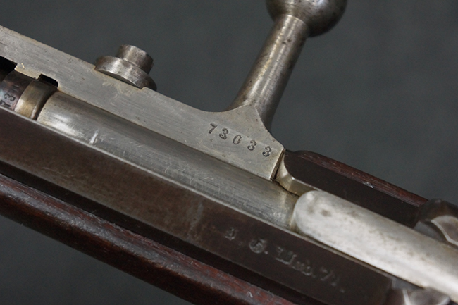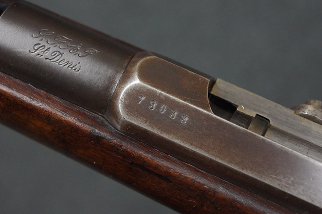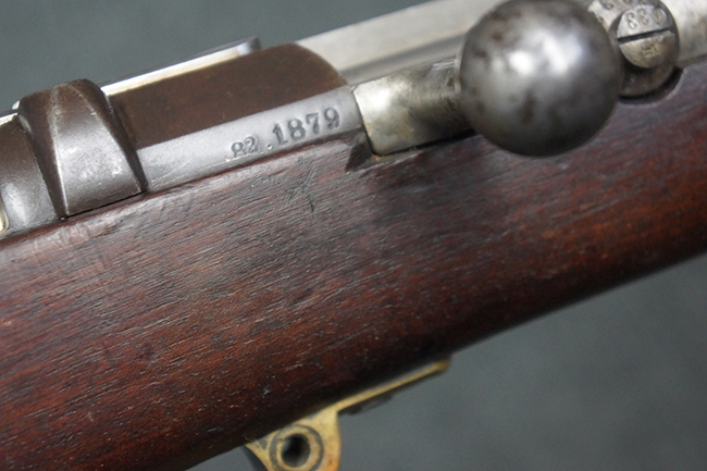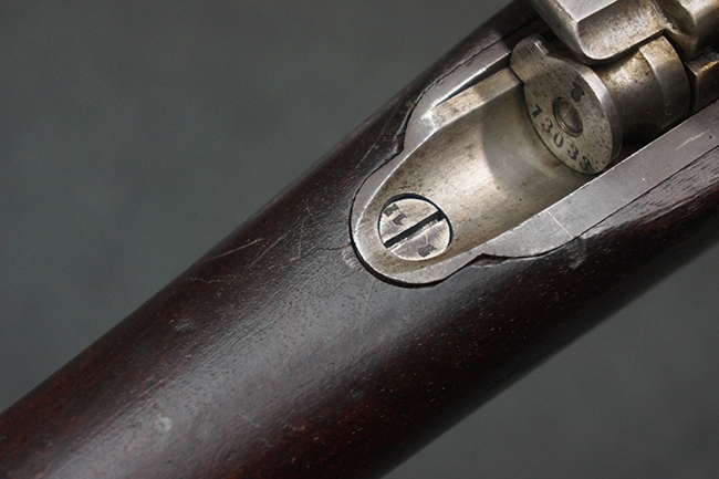 本品の機関部左側面前部にはシリアルNo.73033が打刻されており、後部には「I. G. Mod.71.」のモデル名刻印が打刻されています。 また、銃身基部には改修を行ったSociete Francaise d’Armes Portatives (SFAP) を示す「S.F.A.P St Denis」の刻印が入っています。 機関部右側面前部には王冠とアルファベットを組み合わせた検査刻印が3箇所打刻されており、後部には製造年を示す「1872」の刻印が打刻されています。 製造年の左には「82」の刻印が確認出来ますが、これはおそらく1882年に工廠で再検査もしくは整備が行われた事を示す刻印と思われます。 シリアルNo.は、機関部、ボルト、ボルト・ストップ用ネジ、コッキング・ピース、セーフティが(73)033でマッチしており、バット・プレートは75320となっています。 各部のネジについてはシリアルNo.は異なっています。