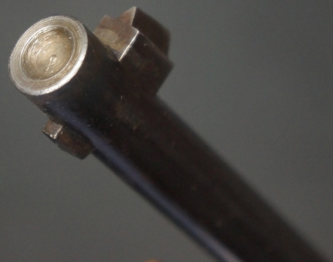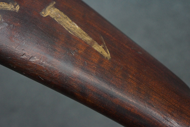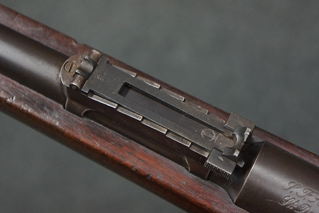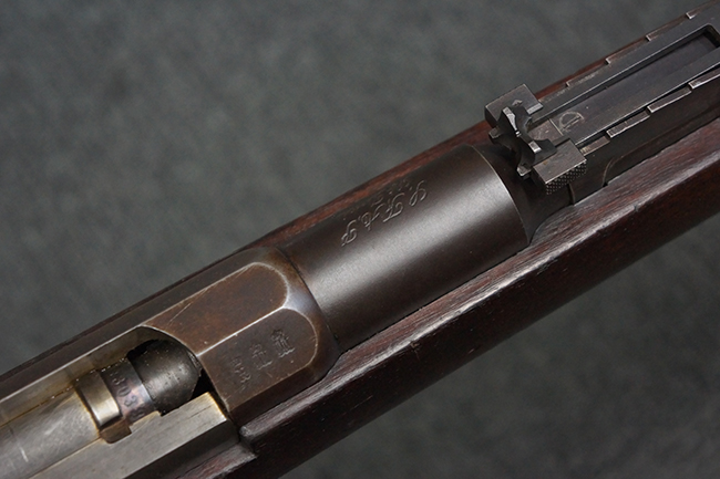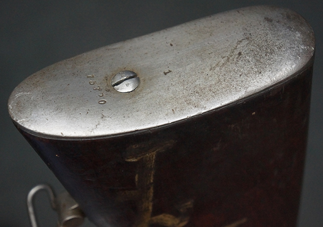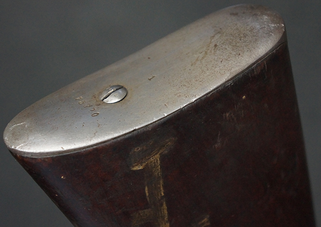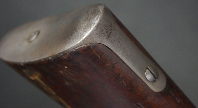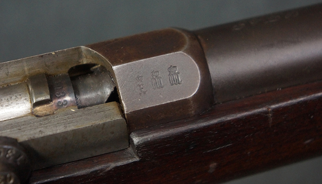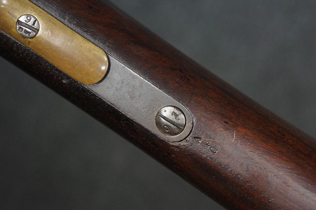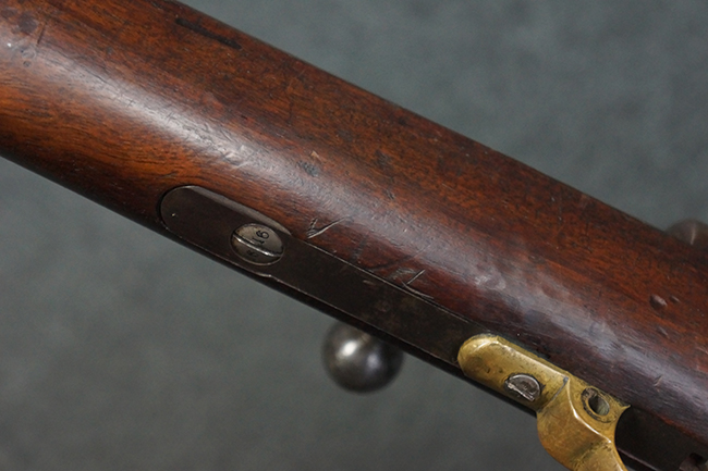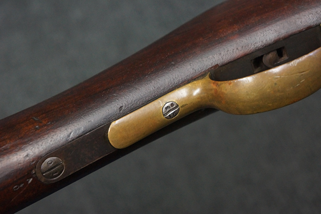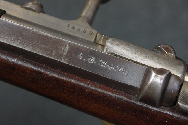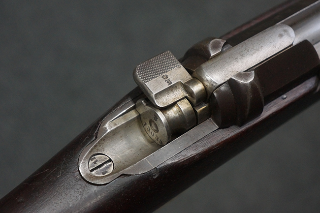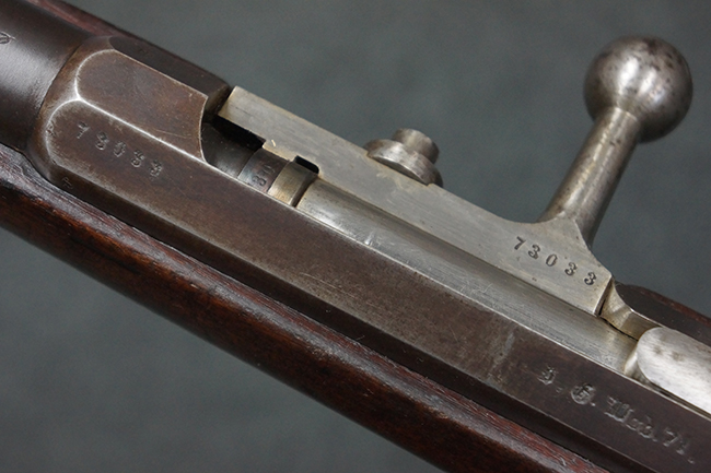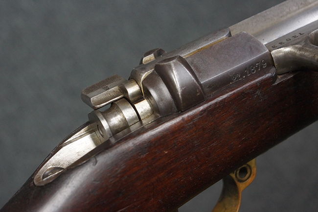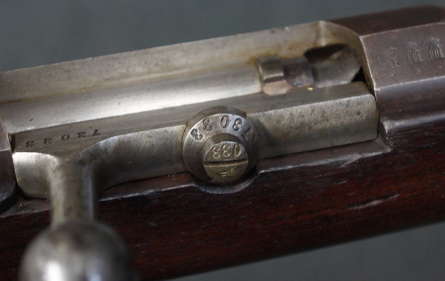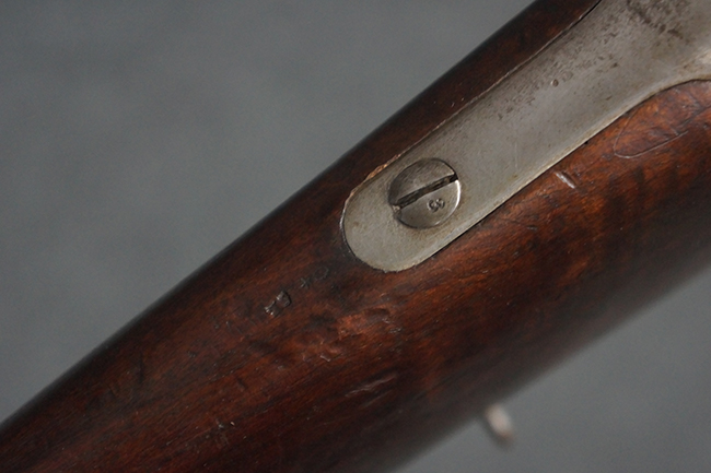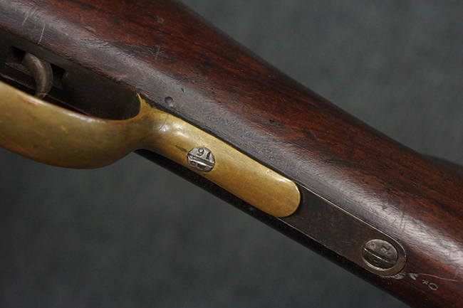 本品の機関部左側面前部にはシリアルNo.73033が打刻されており、後部には「I. G. Mod.71.」のモデル名刻印が打刻されています。 また、銃身基部には改修を行ったSociete Francaise d’Armes Portatives (SFAP) を示す「S.F.A.P St Denis」の刻印が入っています。 機関部右側面前部には王冠とアルファベットを組み合わせた検査刻印が3箇所打刻されており、後部には製造年を示す「1872」の刻印が打刻されています。 製造年の左には「82」の刻印が確認出来ますが、これはおそらく1882年に工廠で再検査もしくは整備が行われた事を示す刻印と思われます。 シリアルNo.は、機関部、ボルト、ボルト・ストップ用ネジ、コッキング・ピース、セーフティが(73)033でマッチしており、バット・プレートは75320となっています。 各部のネジについてはシリアルNo.は異なっています。