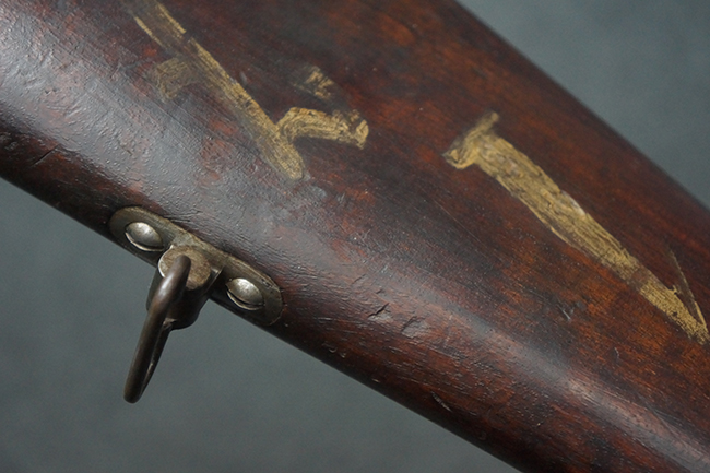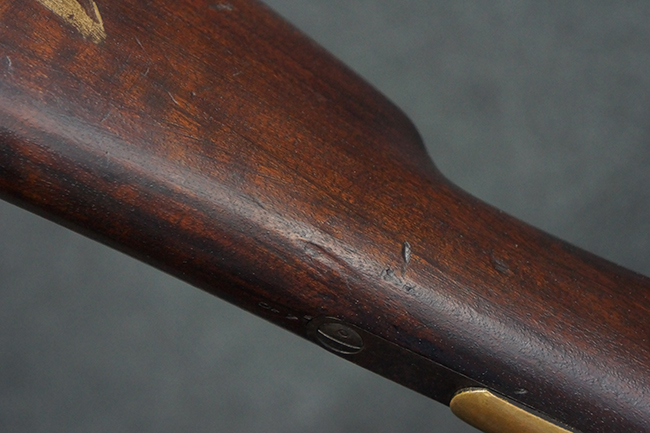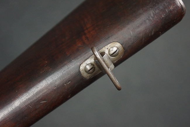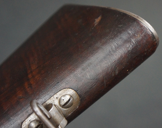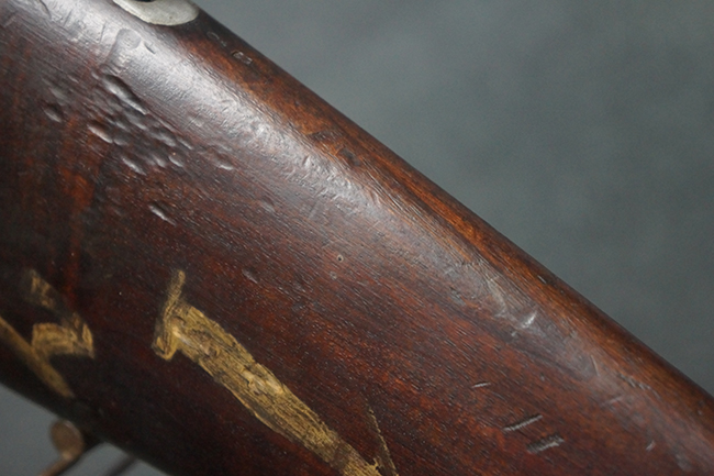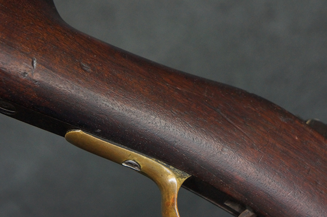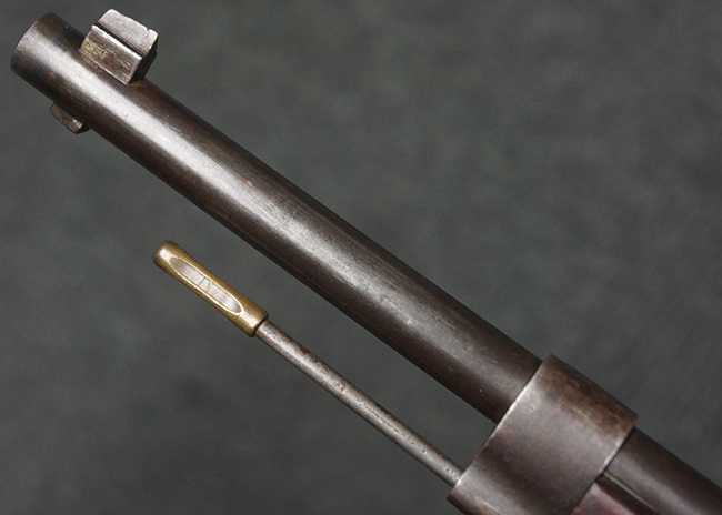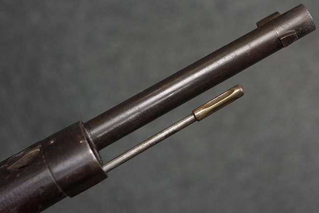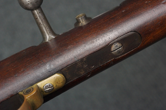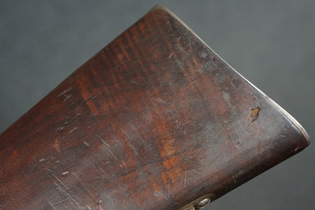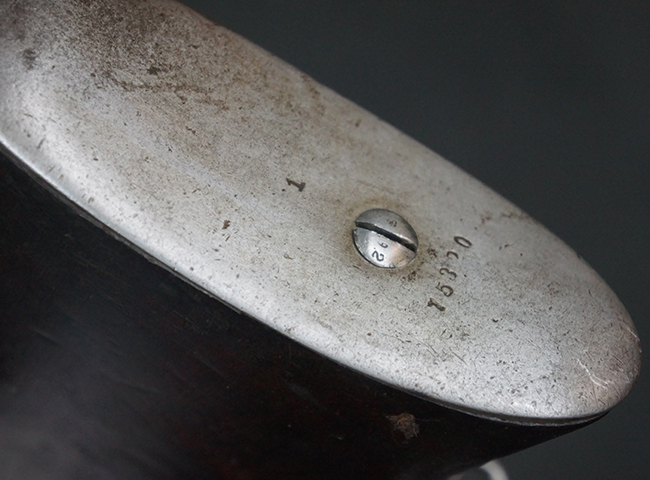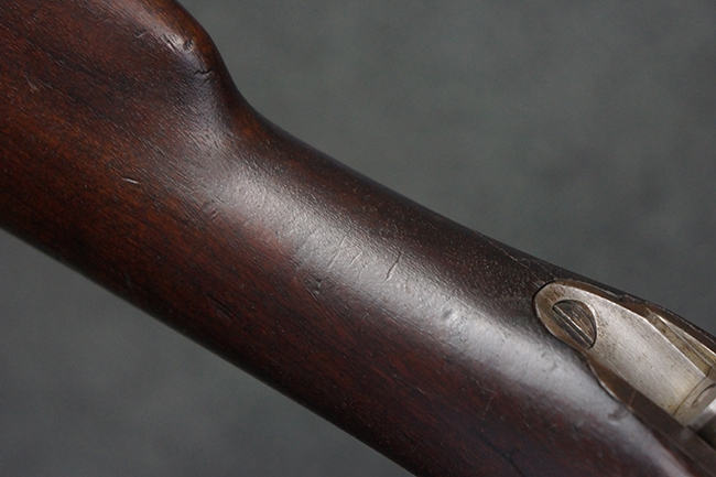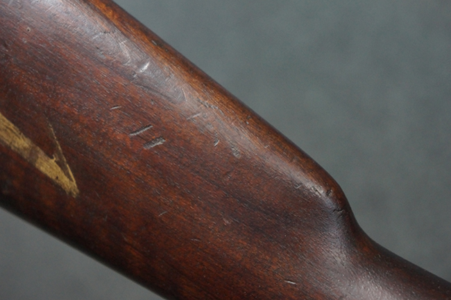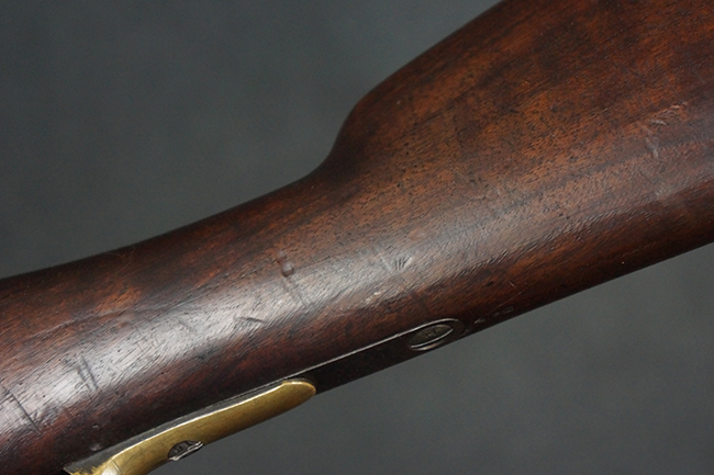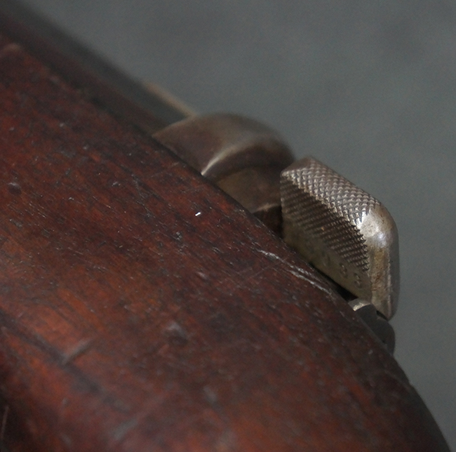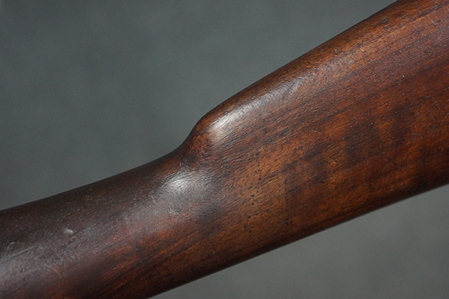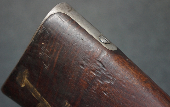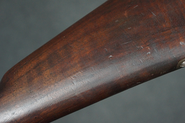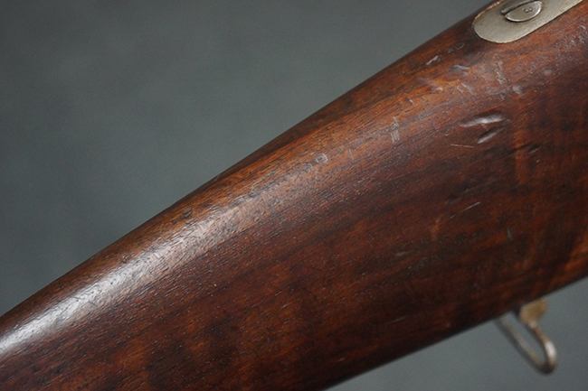 本品は全体に適度な時代が付いた良い雰囲気となっており、銃身や機関部といった金属部は、若干の打ち傷や擦れ、経年による褪色の他、一部表面錆痕は見られるものの、目立った欠損等は見られず、概ねしっかりとした状態が保たれています。 白磨きのボルトについても、やや時代錆は見られるものの、目立った朽ち込み等は見られません。 真鍮製のトリガー・ガードについてもやや打ち傷は見られますが、目立った腐食などは見られず、適度な時代が付いています。 木製銃床については、やや打ち傷や線傷の他、リア・バンド後方の銃床右側面の角などに一部時代の付いた欠けが見受けられ、アッパー・タング後方にあまり目立たないヘアライン・クラックが見られますが、それ以外には大きな破損等は見られず、オリジナルの仕上げも比較的残っています。 バット・ストック右側面には手書きにより17と読める数字が書かれています。 傷み易いバット・プレートについても、若干の時代錆や表面錆痕は見られるものの、目立った変形等は見られず、銃床への取り付けもがたつきもなくしっかりとしています。 リア・サイトの起倒・調整は問題なく行う事が可能です。 クリーニング・ロッドが付属いたします。