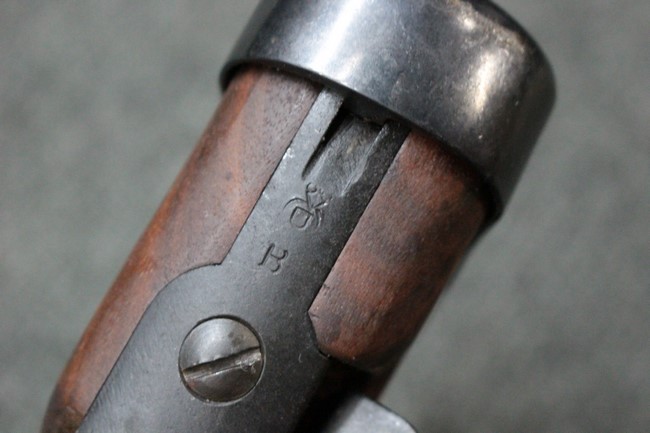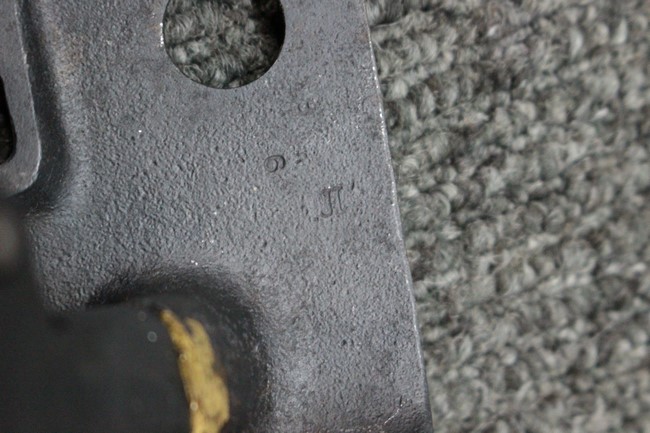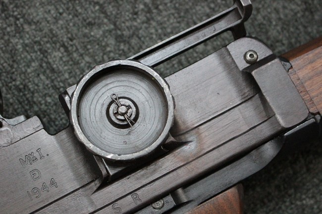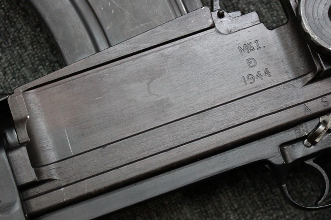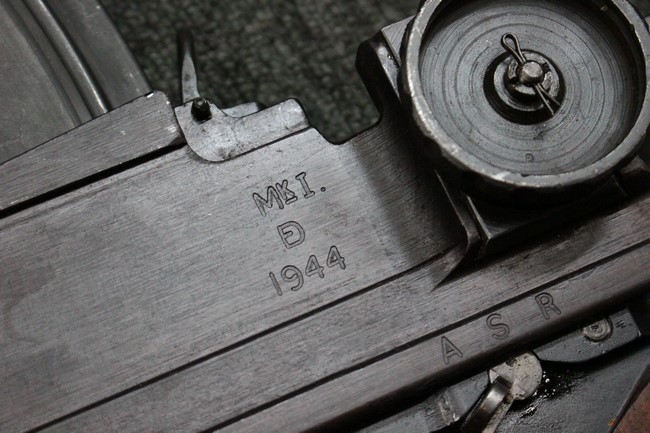 本品のアッパー・レシーバー左側面には「MKI」のモデル名の他、エンフィールド造兵廠 (RSAF=Royal Small Arms Factory, Enfield) を示す「E」と「D」の文字を組み合わせたモノグラムや製造年を示す「1944」の刻印が打刻されています。 本品はバット・ストックにサポート・ハンドルが取付け可能ですが、ショルダー・レストがない戦時型Mk Iタイプです。 二脚は伸縮式のMk Iタイプで、石突部分にはカナダのJohn Inglis社を示す「JI」の刻印が入っています。 なお、銃身のシリアルNo.はFB237となっております。 他にも各部にブロード・アロー刻印が確認出来ます。
