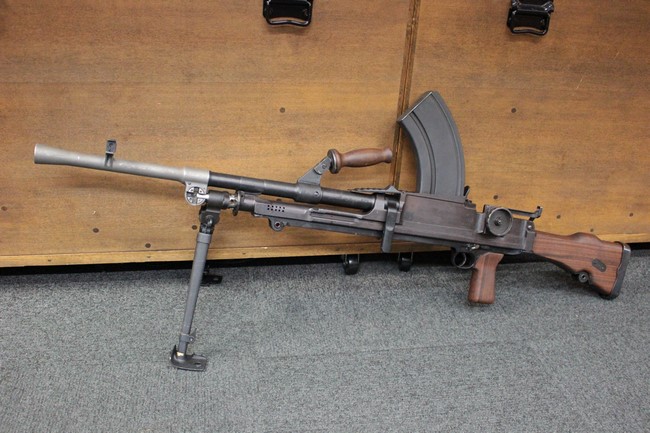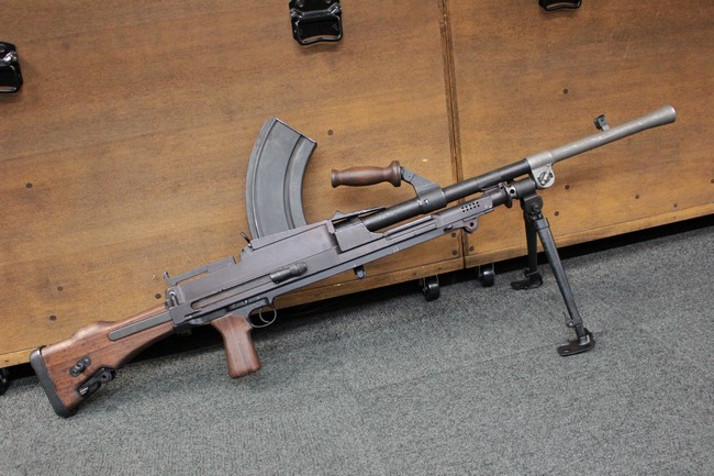 第二次世界大戦で使用された英軍の主要軽機関銃です。 第一次世界大戦後の1920年代、英軍はそれまでの主力軽機関銃であったルイス軽機関銃に代わる新たな軽機関銃のトライアルを開始しました。 1930年代に入るとチェコ製のZB Vz.26の改良型であるZB Vz.27軽機関銃 (後に更なる改良型のZB Vz.30軽機関銃) を新たに候補に加えてトライアルが続けられ、最終的にはこのZB系軽機関銃に改良を加えた物がブレン軽機関銃 (ブレンガン) として英軍に制式採用されました。 ブレン (BREN) の名称は、チェコのブルーノ (Brno) 造兵廠と英国のエンフィールド (Enfield) 造兵廠の名称を組み合わせた物です。 ブレン軽機関銃では.303ブリティッシュ弾を使用する事から、マガジンはバナナ型の形状に変更されています。