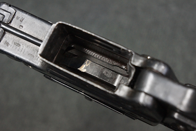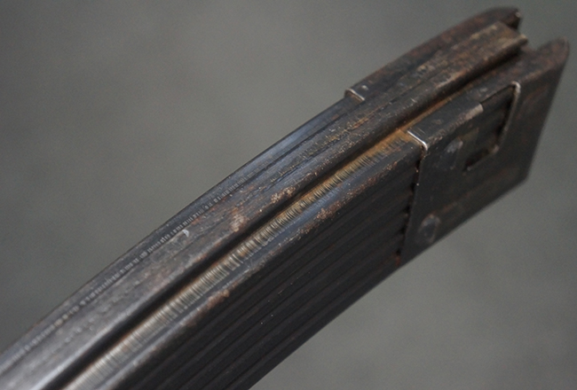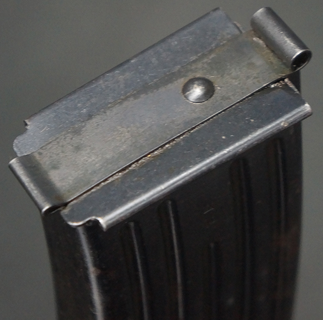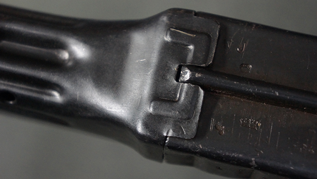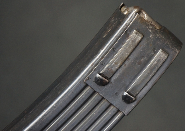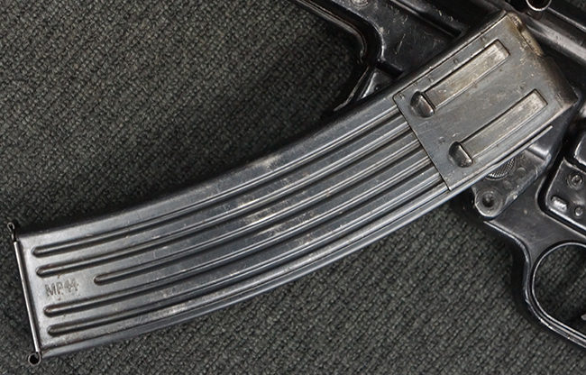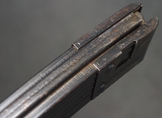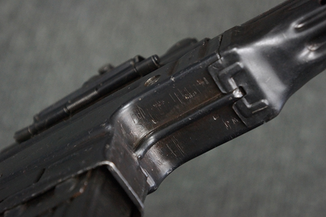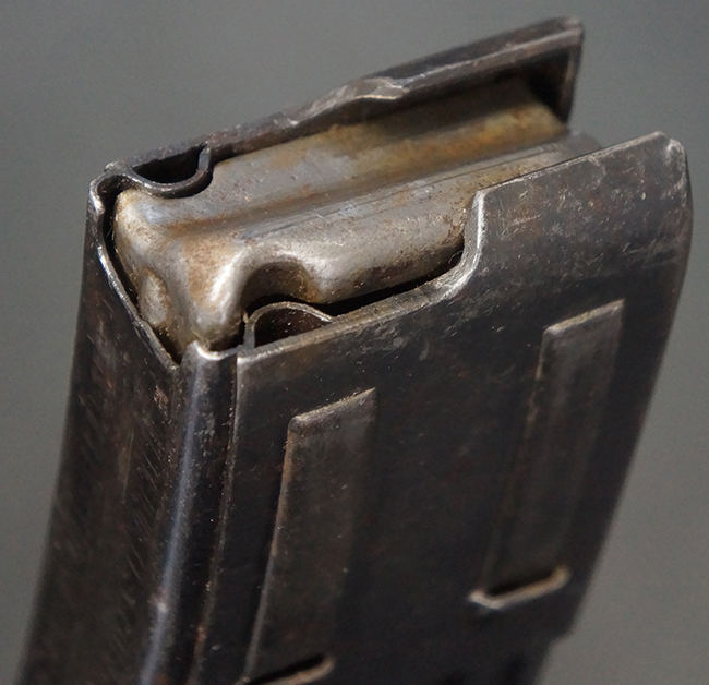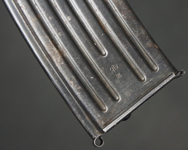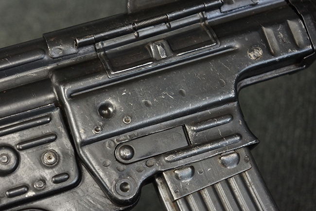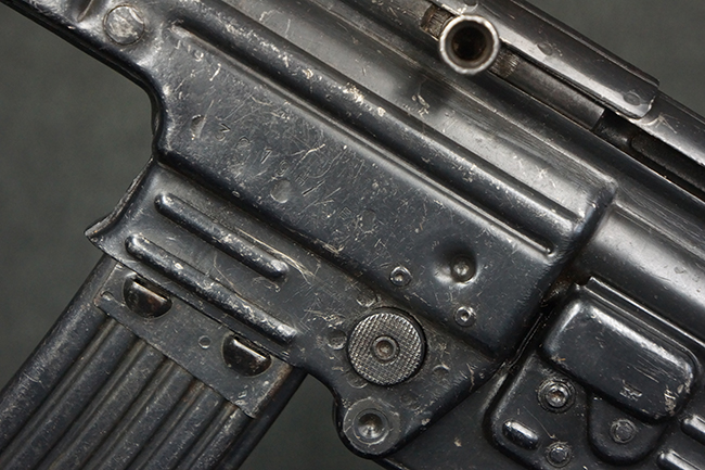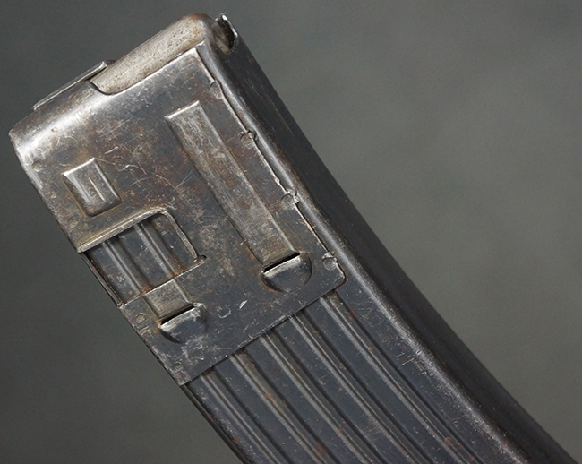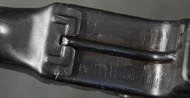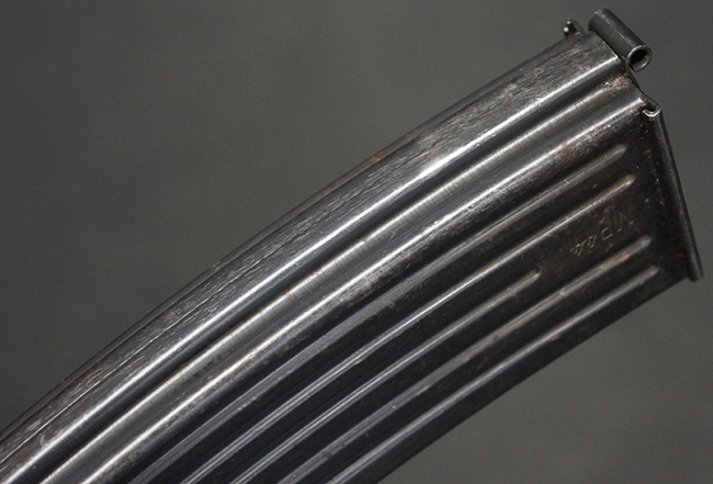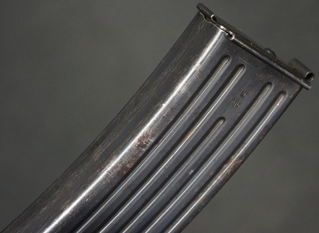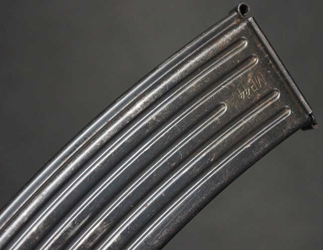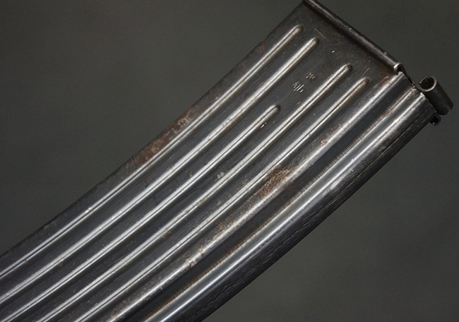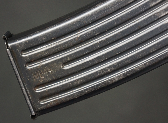 リア・サイトの調整やマガジンの着脱、ダスト・カバーの開閉については問題なく行う事が可能です。 セーフティ・レバーやセレクター・ボタンの切り替えについても問題なく行う事が可能で、セーフティは安全位置でトリガーがロックされます。 マガジン装着時の遊びについても十分許容レベルです。 付属のマガジンには「MP44」のモデル名刻印及び「qlv」のサブ・コントラクター刻印が確認出来ます。 マガジンはやや打ち傷や擦れ、経年による褪色の他、一部表面錆や仕上げが落ちて金属の地肌が現れている箇所が見受けられますが、目立った凹みや変形等は見られず、概ねしっかりとした状態が保たれています。 尚、マガジン・スプリングは入っています。