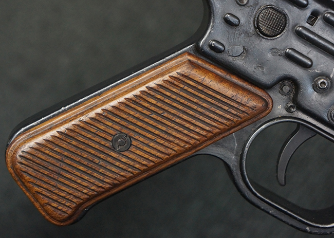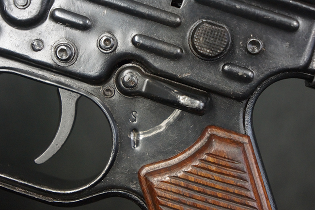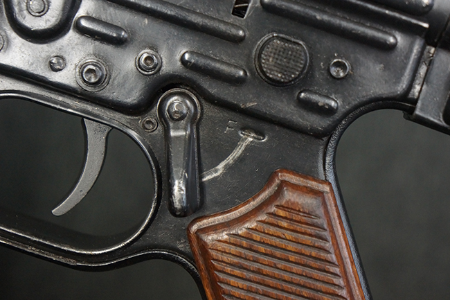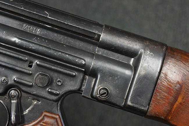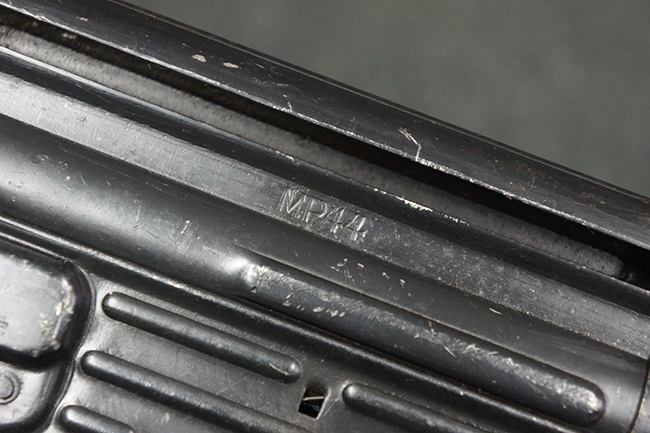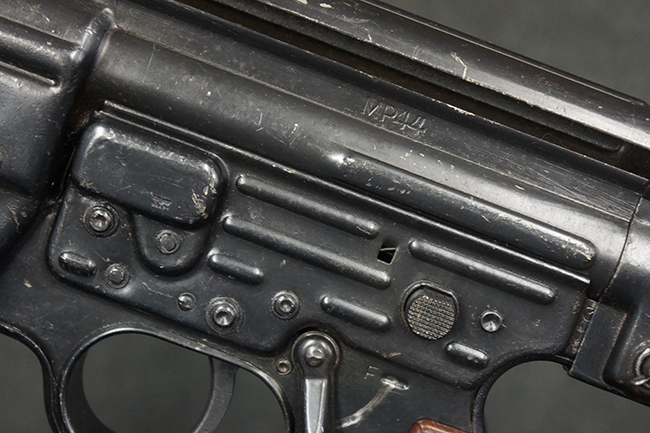 本品のレシーバー左側面には「MP44」のモデル名刻印が入っており、マガジン・ハウジング左側面のシリアルNo.に続いて「/XE」の刻印が入っている事から、本品が1945年に製造された事が判ります。 マガジン・ハウジング前方のレシーバー下面にはステアー社を示す「swj」のメーカー・コードが打刻されており、ハンドガード下部にLux, R. u. O., Metallwaren- und Maschinenfabrik社を示す「aqr」、ガス・プラグにC.G.ハーネル社を示す「fxo」の刻印が確認できます。 その他、各部にアムト刻印も確認できます。 尚、グリップ・フレーム及びバット・ストックのシリアルNo.は3819でレシーバーとマッチしています。 ストック基部は打ち直しにより4581となっています。