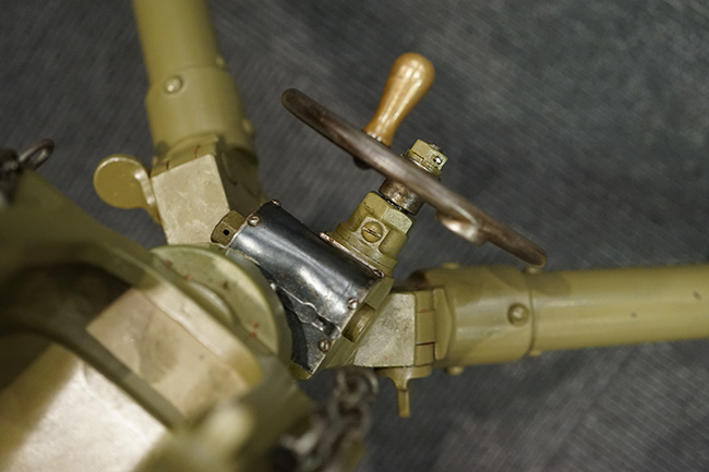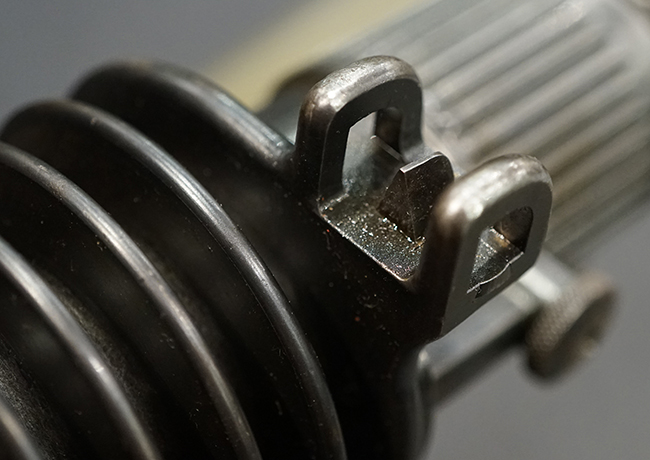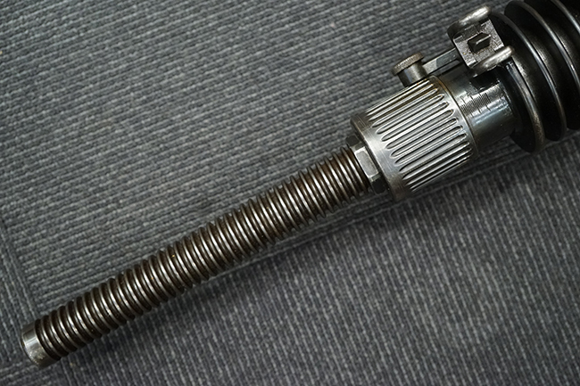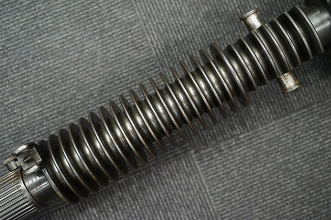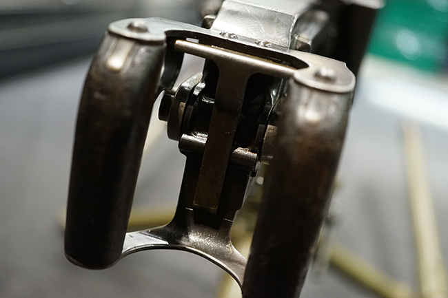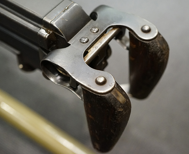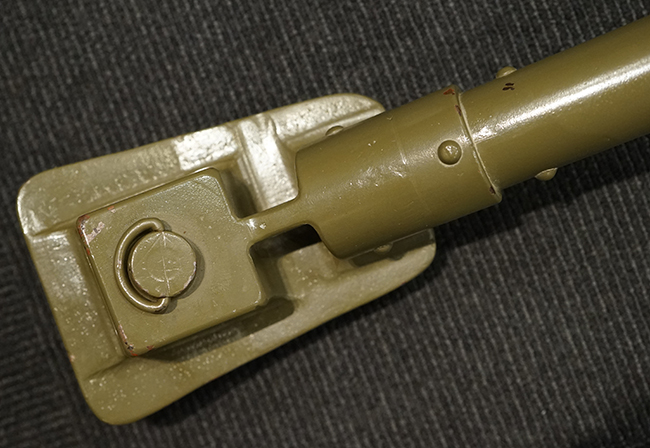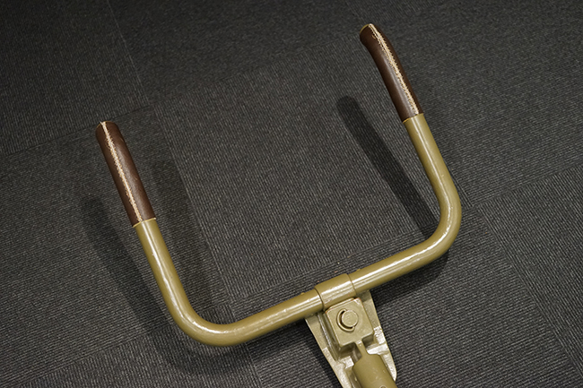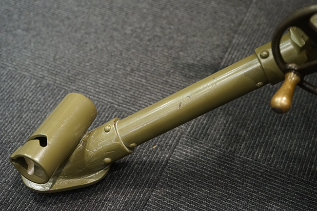 唯一木製部品である把握部(グリップ)はやや傷やひび割れが見られ、向かって左側のグリップは若干のがたつきが有りますが、一方右側はしっかりと固定されており、どちらもすぐに破損してしまう心配は少ない印象です。 コッキング・ハンドルのゴムは失われています。