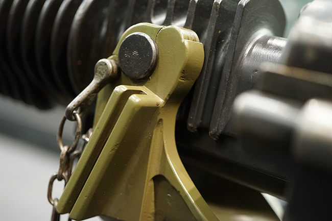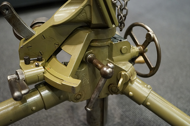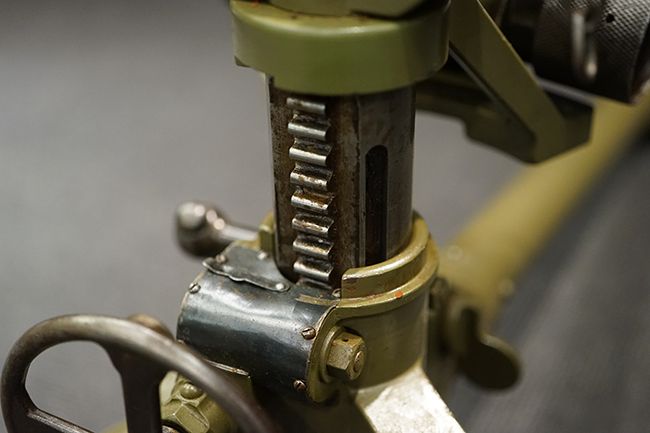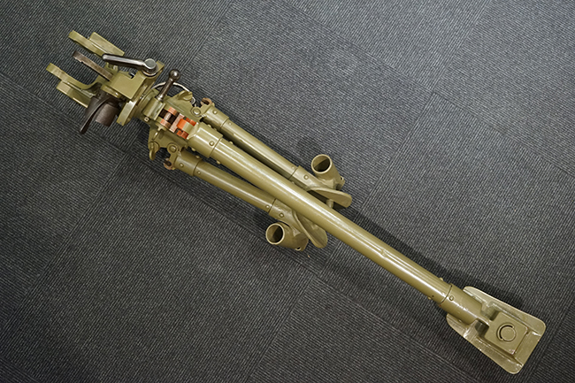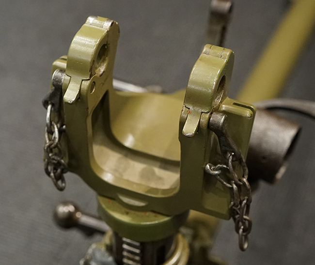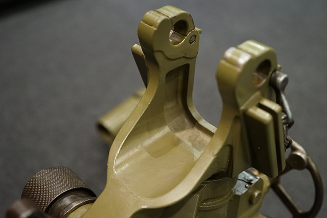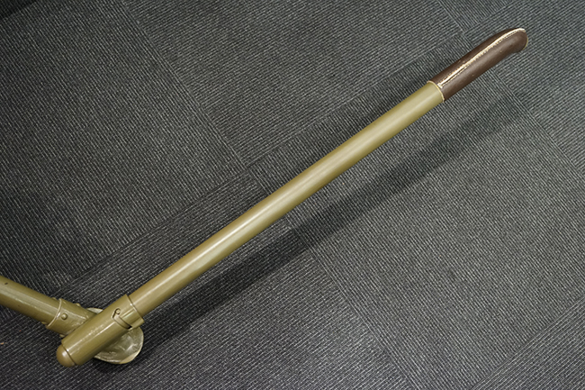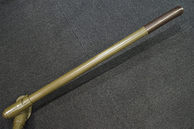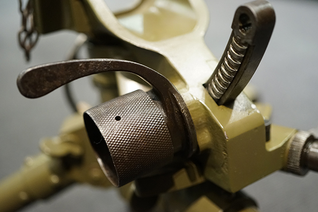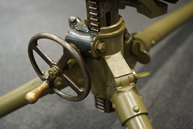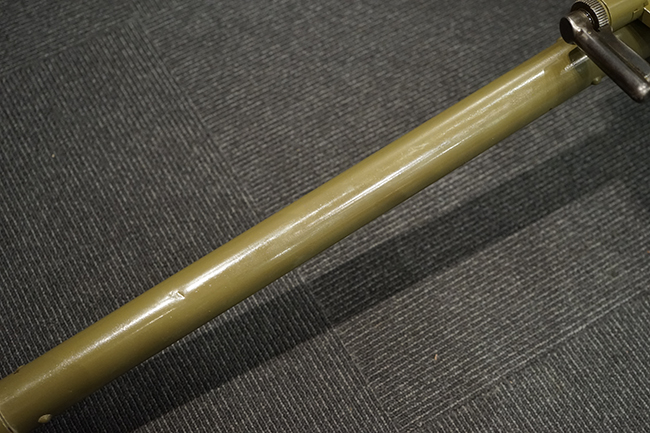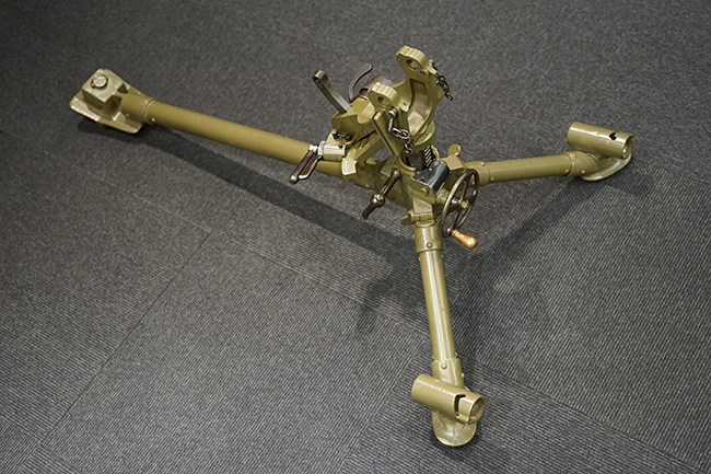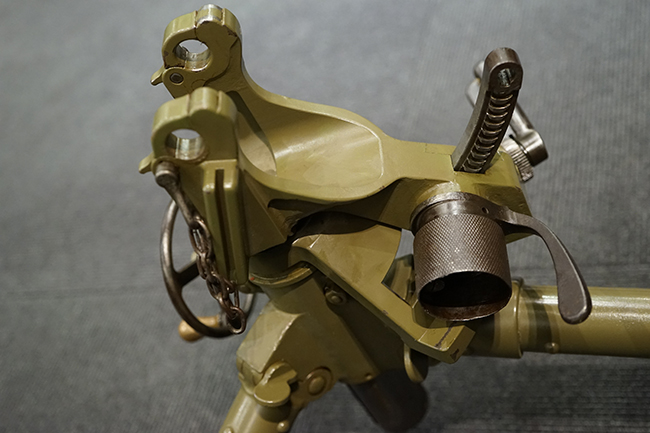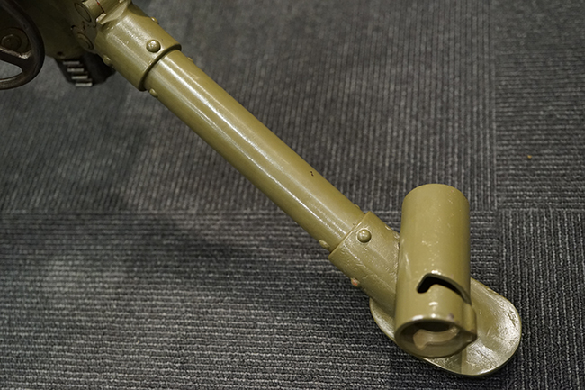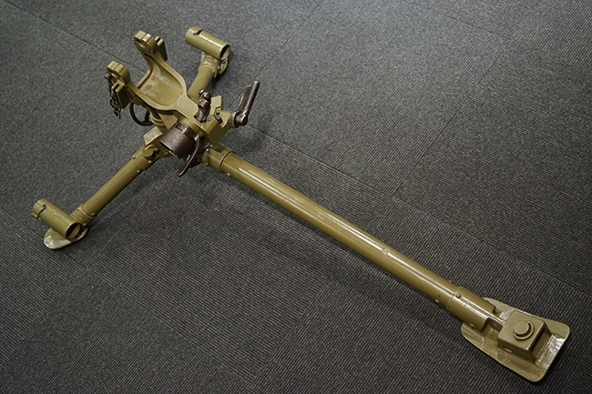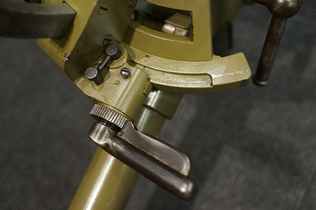 付属の三脚は再塗装が施されており、全体的に綺麗な状態です。 脚の基部には奉天造兵廠の刻印と康2.11 シリアル#269に製造年を示す昭10.11の刻印が見られます。 塗装の僅かな剥落が散見される程度で可動部は地金っぽくなっており経年も感じられますが、各部とも大変スムーズに可動します。 運搬用の前棍と後棍も付属していますがやはり再仕上が施されており、塗膜の下にかつての小傷が窺われますが綺麗な状態となっています。 貼り直したと思われる持ち手の革張りをいたって健全です。 取り付けも問題ありません。