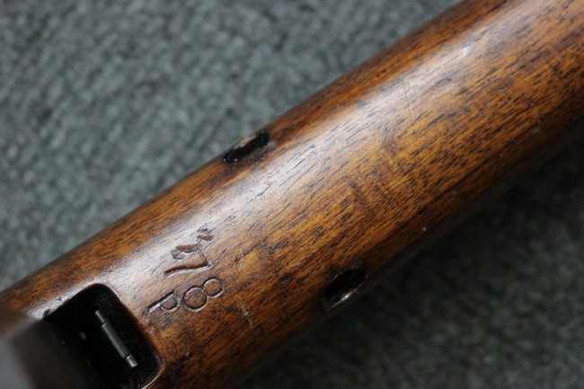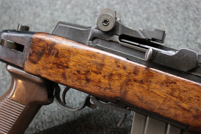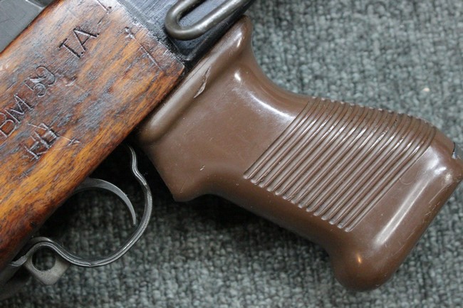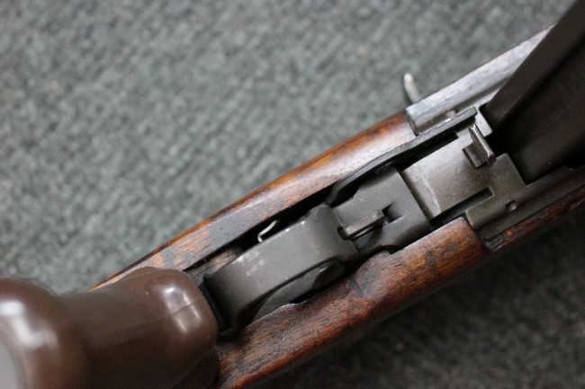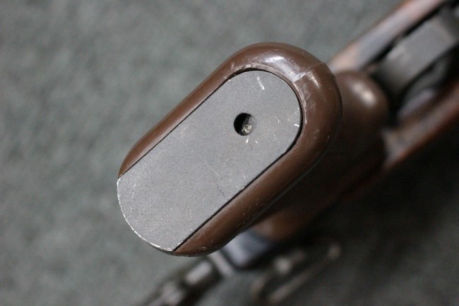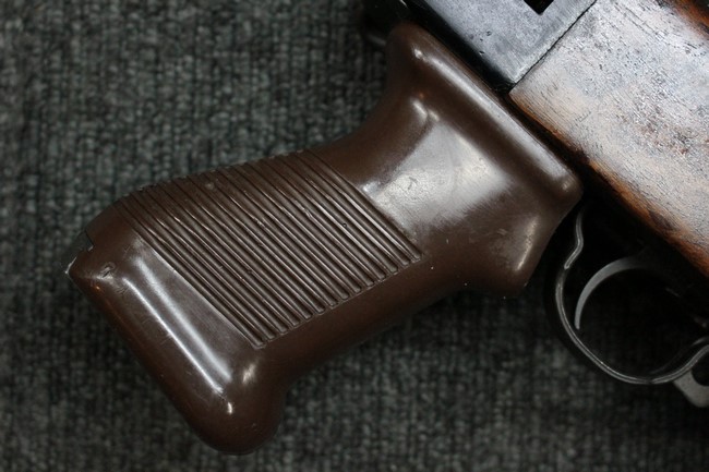 木部に関してはストックとアッパー・ハンド・ガード概ね近い色味で揃っています。 ストック右面の折り畳みストックを畳んだ際に当たる位置に打ち傷が見られる他、全体的に細かな打ち傷や小傷が見受けられますが、クラックなどはなく、全体的に概ねしっかりとした状態が保たれています。 折畳式ストックは展開時にガタつきはほとんど見られず、折り畳み動作もスムーズです。 光沢のある茶系色の樹脂製ピストル・グリップは、小傷は見られるものの、目立つ傷の見られないきれいな状態を保っております。