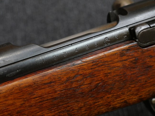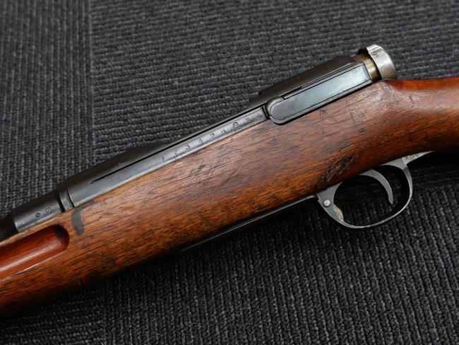 本個体は三八式騎兵銃 初期型の東京砲兵工廠 (小石川) 製です。 東京砲兵工廠では1923年 (大正12年) の関東大震災により甚大な被害を受け、一部機能を残しその役目を小倉工廠に移すまで生産されました。 初期型の東京砲兵工廠 (小石川) 製は、非常に丁寧な仕上がりで、検査刻印が多数打刻されているのが特徴的です。 本品の機関部左側面にはシリアルNo.123426に加えて東京砲兵工廠製を示す刻印が入っています。 尚、シリーズ刻印は入っていません。 薬室上面の菊花紋章及び「三八式」の刻印ははっきりと残っています。