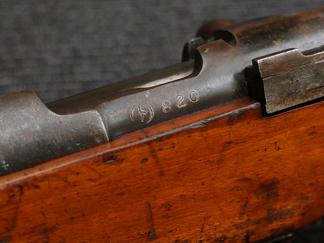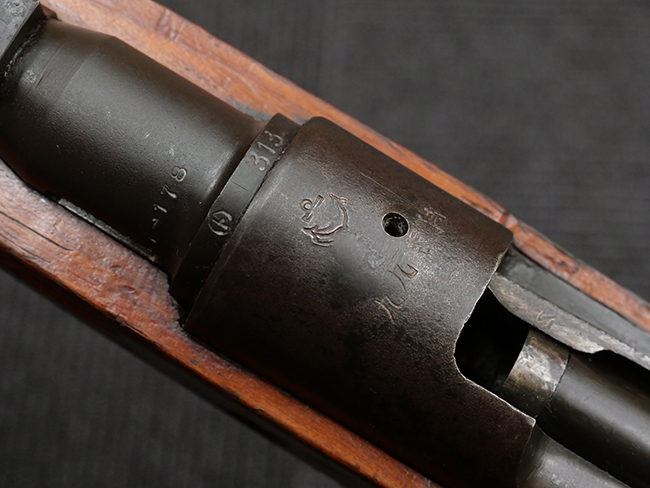 本品は九九式短小銃 初期/中期型の様な外見をした比較的初期の製造品で、通常菊花紋章が打刻されている位置に海軍の錨マーク、そして下には「九九式特」など独特な表記がされています。 また、機関部左側面には横須賀海軍工廠製を表す〇に "ト" の表記やシリアルNo.が確認出来ます。