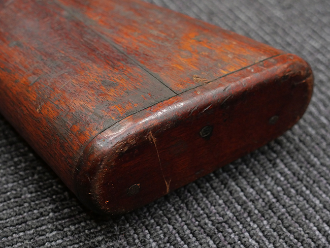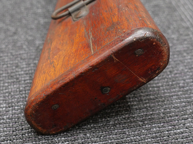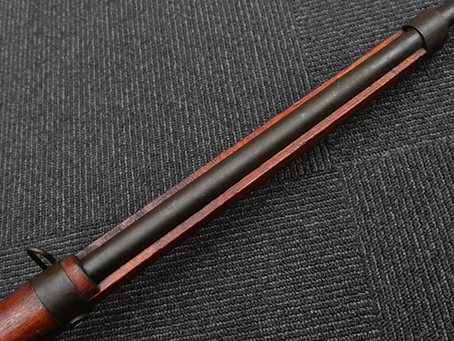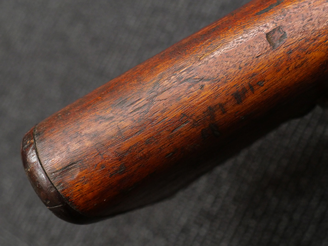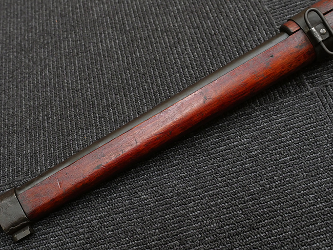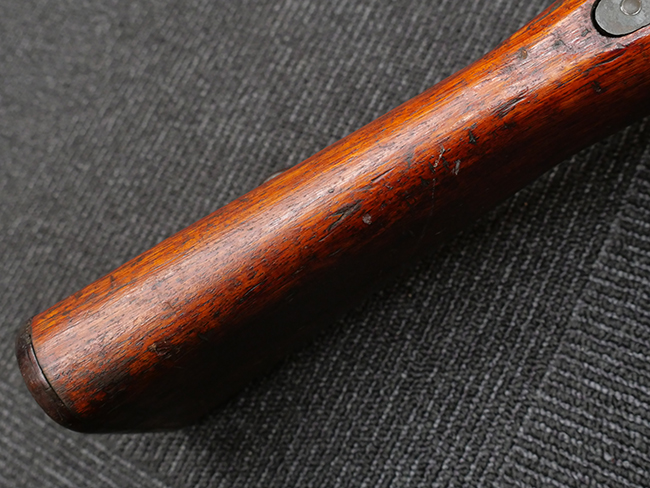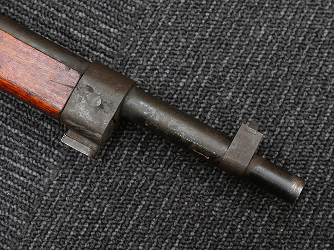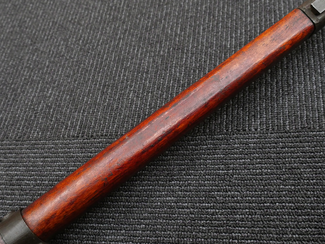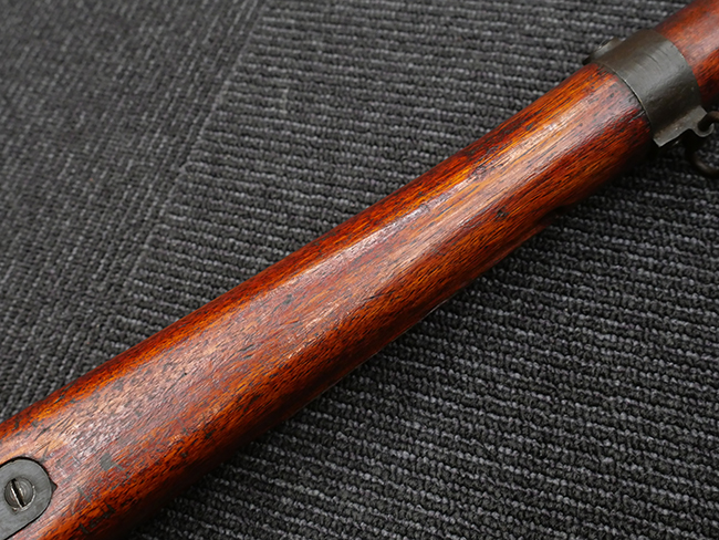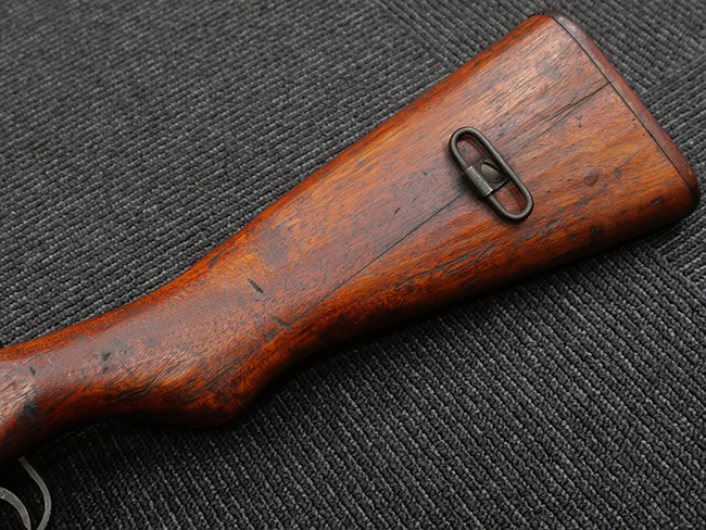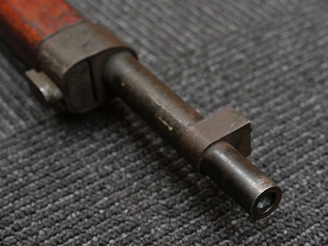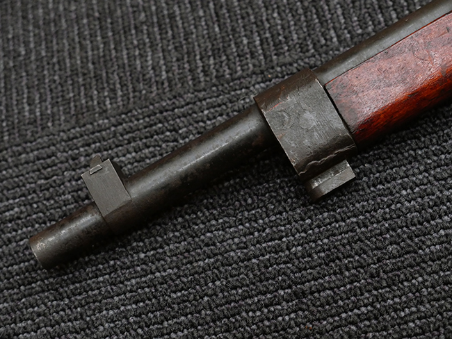 本品は九九式短小銃 末期型 (東洋工業製) です。 東洋工業は民間企業ですが、初期の段階から九九式の生産へ参加しており、名古屋、小倉工廠に次いだ生産数を誇りました。 機関部側面にはシリーズ<エ>及びシリアルNo.65096に加えて東洋工業製を示す刻印が打たれており、昭和19年7月頃から12月頃の間に生産された品である事が判ります。 末期型では基本的に薬室上部の「九九式」の刻印は省略されています。 菊花紋章ははっきりと残っています。 槓桿は楕円形で、安全子は溶接痕の有るタイプとなっています。 その他の仕様としては、照星はガードが無い仕様、木被は下帯までの短縮型、床尾負革止はネジ1本により固定されるタイプ、床尾板は木製となっています。 また、さく杖の取り付けは出来ない仕様となっています。
