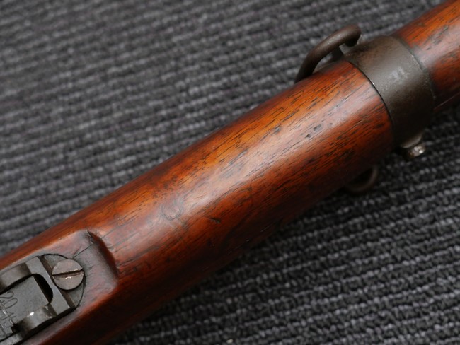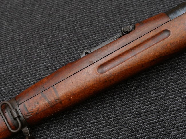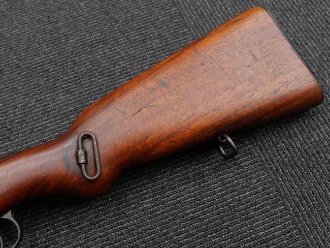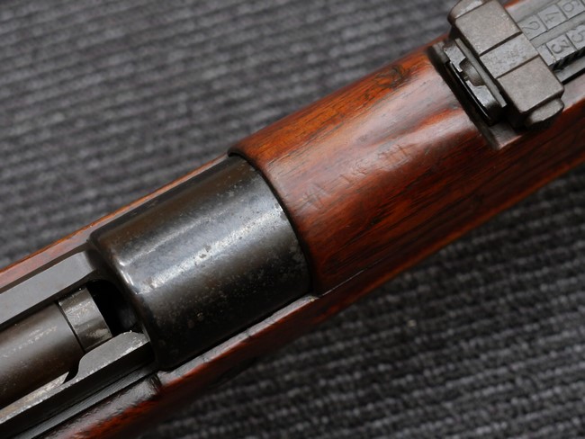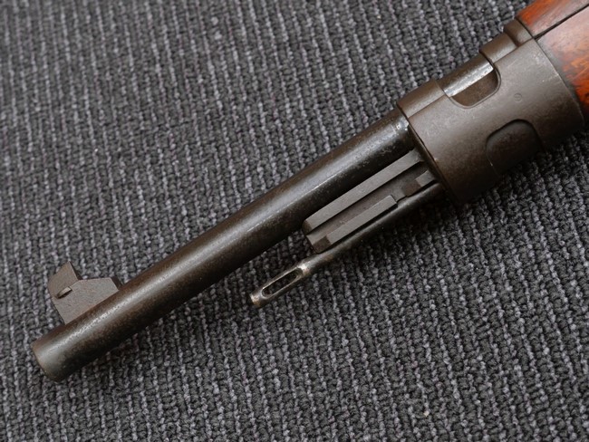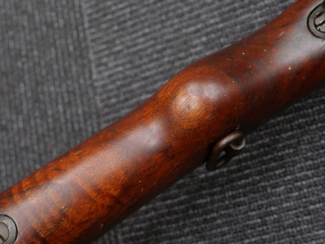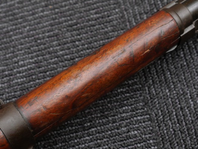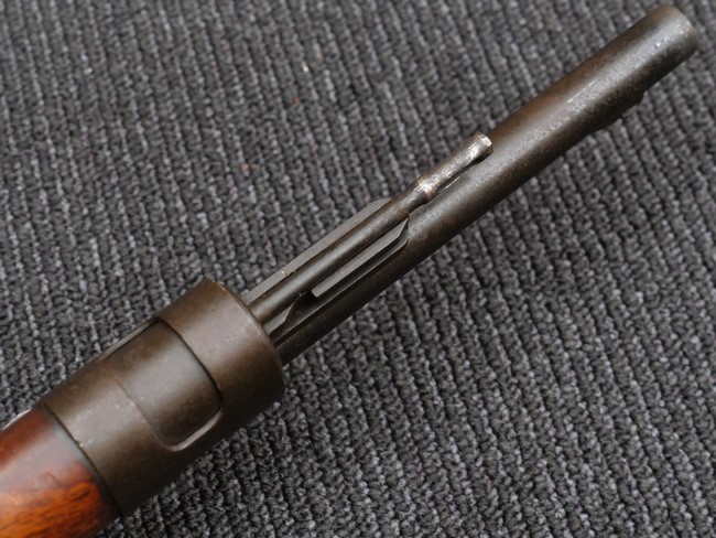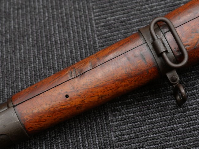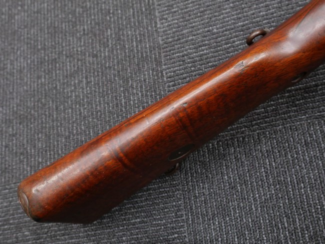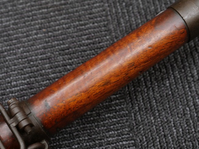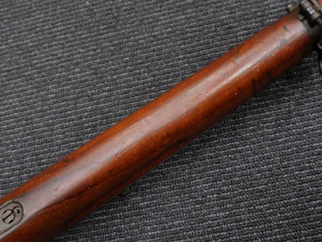本品の銃身や機関部といった金属部は、やや打ち傷や時代錆、若干の表面錆痕は見られるものの、現状目立った欠損等は見受けられません。 木製銃床やアッパー・ハンドガードについても、やや打ち傷や線傷の他、若干のヘアライン・クラックや僅かな欠けは見られるものの、大きな破損等は見られず、概ねしっかりとした状態が保たれています。 バット・プレート全体にやや時代錆や表面錆痕が見られますが、目立った変形等は見られず、銃床への取り付けについてもがたつきもなくしっかりとしています。 リア・サイトの調整については問題なく行う事が可能です。 付属のクリーニング・ロッドは、オリジナルよりもやや短いものとなっています。