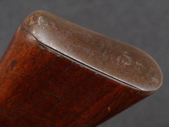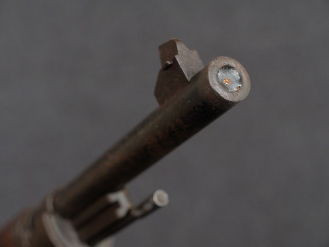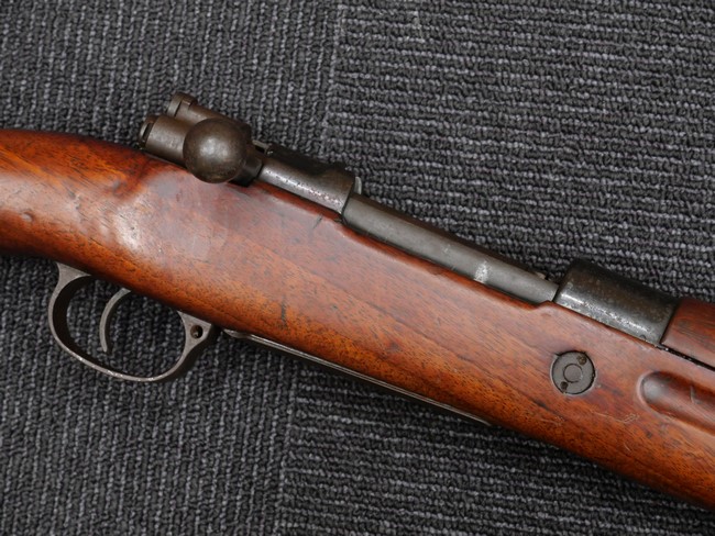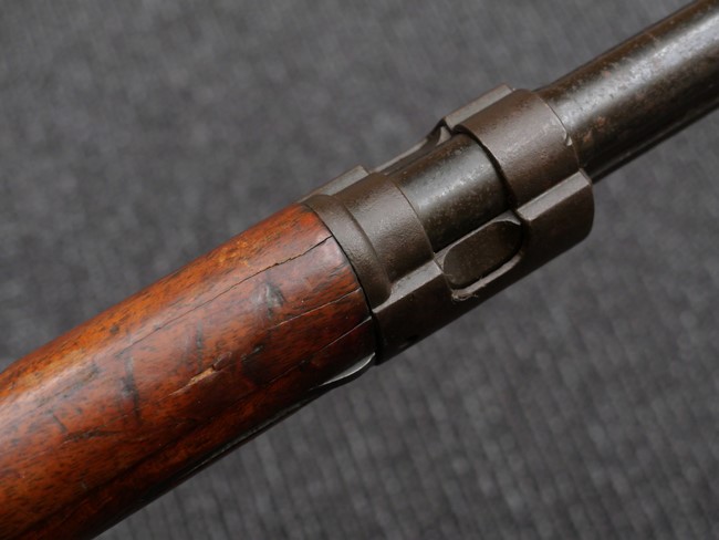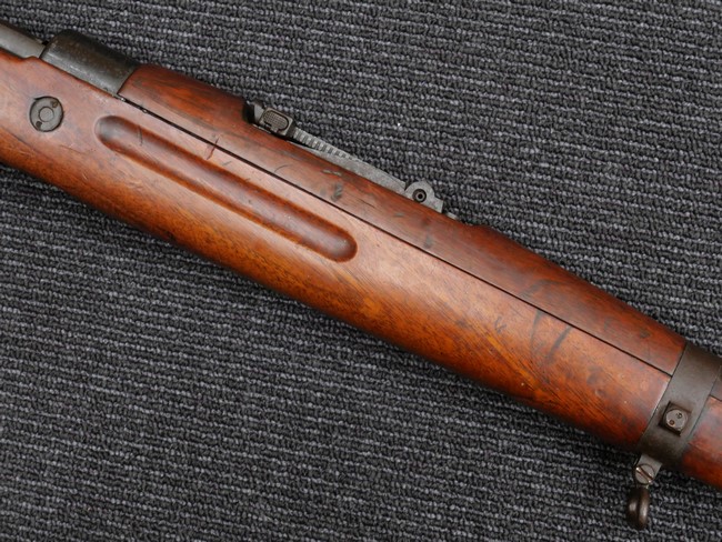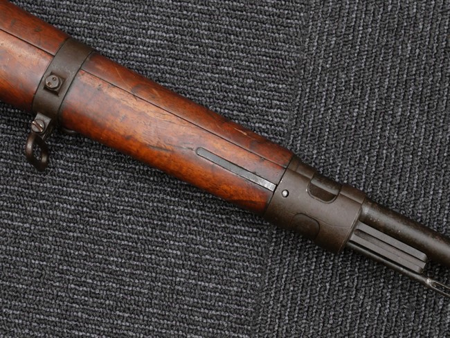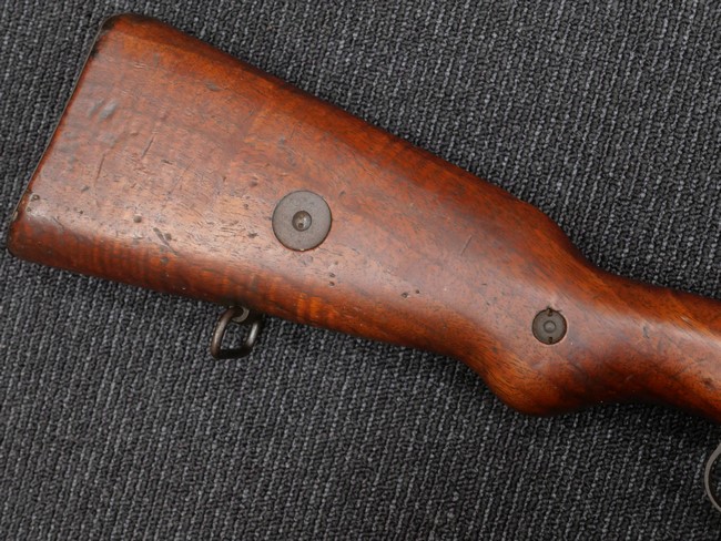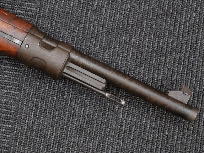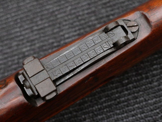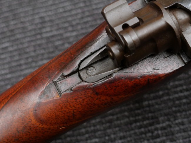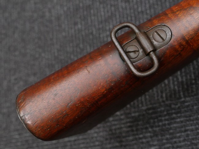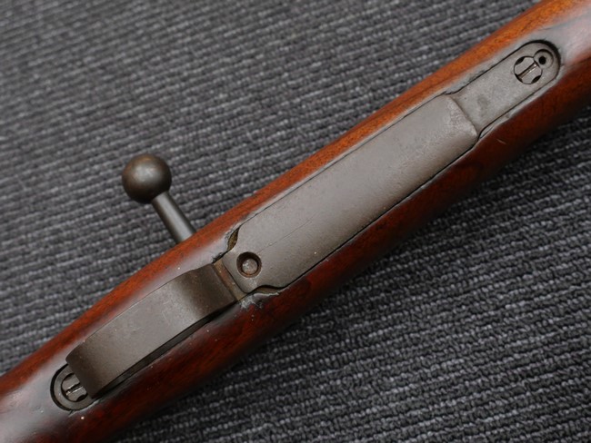本品の銃身や機関部といった金属部は、やや打ち傷や時代錆、若干の表面錆痕は見られるものの、現状目立った欠損等は見受けられません。 木製銃床やアッパー・ハンドガードについても、やや打ち傷や線傷の他、若干のヘアライン・クラックや僅かな欠けは見られるものの、大きな破損等は見られず、概ねしっかりとした状態が保たれています。 バット・プレート全体にやや時代錆や表面錆痕が見られますが、目立った変形等は見られず、銃床への取り付けについてもがたつきもなくしっかりとしています。 リア・サイトの調整については問題なく行う事が可能です。 付属のクリーニング・ロッドは、オリジナルよりもやや短いものとなっています。