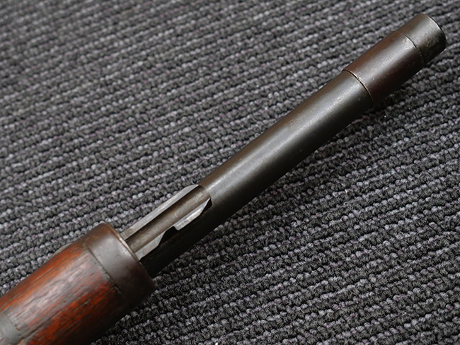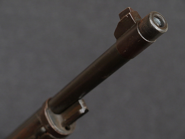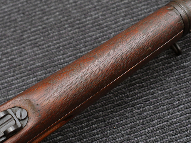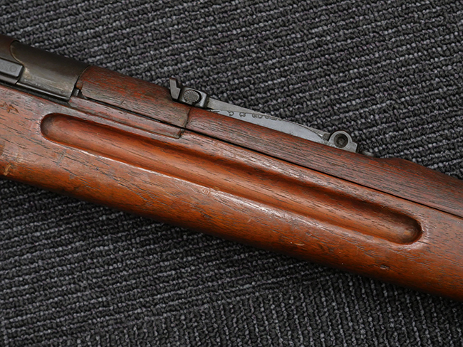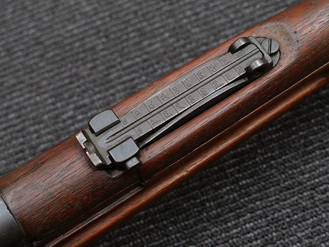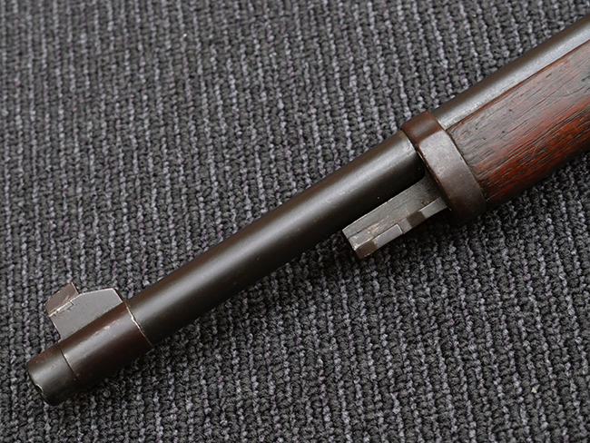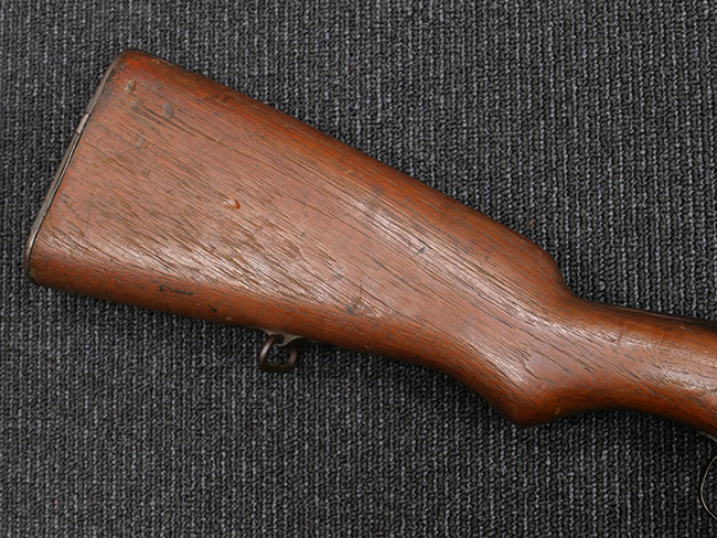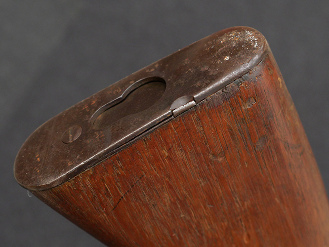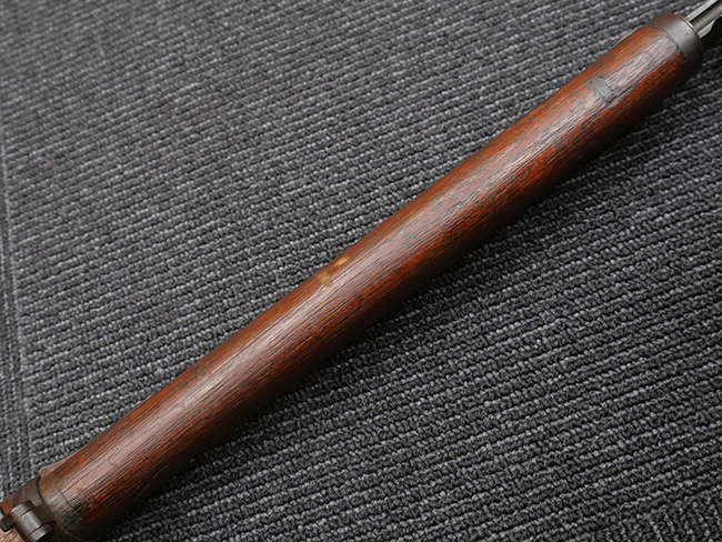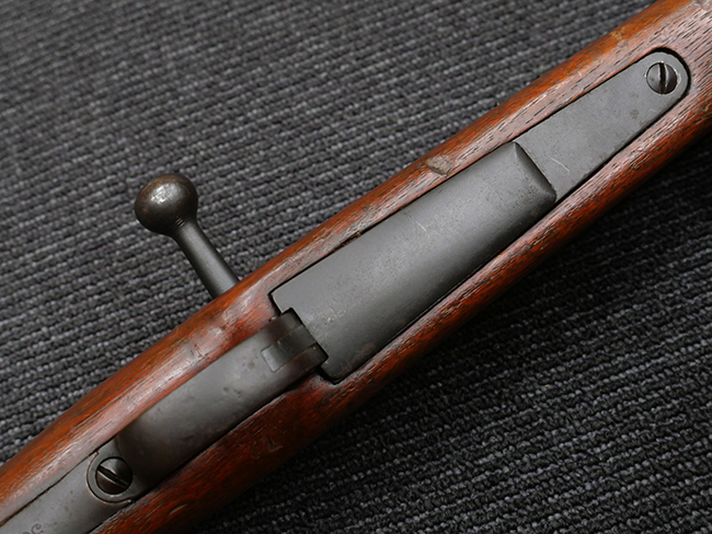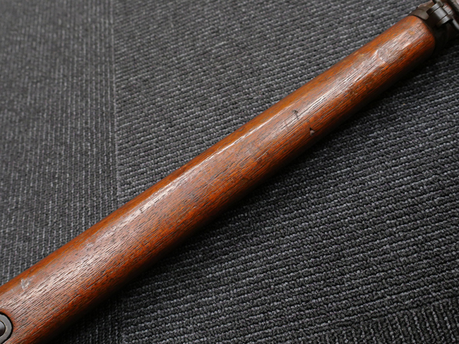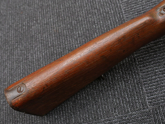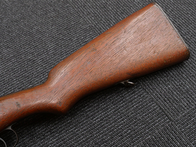 本品の機関部や銃身といった金属部は、やや打ち傷や擦れ、経年による褪色の他、若干の表面錆痕や一部に朽ち込み痕が見られるものの、目立った欠損等は見受けられず、表面仕上げも比較的残っています。 木製銃床についても、やや打ち傷や線傷が見られる他、アッパー・タング後方やバット・プレート取り付け部周辺の木部に僅かに欠けが見られるものの、こちらも大きな破損等は見られず、概ねしっかりとした状態が保たれています。 バット・プレート部は全体にやや時代錆が表れており、一部に朽ち込み痕が見られるものの、銃床への取り付けについてはがたつきもなくしっかりとしており、ストック内コンパートメントの蓋の開閉についても問題なく行う事が可能です。 リア・サイトの調整や弾倉底板の着脱、遊底覆の開閉については問題なく行う事が可能です。