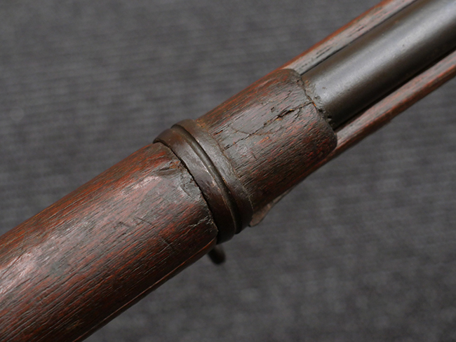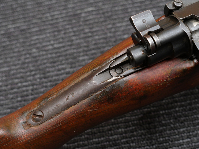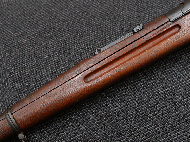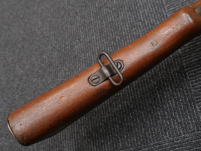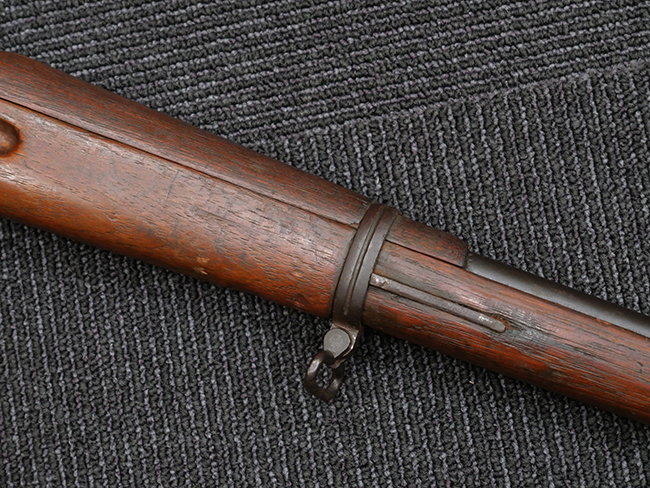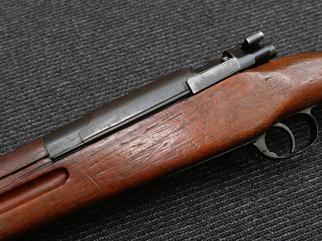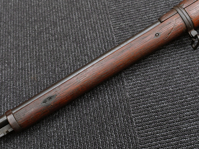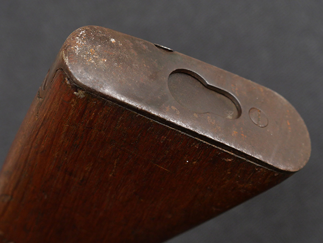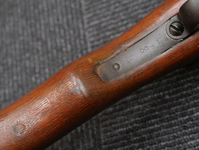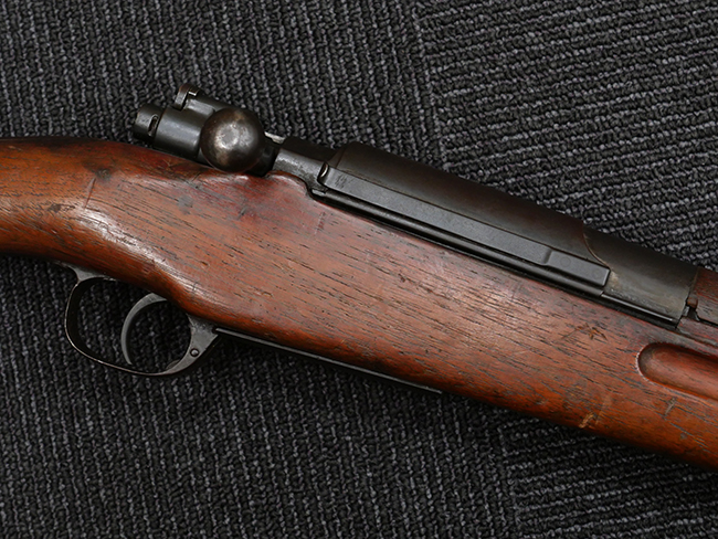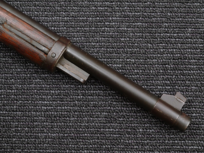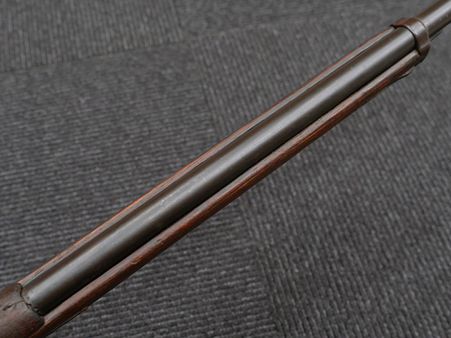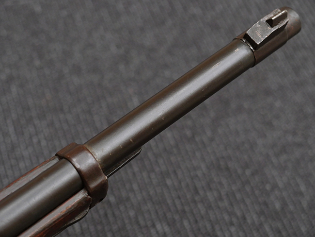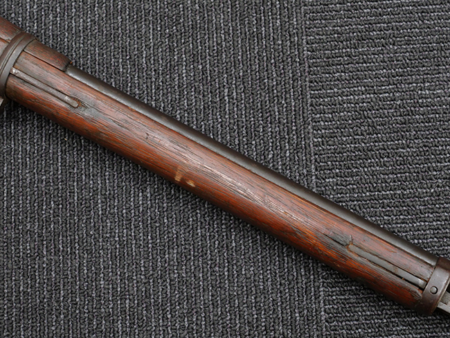 本品の機関部や銃身といった金属部は、やや打ち傷や擦れ、経年による褪色の他、若干の表面錆痕や一部に朽ち込み痕が見られるものの、目立った欠損等は見受けられず、表面仕上げも比較的残っています。 木製銃床についても、やや打ち傷や線傷が見られる他、アッパー・タング後方やバット・プレート取り付け部周辺の木部に僅かに欠けが見られるものの、こちらも大きな破損等は見られず、概ねしっかりとした状態が保たれています。 バット・プレート部は全体にやや時代錆が表れており、一部に朽ち込み痕が見られるものの、銃床への取り付けについてはがたつきもなくしっかりとしており、ストック内コンパートメントの蓋の開閉についても問題なく行う事が可能です。 リア・サイトの調整や弾倉底板の着脱、遊底覆の開閉については問題なく行う事が可能です。