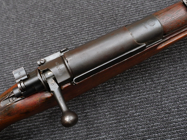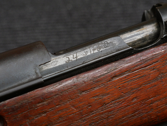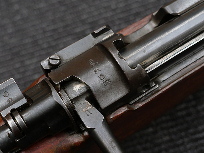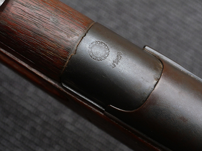 本品の機関部左側面の旧軍小銃と同様の箇所には、東京砲兵工廠小石川小銃製造所の四つ輪刻印が入っています。 薬室上部にはチャクリー王朝の象徴であるスダルシャナ・チャクラの紋章及びタイ文字により「ラッタナコーシン暦121年 (=タイ仏暦2445年=1902年)」を意味する刻印が入っている他、レシーバー後部上方にもタイ文字でシリアルNo.の刻印が入っています。
