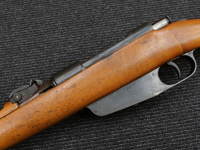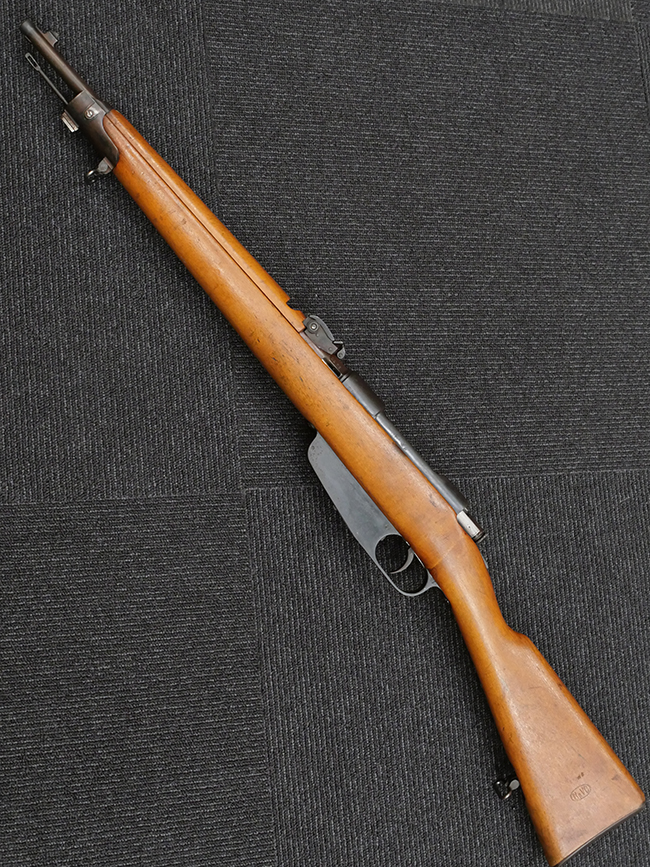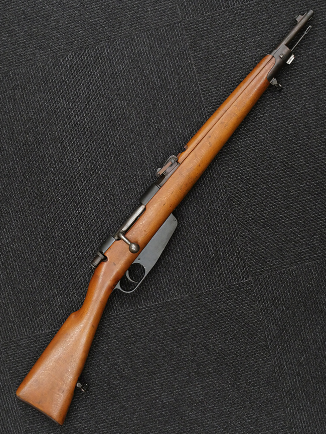 カルカノ M1891 小銃は、ベテェーリ小銃の後継として1891年3月に王令で制式決定され、1892年3月29日に軍で正式採用、同年5月から部隊配備が開始された、イタリア軍初の無煙火薬を使用する制式小銃で、トリノ陸軍工廠でサルヴァトーレ・カルカノ技師によって開発されました。 使用弾薬はベテェーリ小銃用の10,4mm弾に比べて大幅に小口径化された6,5mm×52 マンリッカー・カルカノ弾で、小口径化に伴い歩兵が携行可能な弾薬量が増大しました。 機関部の構造はドイツのGew.88 小銃の影響を強く受けたコックオン・オープニング方式で、弾倉はエンブロック・クリップを使用するマンリッカー方式を改良した物が用いられています。 クリップは上下対称のデザインとなっており、上下どちらの向きでも装填が可能です。 また、クリップから最終弾が引き抜かれると、空のクリップがマガジン・ハウジングの下部から排出される構造となっていました。 ボルト・スリーブにはファイアリング・ピン及びボルトをロックする安全装置が設けられています。 M1891 騎兵銃は第一次世界大戦時のイタリア軍の主力騎兵銃で、銃を背負った際に他の装具に引っ掛からない様に、ボルト・ハンドルがストック方向に折り曲げてあります。
