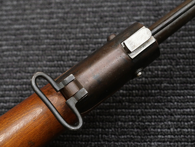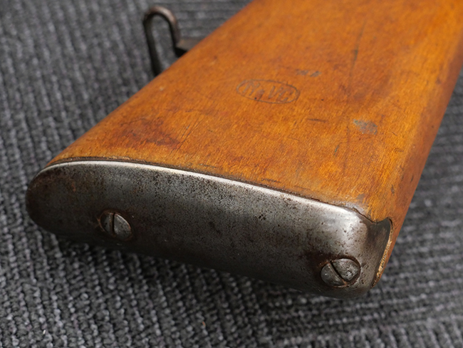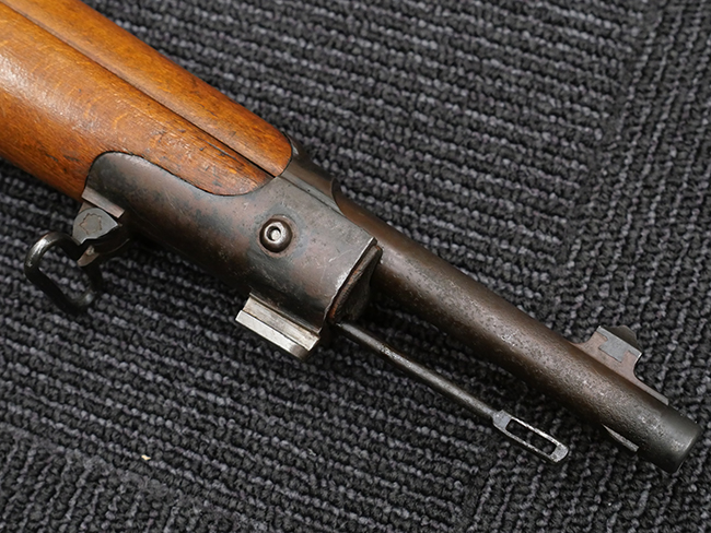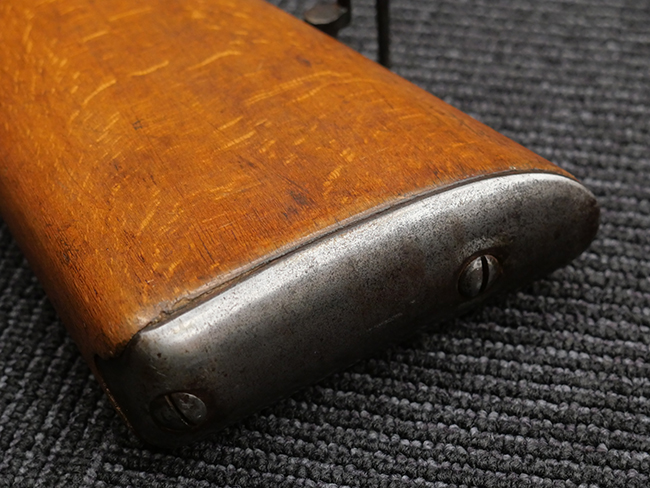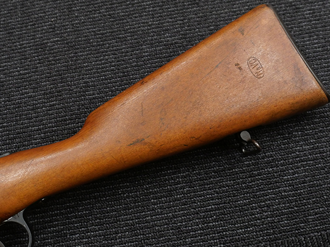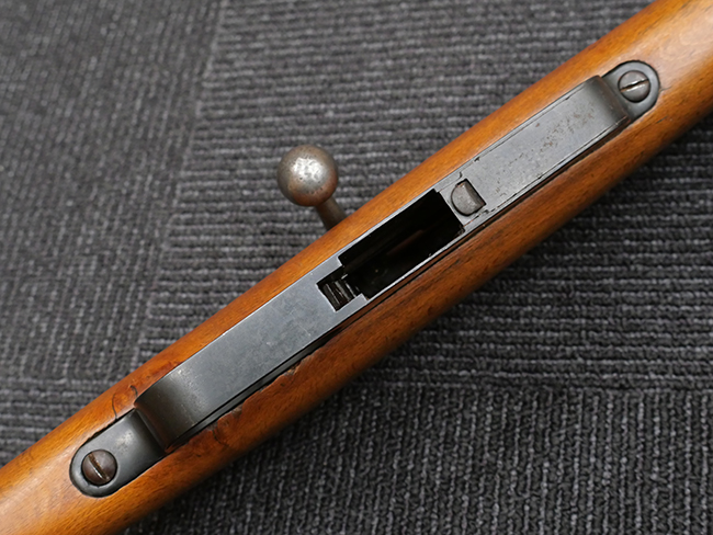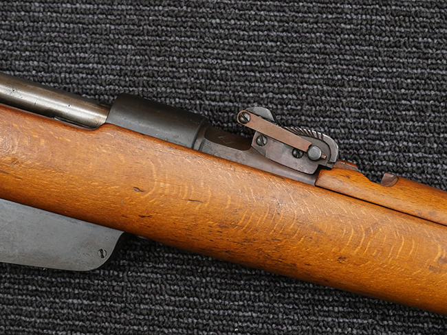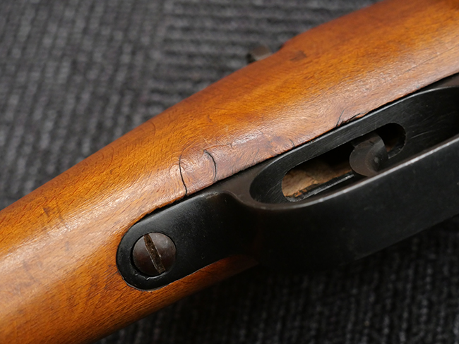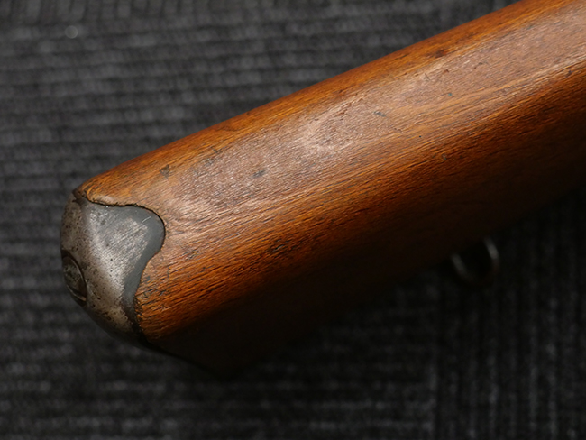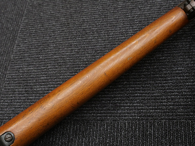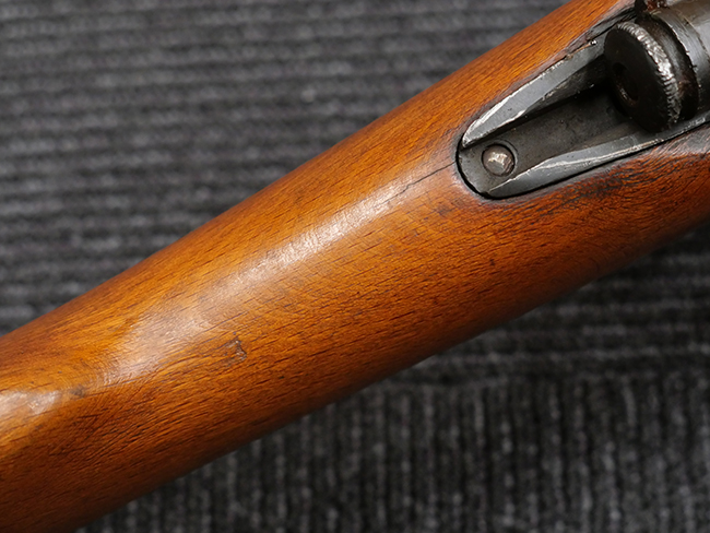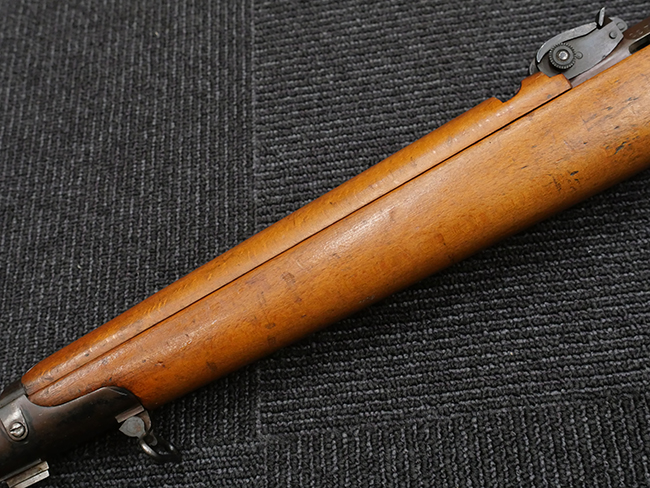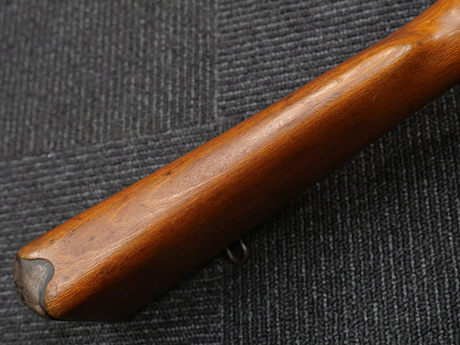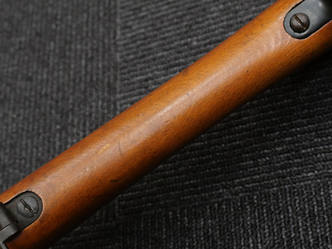 本品の銃身や機関部といった金属部は、若干の打ち傷や擦れの他、一部に表面錆痕が見られるものの、目立った欠損等は見られず、表面仕上げも比較的良好に残っています。 白磨きのボルトについても、若干の時代錆や表面錆痕は見られますが、こちらも現状目立った欠損は見られません。 木製銃床についても、やや打ち傷や線傷が散見され、トリガー・ガードやアッパー・タング周辺の木部に僅かなヘアライン・クラックが見られるものの、こちらも大きな破損は見られず、コンディションは概ね良好です。 バット・プレート部については、やや時代錆や表面錆痕は見られるものの、目立った変形等は見られず、銃床への取り付けもがたつきもなくしっかりとしています。 リア・サイトの調整については問題なく行う事が可能です。 クリーニング・ロッドが付属いたします。