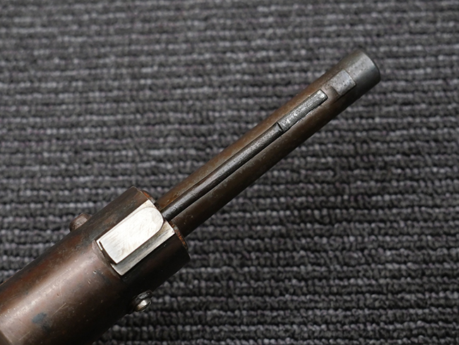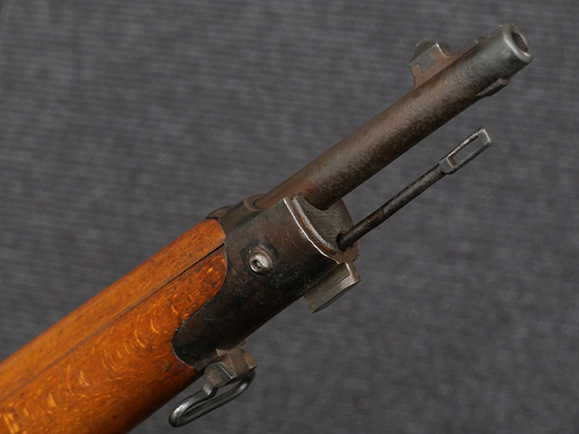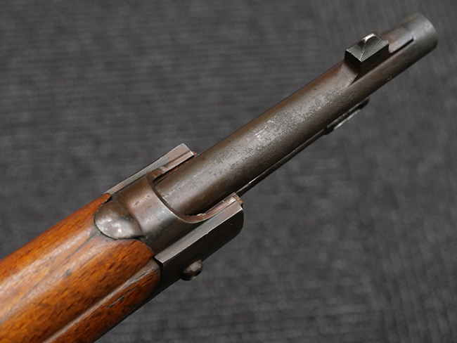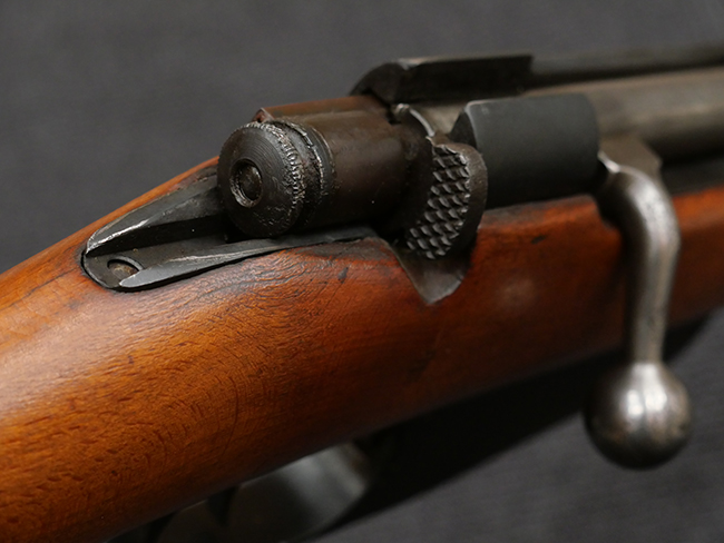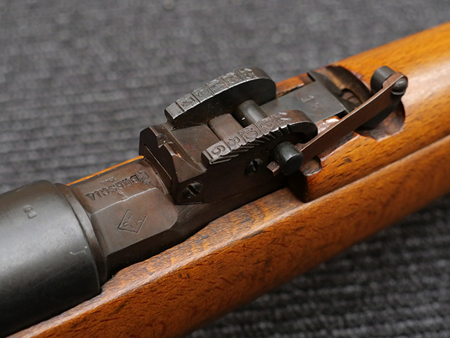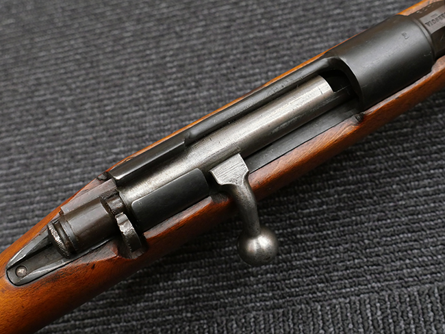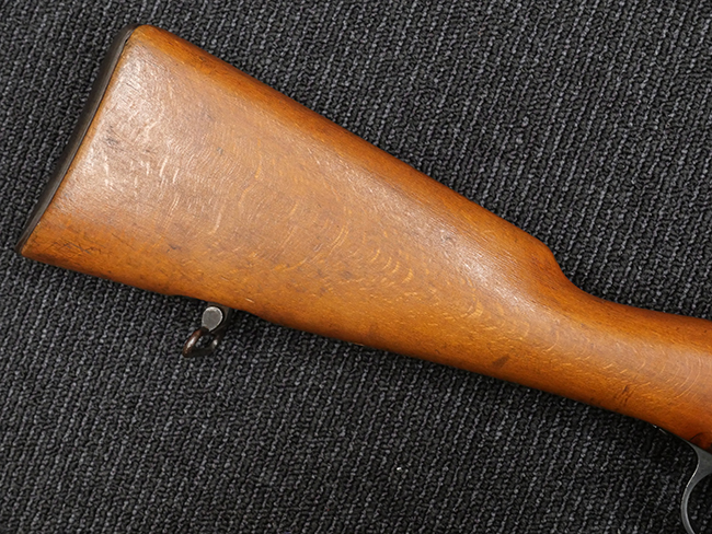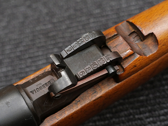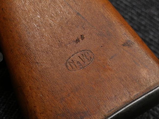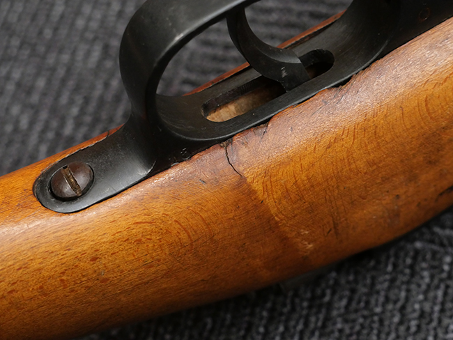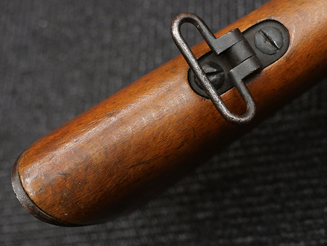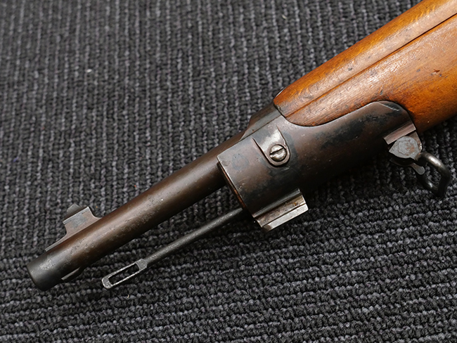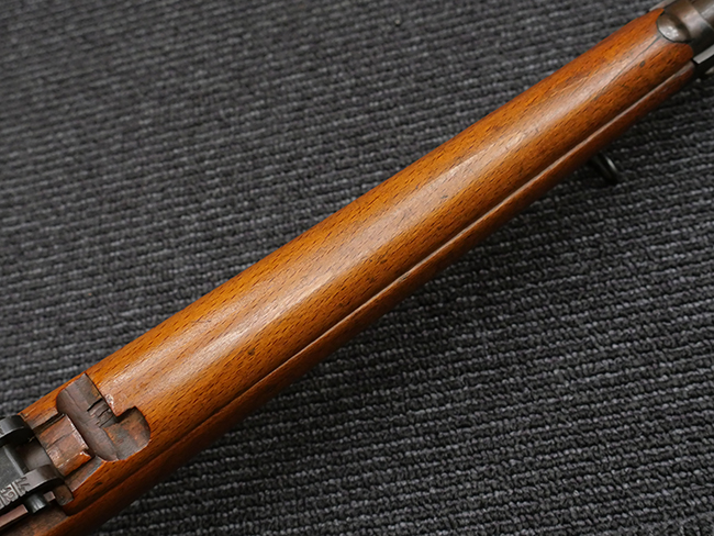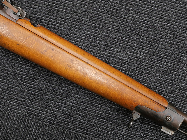 本品の銃身や機関部といった金属部は、若干の打ち傷や擦れの他、一部に表面錆痕が見られるものの、目立った欠損等は見られず、表面仕上げも比較的良好に残っています。 白磨きのボルトについても、若干の時代錆や表面錆痕は見られますが、こちらも現状目立った欠損は見られません。 木製銃床についても、やや打ち傷や線傷が散見され、トリガー・ガードやアッパー・タング周辺の木部に僅かなヘアライン・クラックが見られるものの、こちらも大きな破損は見られず、コンディションは概ね良好です。 バット・プレート部については、やや時代錆や表面錆痕は見られるものの、目立った変形等は見られず、銃床への取り付けもがたつきもなくしっかりとしています。 リア・サイトの調整については問題なく行う事が可能です。 クリーニング・ロッドが付属いたします。