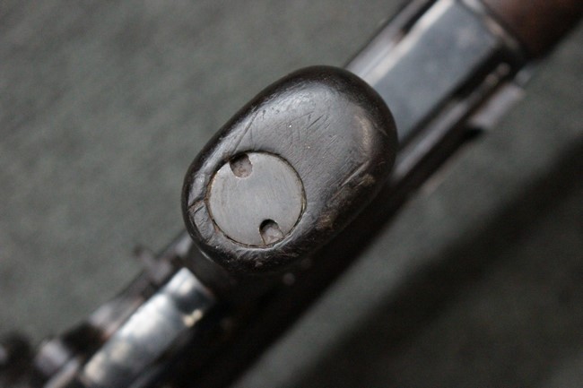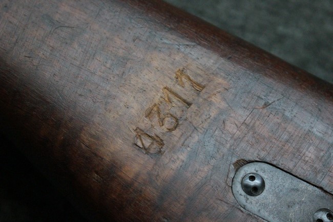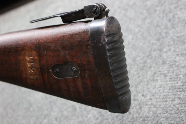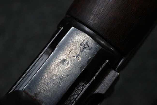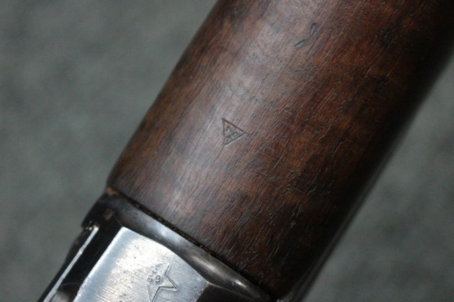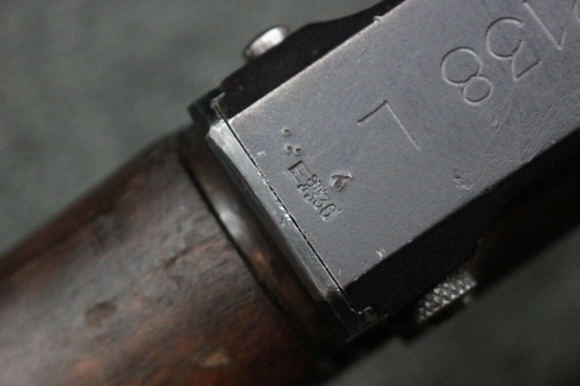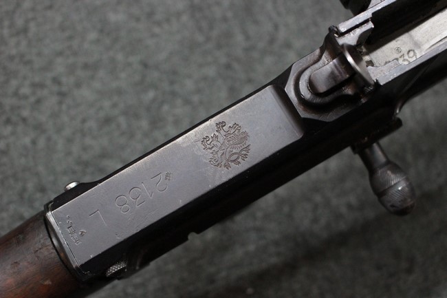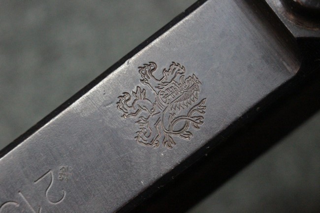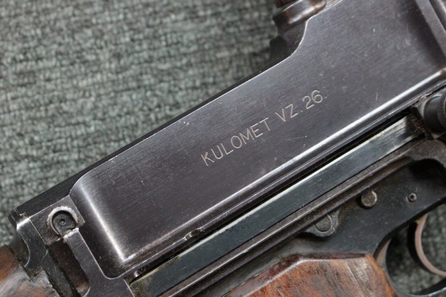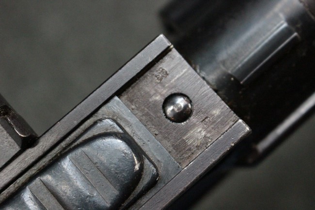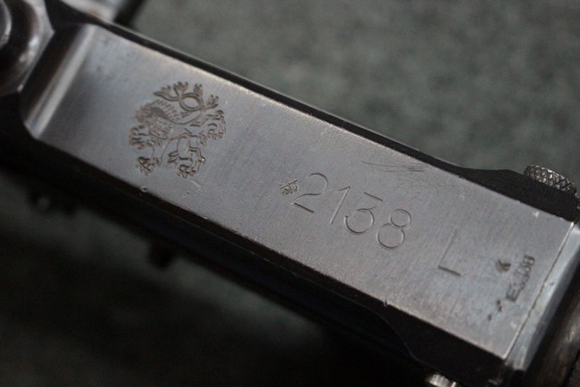 本品の機関部左側面には、「CESKOSLOVENSKA ZBROJOVKA, AS BRNO.」のメーカー刻印が二行にわたって入っている他、機関部右側面には「KULOMET ZB VZ.26.」のモデル名刻印が入っています。 大きなライオンの国章とレシーバー後端上部に「E」と極小のライオン、製造年を示す「36」の数字を組み合わせた刻印が小さく入っています。 レシーバー上面にはシリアルNo.2138が入っています。 またレシーバー下面の後端には☆に69と思しき刻印が見られバット・ストック左側面には4311と打刻されています。