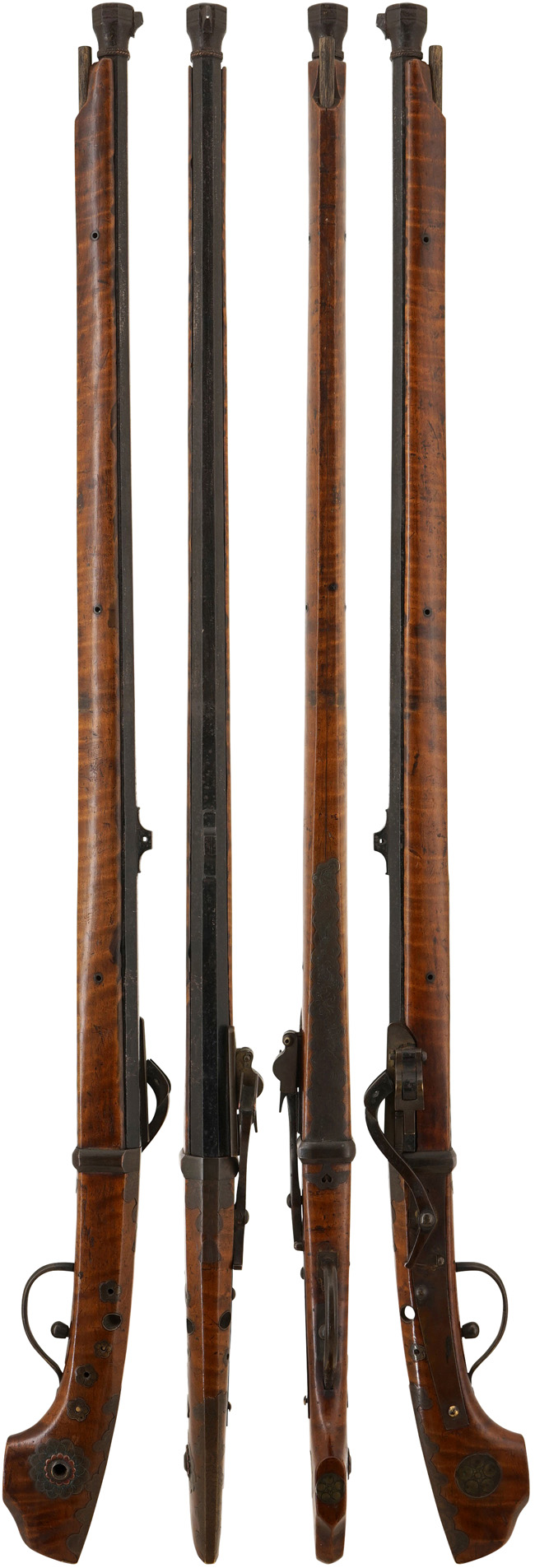 本品の筒(銃身)は全体的に黒漆のように見える仕上げになっています。銃床に隠れる銃床下部等には一部錆痕や若干の朽ち込みが見受けられるものの、概ね良好な状態が保たれており、外部から見える部分は良い状態です。 銃身下部の目釘金具の位置は銃床の目釘穴の位置と3ヶ所とも完全に一致しています。 尚、目釘は付属致しません。 台 (銃床) は若干の打ち傷や擦れ、黒染み等は見受けられるものの、大きな割れや欠け等は見受けられず、全体に当時の黒漆仕上げが残った良好な状態が保たれています。 カラクリの作動については完全で、火挟を起こした状態で引金を引くと火挟がスムーズかつ力強く落ちます。 銃身内は銃口から銃身後部まで完全に抜けて (通って) おり、火穴も抜けています。 火蓋の開閉についても問題なく行う事が可能です。 尾栓もスムーズに取り外しが可能です。 木製のかるか(さく杖)が付属致します。