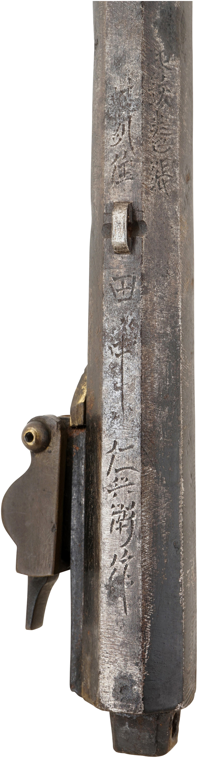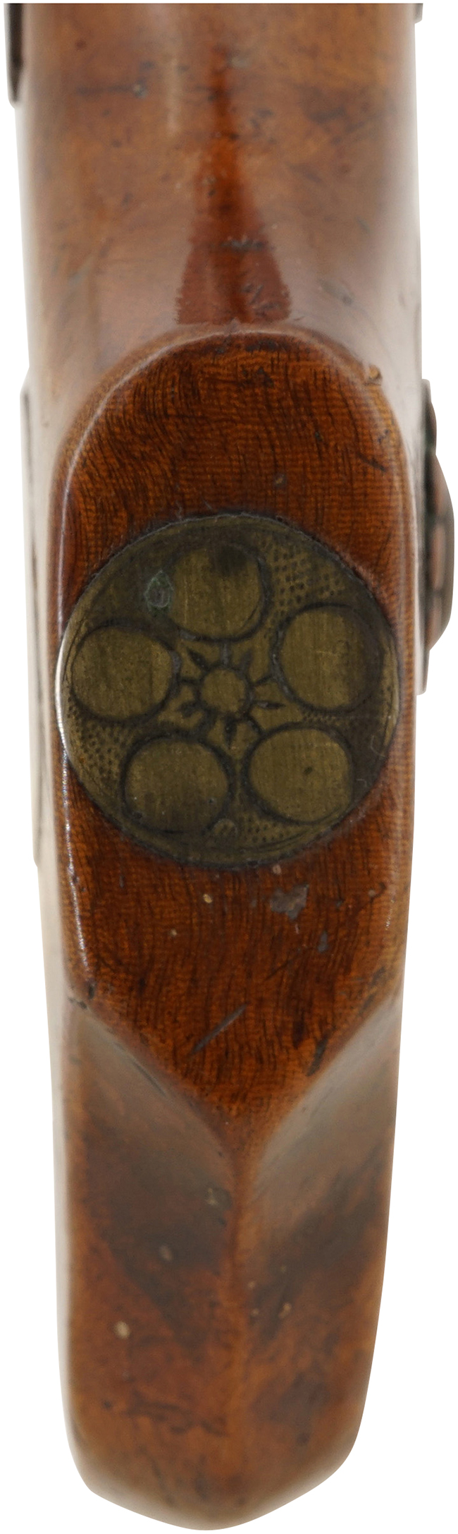 江戸時代では元服したら帯刀 (二本差し) が許され、砲術家の家系や財力がある武士はその頃より射撃も嗜みとして行い、体格に併せて小型の銃が作られました。 火縄銃ではこのような小型の品は、「御座敷鉄砲」「稚児鉄砲」と呼ばれる事があります。 弊社には明らかに年少者用と思われる稚児銃が複数挺入荷しており、全て土佐藩 (現在の高知県) で作られていました。 全国的に見ても珍しい稚児銃の殆どが土佐藩で作られたのは、藩士の子弟教育に力を注いでおり、特に幼少の頃から砲術を学ばさせる為に作られた結果でしょうか? 稚児銃という特殊な銃が土佐藩で多く作られたのであれば、今後の研究が期待される分野です。 弊社では色々な要素から本品は「幕末から明治初期の土佐の稚児鉄砲」ではないかと考えています。 また、本品が年少者用の「稚児鉄砲」と考えた理由の一つとして、全体的な大きさもしかりですが、「右手で銃を握った際の引き金の位置」を挙げる事が出来ます。 本品は通常の中筒より「指二本ほど」は後方に引き金が配置されていおり、成人男性が握ると引き金があまりにも後ろに位置するため、非常に使い辛くなっています。 これが元服頃の年少者が握ると丁度良い (引き指が引き金に当たる) 位置になります。 本品は例外的に土佐筒ではなく摂州堺の鉄砲鍛冶の作品で土佐以外の藩からの注文筒と思われます。 東日本で好まれた形状ですが注文主の場所が特定できませんので、製作地の堺筒としますが 加賀大聖寺藩「大聖寺梅鉢紋」の家紋から特別感を出して加賀筒と呼んでも良いでしょう。(MM)
