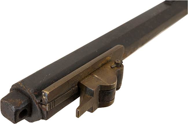 本品の銃身は後方に向かって緩やかに広がった細い八角銃身です。 銃口部には八角柑子で、柑子の後ろには銅製と思われる「玉縁/化粧飾りの輪」が設けられています。 銃身は3箇所の目釘によって銃床に取り付けられる構造となっています。 銃床両側のシノギ目 (目釘穴) の穴の周りは真鍮製の蛇目金具で飾られています。 台カブ左側面にある4ヶ所と右側1ヶ所の地板鋲穴の周りの金具は真鍮と銅の二種類の材質を使った凝った二重菊花になっています。