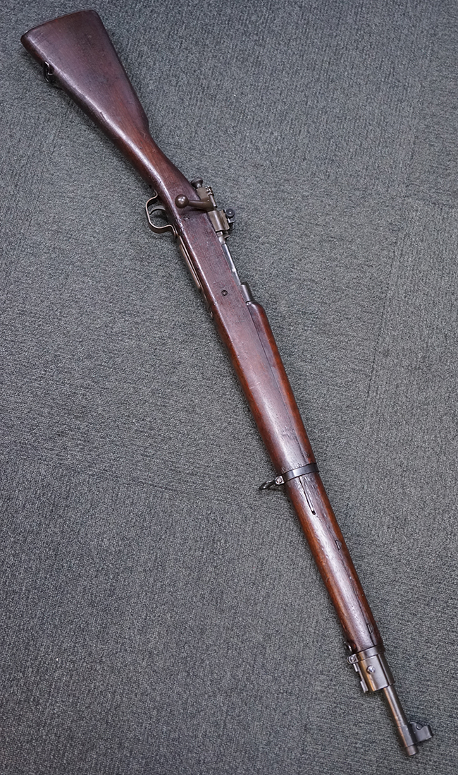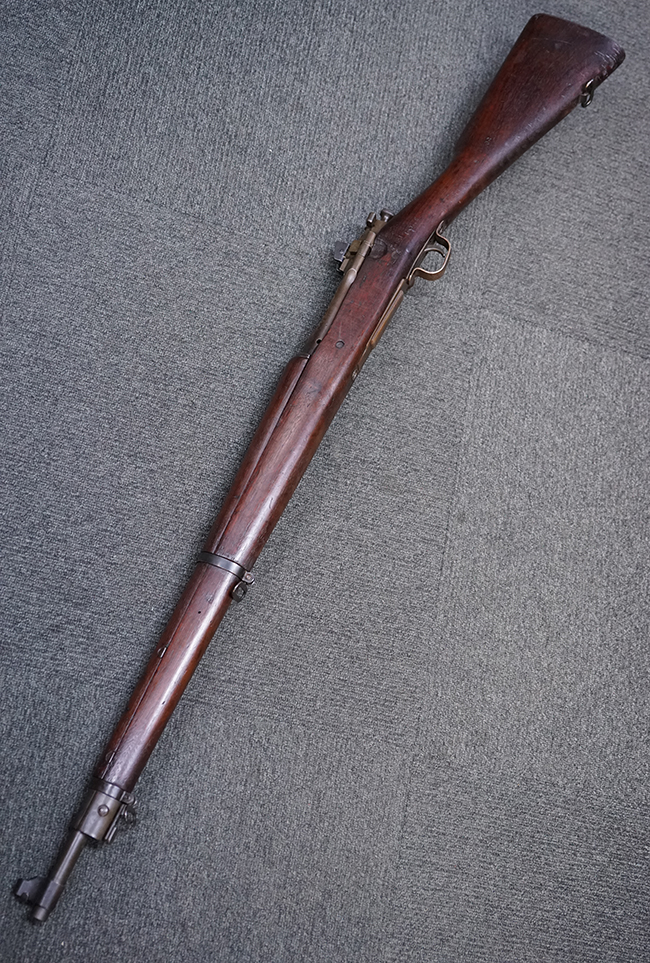 1903年にアメリカ軍制式となった、第一次世界大戦時の主力小銃です。 米西戦争の際に使用していた.30-40 クラグ・ヨルゲンセン・ライフルに対し、敵側のスペイン軍が使用するモーゼル系ボルト・アクション・ライフルの弾薬や操作性の優秀性を痛感した事から、モーゼル M1898小銃を基に開発されたと言われています。 しかしながら、コーン・タイプのボルト・ヘッドやボルト・ストップ等に独自の設計がなされています。 これによって米軍はようやく世界水準に達したボルト・アクション・ライフルを手にする事になりました。 使用弾薬の.30-06弾 (米軍ではM1/M2ボール) は現在でも猟用で使用されているほどの傑作カートリッジで、後に採用されたM1ガーランド小銃でも採用されています。 尚、実際には.1903年に.30-03弾がM1903小銃と共に採用されたのですが1906年に使用弾薬が.30-06弾へと変更されました。