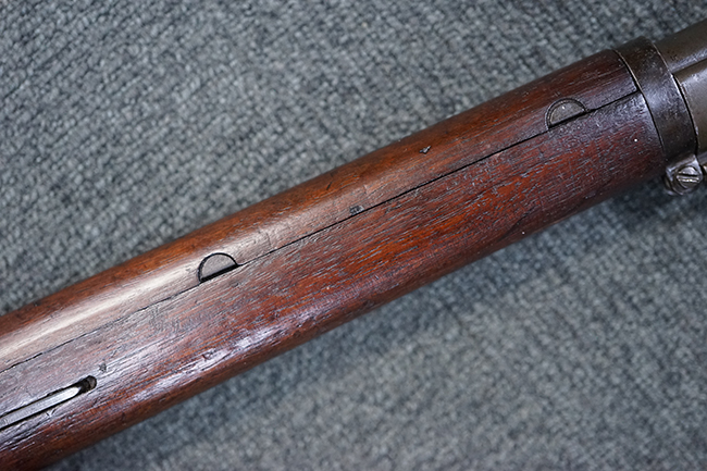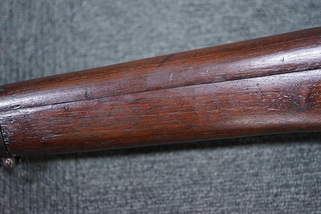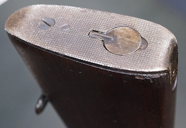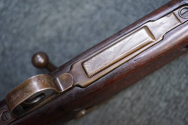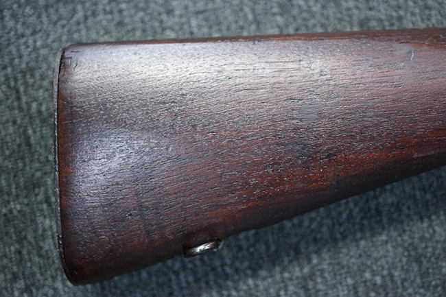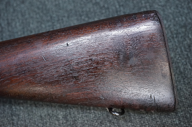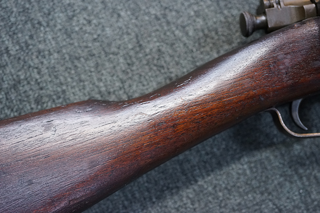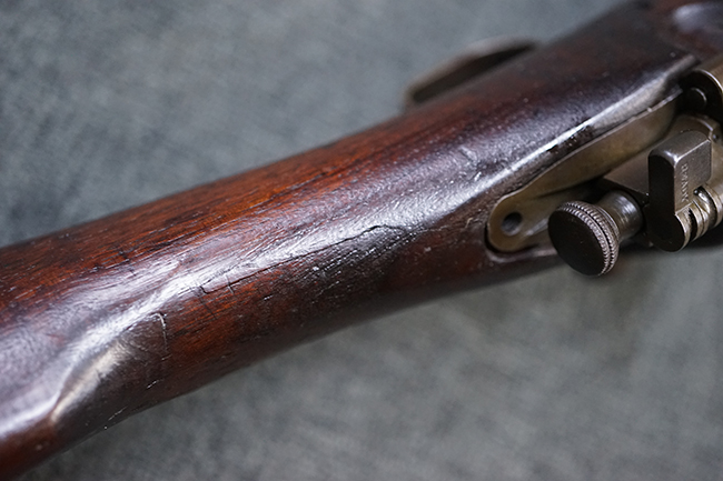 本品の機関部や銃身といった金属部はやや小傷や擦れ、錆の跡が見られるものの、目立った欠損は見受けられず、パーカー仕上げも大部分に残った比較的良好な状態が保たれています。 木製銃床については、やはり細かな打ち傷や線傷が散見されるものの、現状目立った割れや欠けなども見られず、こちらもコンディションは概ね良好です。 バット・プレート部についても若干の打ち傷や擦れを除いて目立った変形等は見られず、ストック内コンパートメントの開閉についても問題なく行う事が可能です。 リア・サイトの調整については問題なく行う事が可能です。 トリガーテンションの有る、ボルトが閉じた状態で固定された旧加工品です。 (YS)