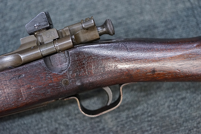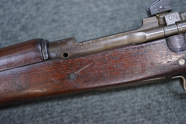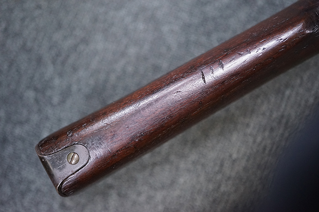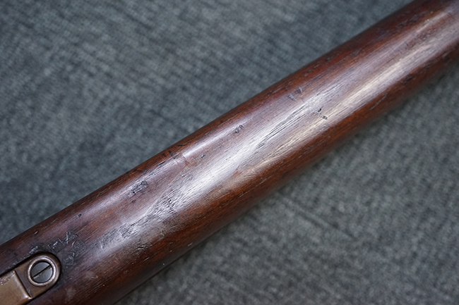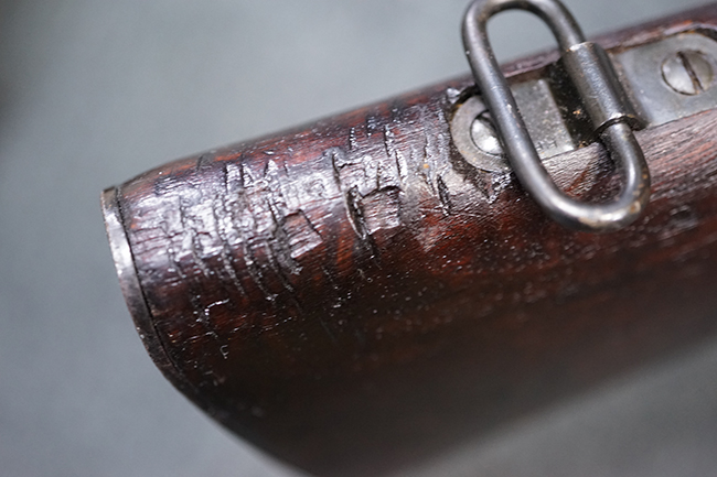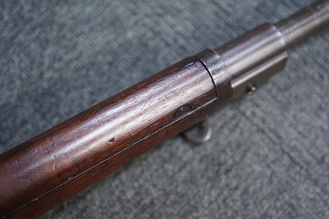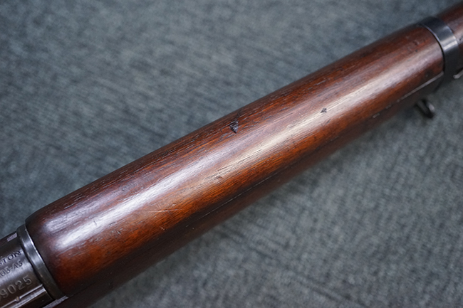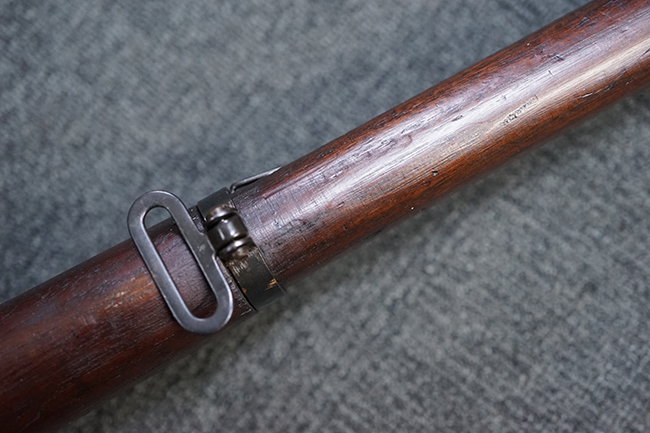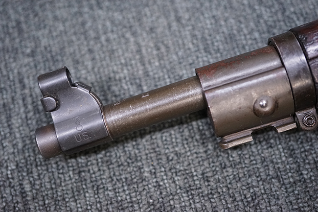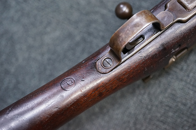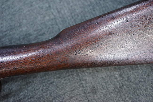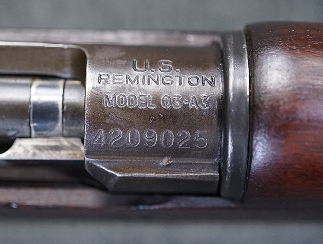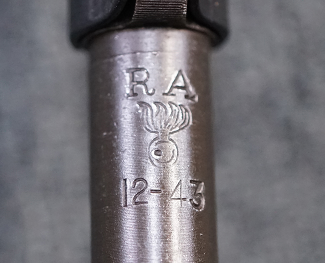 本品の銃本体はスミス・コロナ社製で、薬室上面にはシリアルNo.の他、「U.S. REMINGTON MODEL 03-A3」のモデル名刻印が入っています。 本品はシリアルNo.から1942年に製造された個体である事が窺えます。 銃身の刻印は1943年12月レミントン社製を示す「RA 12 43」となっており、レシーバーの生産時期とマッチしています。 トリガー上方の銃床左側面には1942年から1946年にかけて陸軍のロチェスター兵站管区で調達を担当していたFrank J. Atwood中佐のイニシャルを示す「FJA」の検査官刻印や、米国武器省 (Ordnance Department) の検査刻印であるクロス・キャノンの刻印が入っています。 また、銃把前面には「P」のプルーフ刻印が確認出来ます。