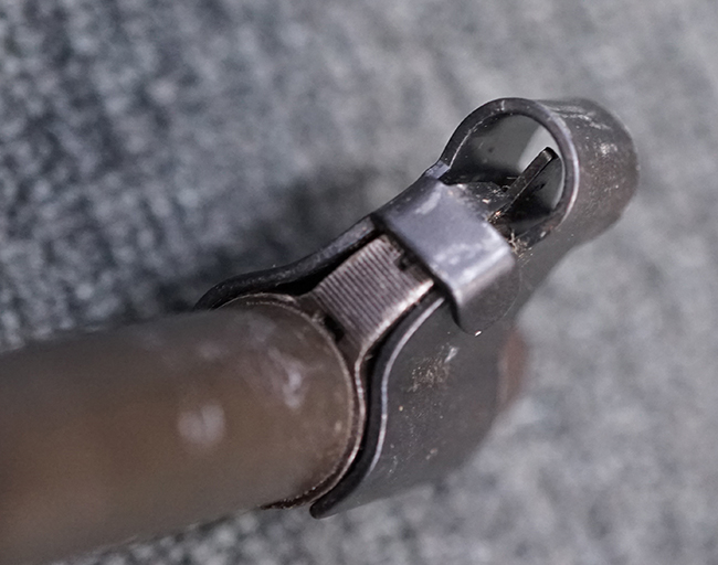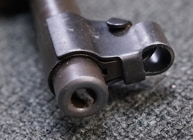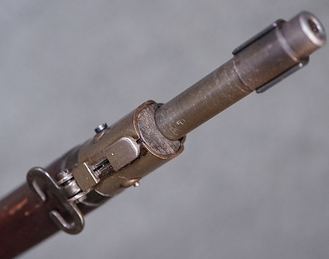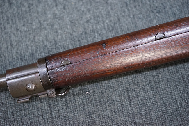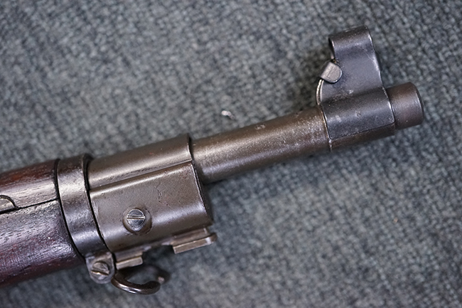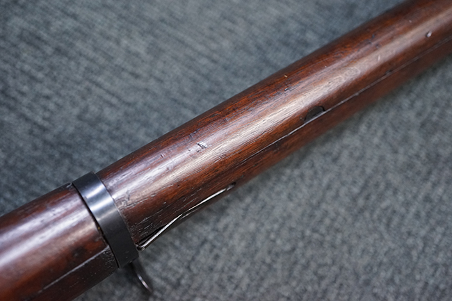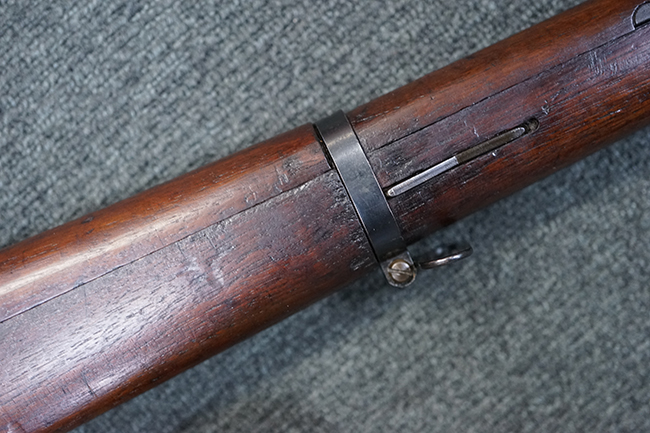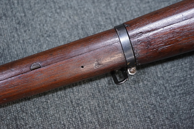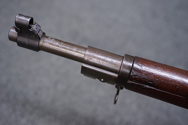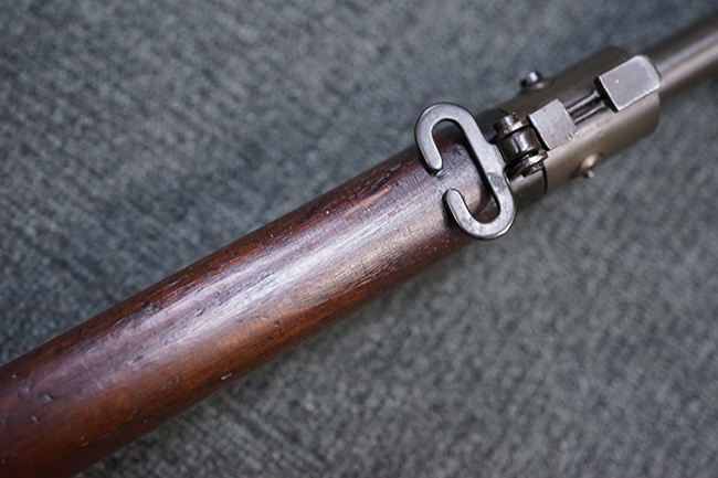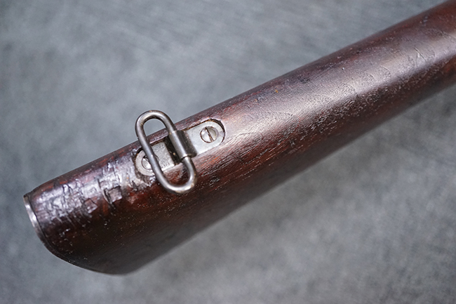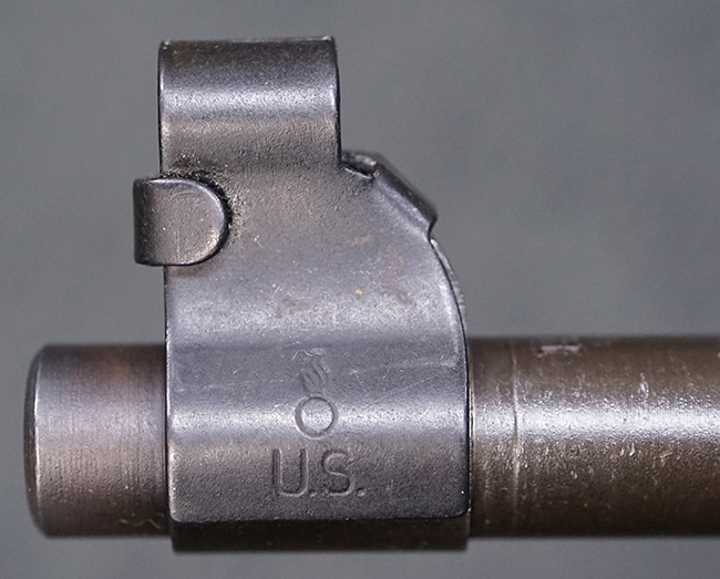 本品の銃本体はスミス・コロナ社製で、薬室上面にはシリアルNo.の他、「U.S. REMINGTON MODEL 03-A3」のモデル名刻印が入っています。 本品はシリアルNo.から1942年に製造された個体である事が窺えます。 銃身の刻印は1943年12月レミントン社製を示す「RA 12 43」となっており、レシーバーの生産時期とマッチしています。 トリガー上方の銃床左側面には1942年から1946年にかけて陸軍のロチェスター兵站管区で調達を担当していたFrank J. Atwood中佐のイニシャルを示す「FJA」の検査官刻印や、米国武器省 (Ordnance Department) の検査刻印であるクロス・キャノンの刻印が入っています。 また、銃把前面には「P」のプルーフ刻印が確認出来ます。