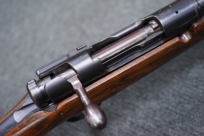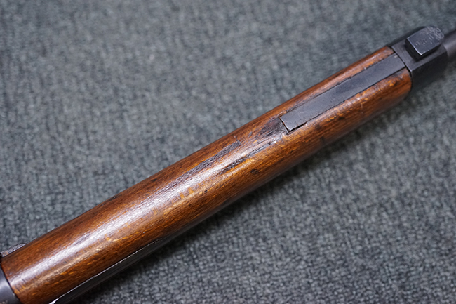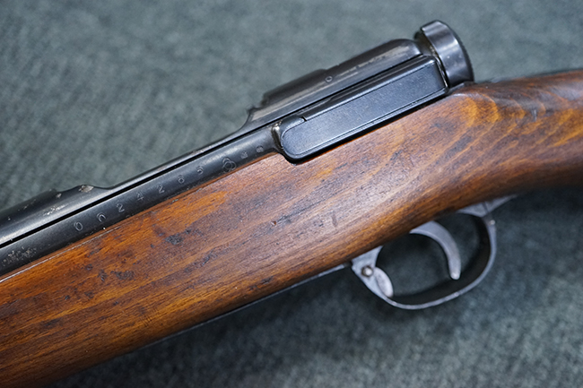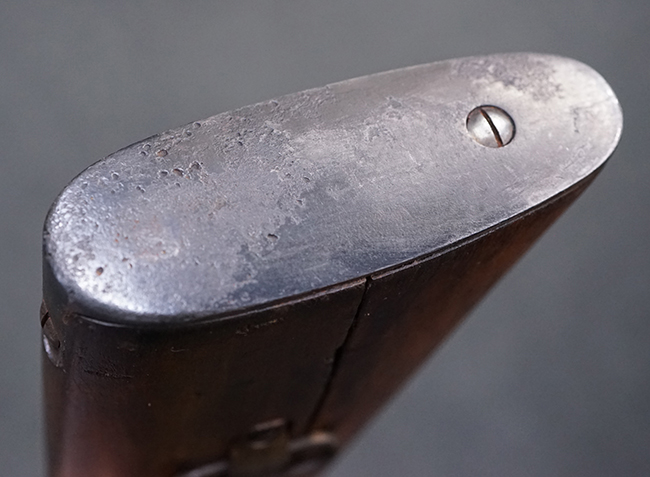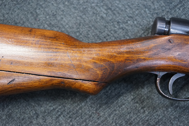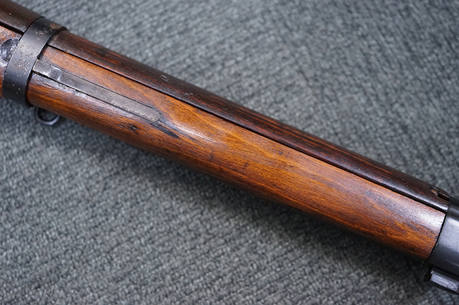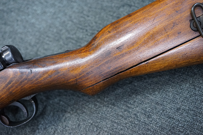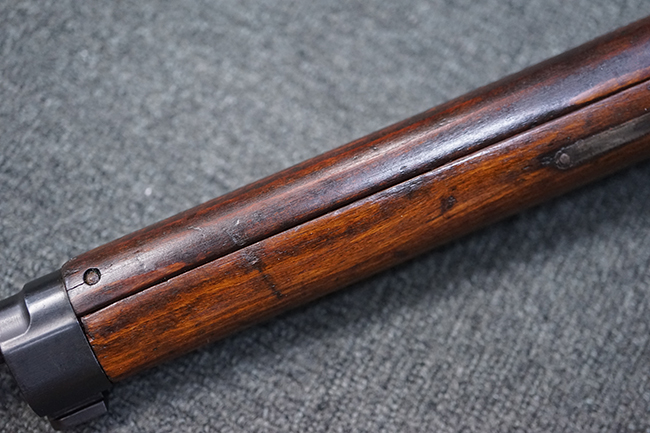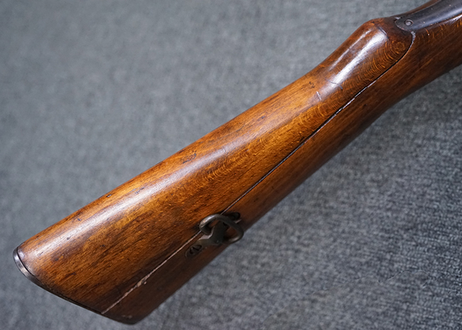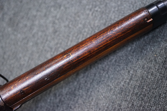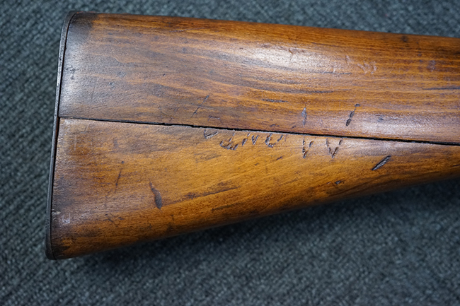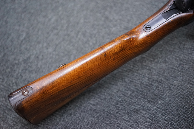 木部・金属部共に再仕上が施されており、金属部はブルー仕上げが鮮やかですが部分的に表面錆のあとがみられ、地金っぽくなっています。 目立った破損は見られませんが、バットプレートに表面的な朽ちこみの跡がみれます。木部は仕上げの艶があざやかですが角張った部分が丸くなっている印象です。 また銃床は少々目立つつ隙間が出来ていますが、がたつき無く固定されています。 その他小さな欠け等が散見されますが、劣化が進行している様子はありません。