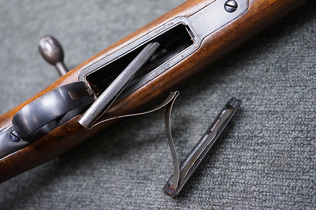 トリガー・テンションのある、ボルト・ハンドルを閉じた状態で溶接固定した新加工品です。 マガジン・スプリングは残っています。 (YS)