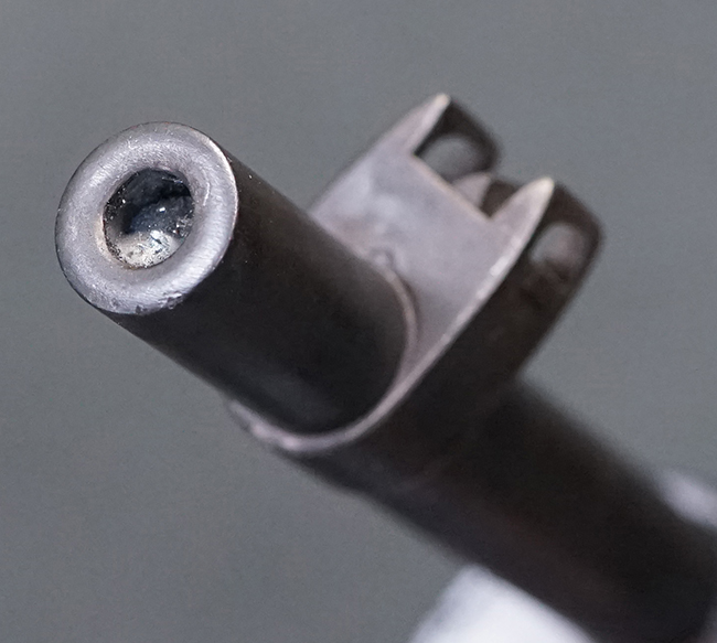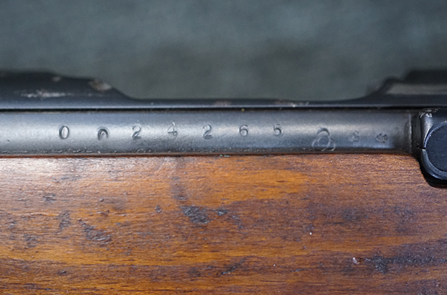 本個体は三八式騎兵銃 初期型の東京砲兵工廠 (小石川) 製です。 東京砲兵工廠では1923年 (大正12年) の関東大震災により甚大な被害を受け、一部機能を残しその役目を小倉工廠に移すまで生産されました。 初期型の東京砲兵工廠 (小石川) 製は、非常に丁寧な仕上がりで、検査刻印が多数打刻されているのが特徴的です。 本品の機関部左側面にはシリアルNo.0024265に加えて東京砲兵工廠製を示す刻印が入っています。 尚、シリーズ刻印は入っていません。 薬室上面の「三八式」の刻印ははっきりと残っていますが菊花紋章は完全に見えなくなっています。