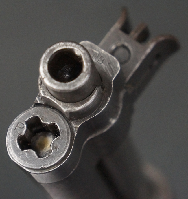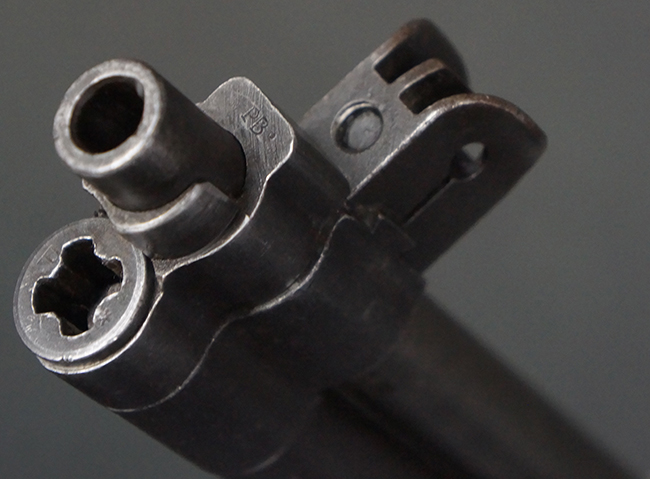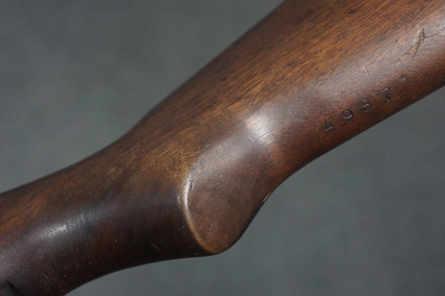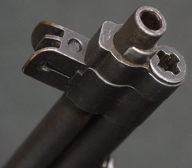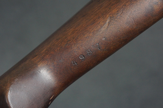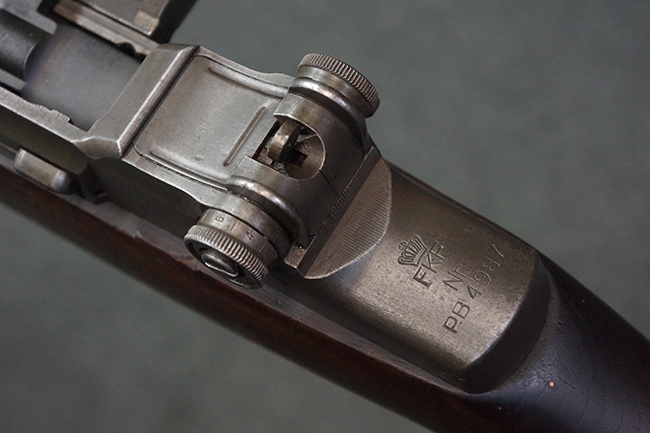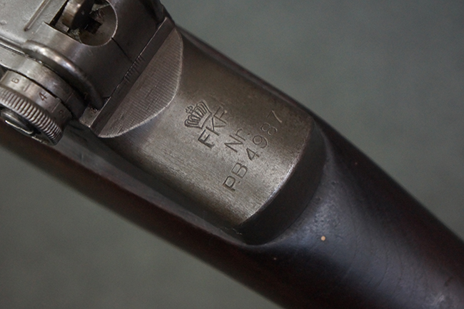 本品のレシーバー後部上面には王冠刻印及び「Forsvarets Krigsmateriel Forvaltning (国防軍需局)」を示すFKFの刻印が入っています。 また、シリアルNo.が「P.B.」から始まっており、機関部左側面には「BERETTA-ARMI ROMA-ITALIA」の刻印が入っている事から、本品の機関部がイタリアのベレッタ社で製造された事が判ります。 「PB」の刻印は銃身、フロント・サイト・ガード、リア・サイト、バット・プレート等各部に入っています。 シリアルNo.は機関部と銃床が4987でマッチしています。