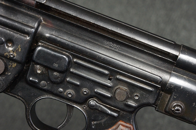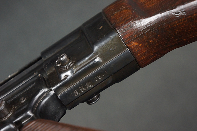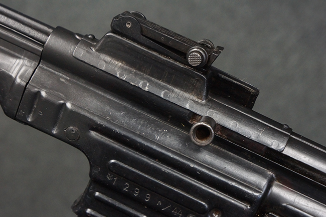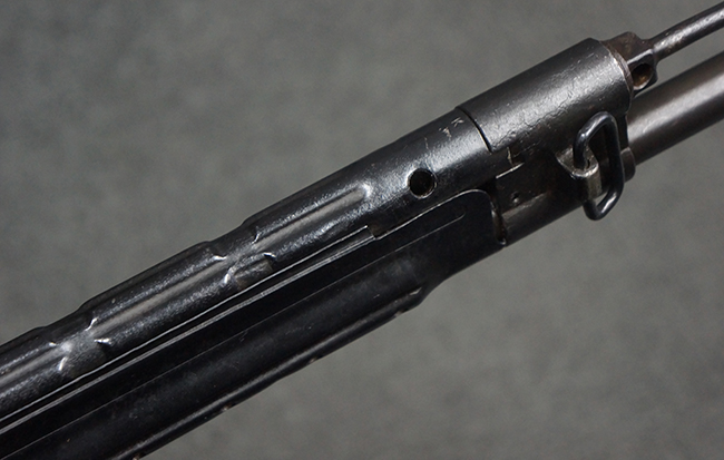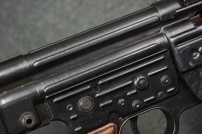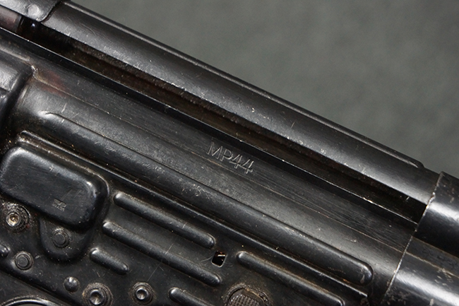 本品のレシーバー左側面には「MP44」のモデル名刻印が入っており、アッパー・レシーバー左側面にはシリアルNo.の後方に「/44」の刻印が入っている事から、本品が1944年に製造された事が判ります。 各部のシリアルNo.は、バット・ストックが8541で、バット・ストック基部も打ち直しにより8541となっています。 ストック右側面後部には2の番号が打刻されています。 フロント・サイト・ベース前面にJ.P. Sauer & Sohn社を示す「ce」の刻印が入っています。 その他、各部にアムト刻印も確認できます。