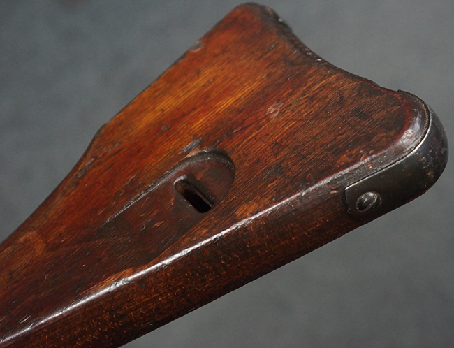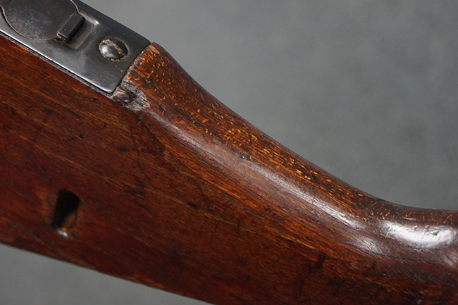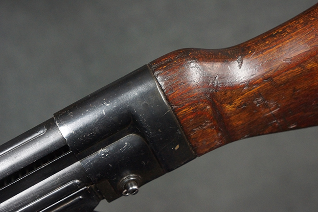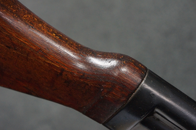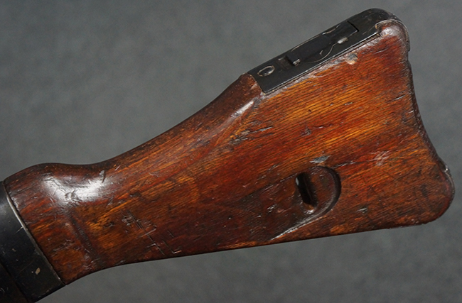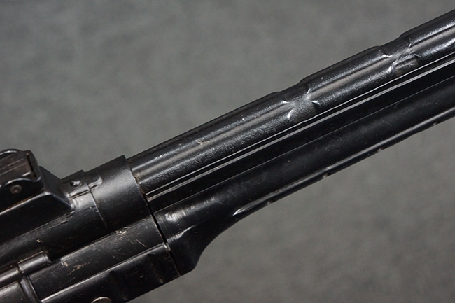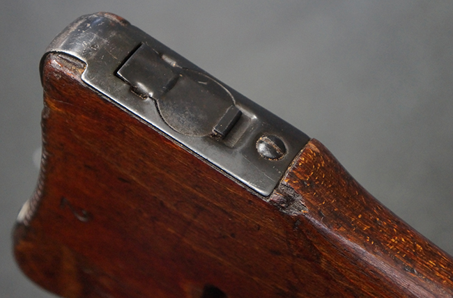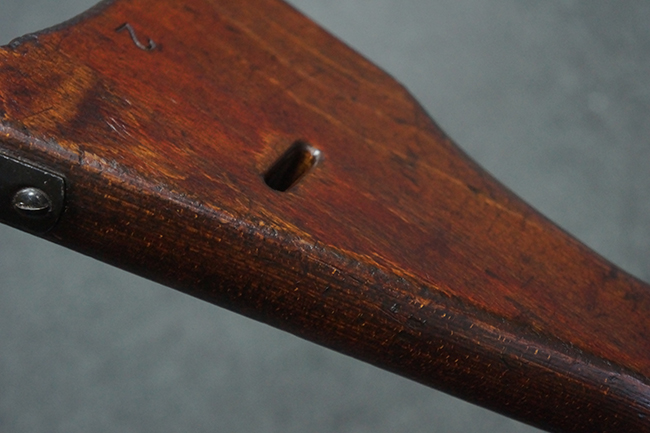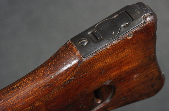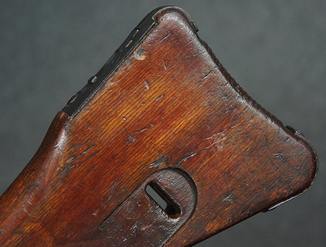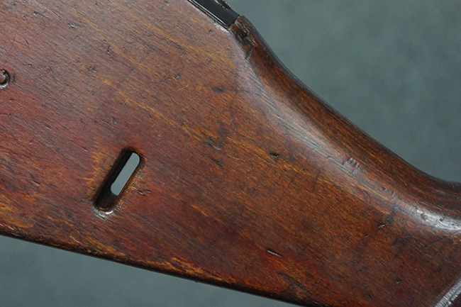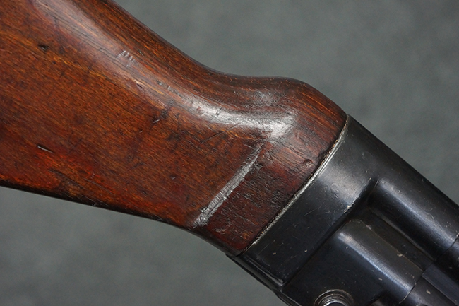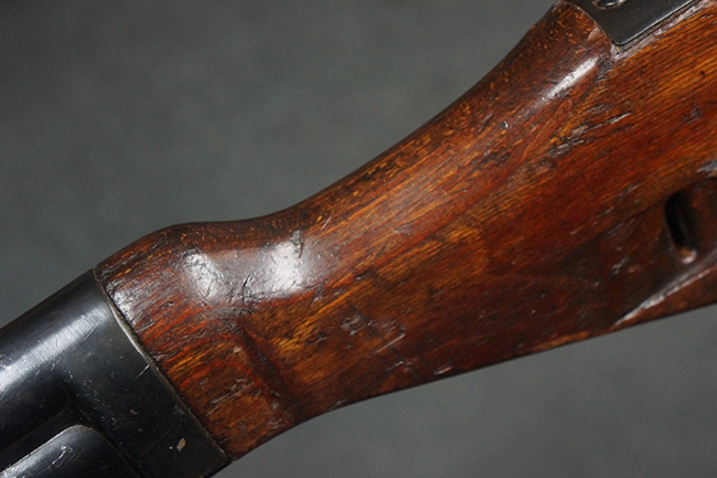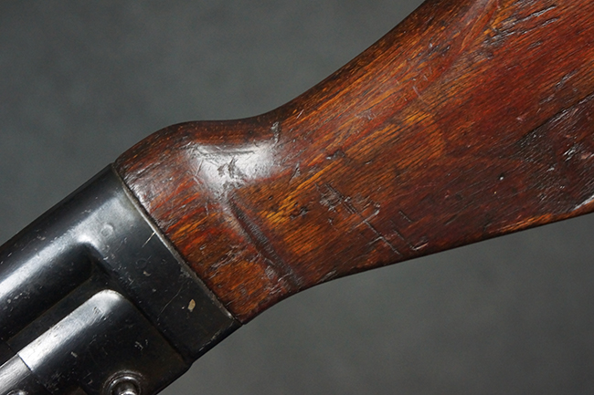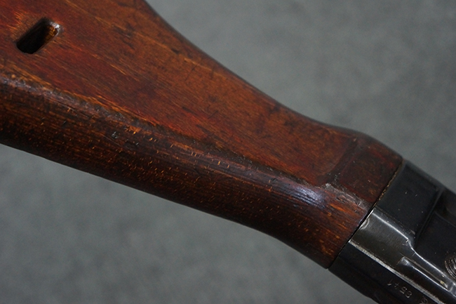 本品の金属部は全体に適度な使用感が見受けられ、やや打ち傷や擦れ、経年による褪色の他、若干の表面錆等が見られるものの、目立った欠損や変形等は見られず、総じてしっかりとした状態が保たれています。 木製バット・ストックについてもやや打ち傷や線傷、極小の欠けが見られるものの、大きな破損や欠損等は見受けられず、比較的良好な状態が保たれています。 傷み易い肩当て部についても、滑り止めの溝が良好に残っています。 また、ストック後部上面のコンパートメントの蓋の開閉についても、スプリングのテンションがしっかりと効いています。 バット・ストックのレシーバーへの取り付けは、僅かな遊びは見られるものの、十分許容レベルです。 木製のグリップ・パネルにもやや打ち傷や線傷等が見られるものの、大きな破損等は見られず、本体への取り付けについてもがたつき等は見られません。