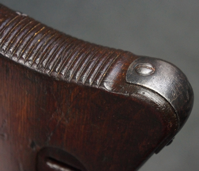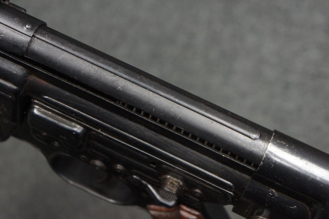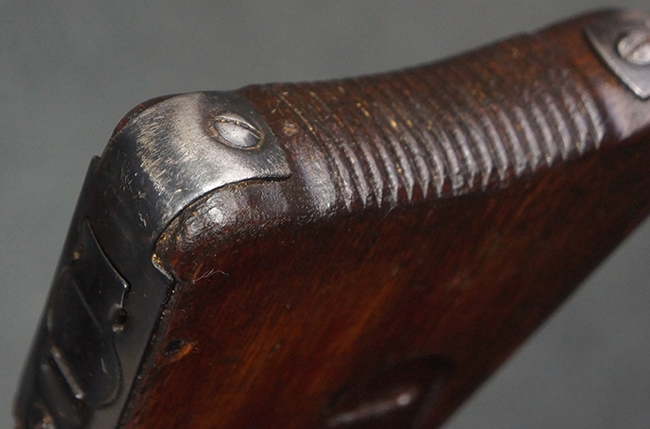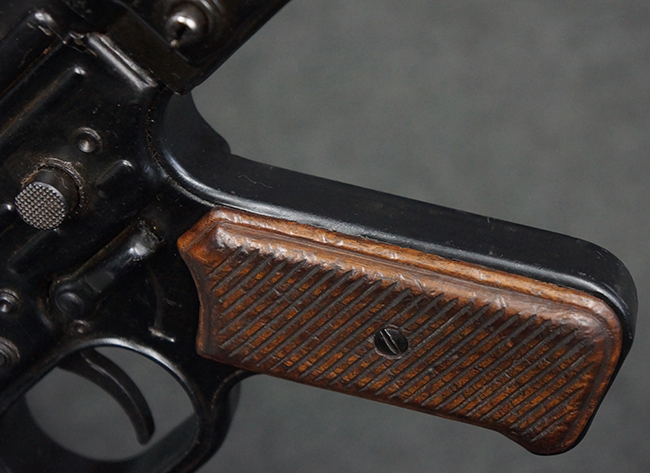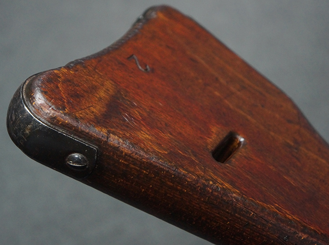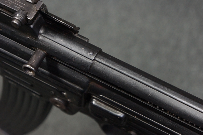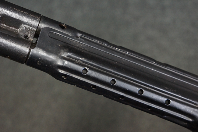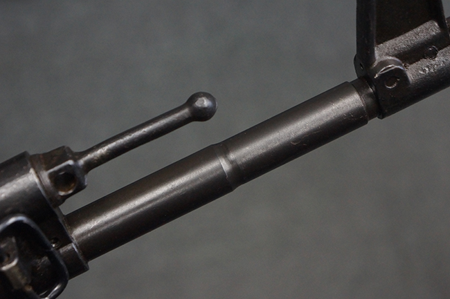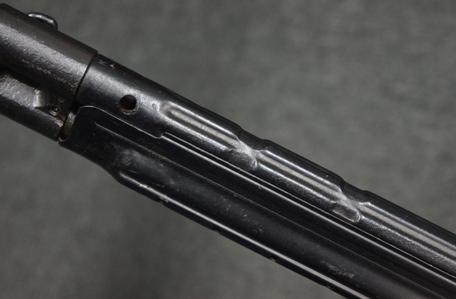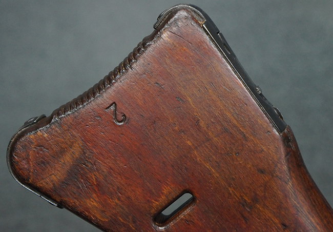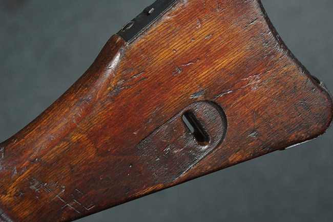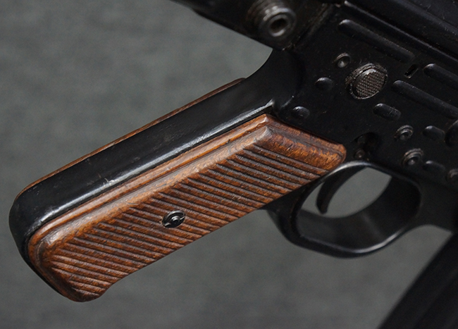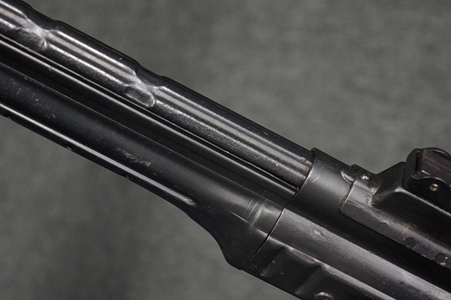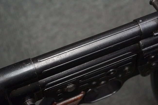 本品の金属部は全体に適度な使用感が見受けられ、やや打ち傷や擦れ、経年による褪色の他、若干の表面錆等が見られるものの、目立った欠損や変形等は見られず、総じてしっかりとした状態が保たれています。 木製バット・ストックについてもやや打ち傷や線傷、極小の欠けが見られるものの、大きな破損や欠損等は見受けられず、比較的良好な状態が保たれています。 傷み易い肩当て部についても、滑り止めの溝が良好に残っています。 また、ストック後部上面のコンパートメントの蓋の開閉についても、スプリングのテンションがしっかりと効いています。 バット・ストックのレシーバーへの取り付けは、僅かな遊びは見られるものの、十分許容レベルです。 木製のグリップ・パネルにもやや打ち傷や線傷等が見られるものの、大きな破損等は見られず、本体への取り付けについてもがたつき等は見られません。