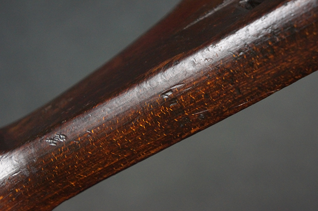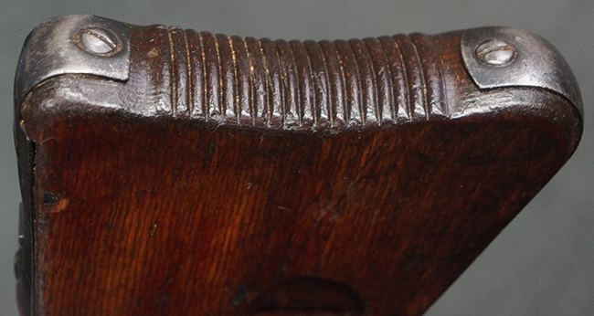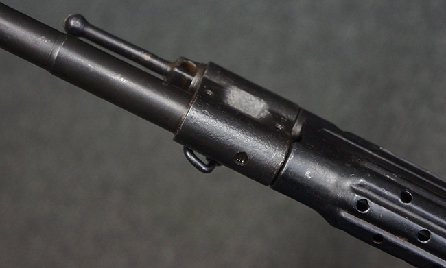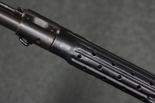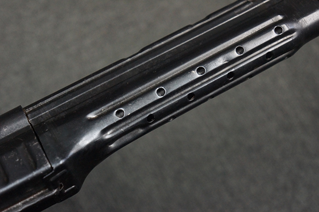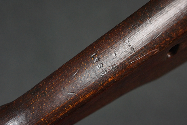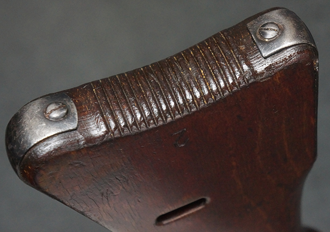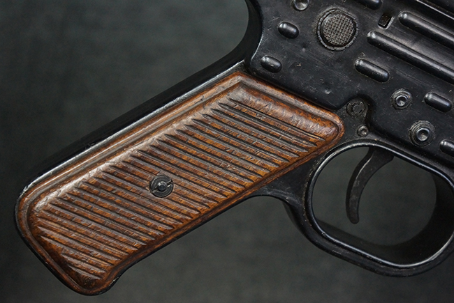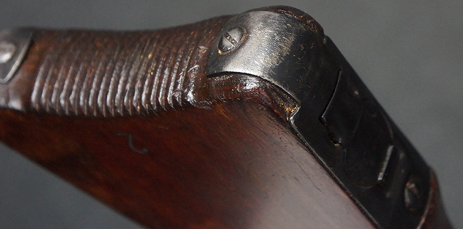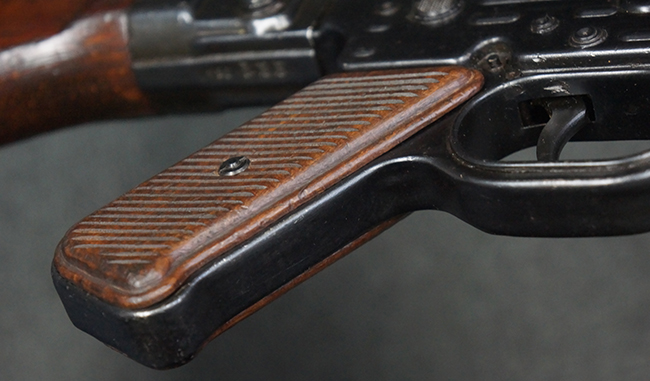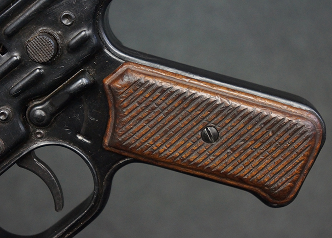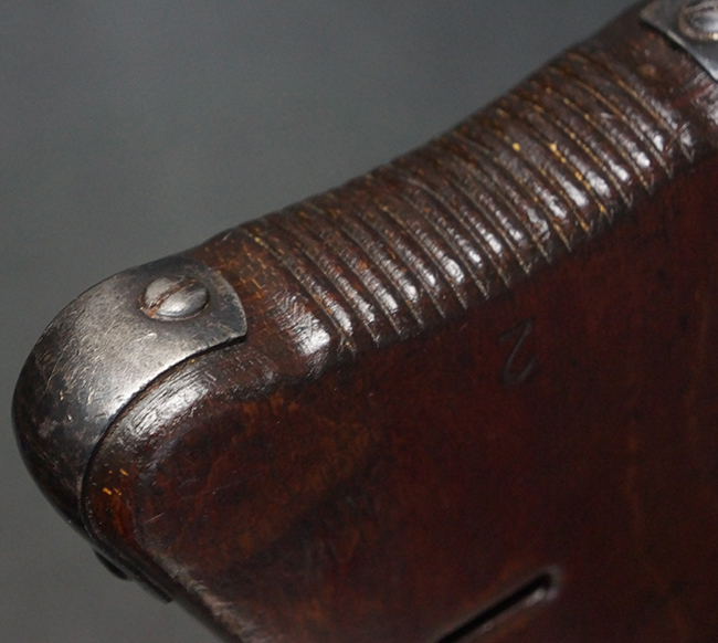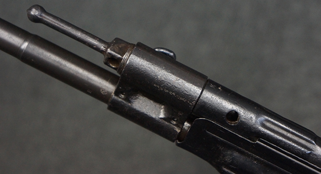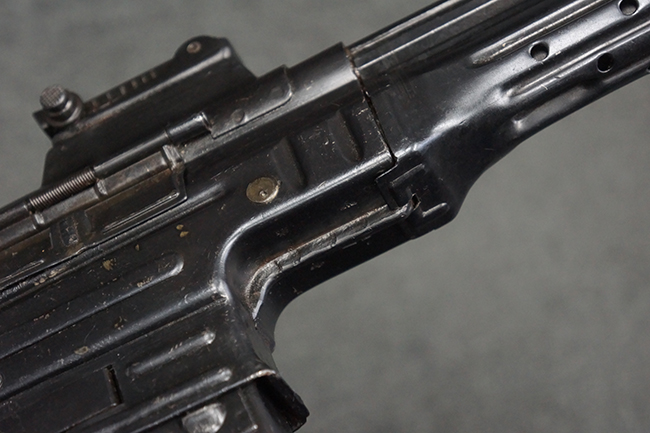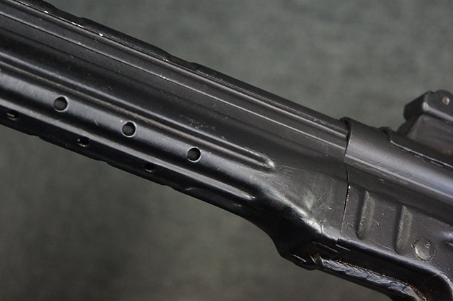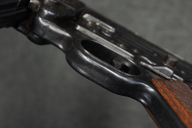本品の金属部は全体に適度な使用感が見受けられ、やや打ち傷や擦れ、経年による褪色の他、若干の表面錆等が見られるものの、目立った欠損や変形等は見られず、総じてしっかりとした状態が保たれています。 木製バット・ストックについてもやや打ち傷や線傷、極小の欠けが見られるものの、大きな破損や欠損等は見受けられず、比較的良好な状態が保たれています。 傷み易い肩当て部についても、滑り止めの溝が良好に残っています。 また、ストック後部上面のコンパートメントの蓋の開閉についても、スプリングのテンションがしっかりと効いています。 バット・ストックのレシーバーへの取り付けは、僅かな遊びは見られるものの、十分許容レベルです。 木製のグリップ・パネルにもやや打ち傷や線傷等が見られるものの、大きな破損等は見られず、本体への取り付けについてもがたつき等は見られません。