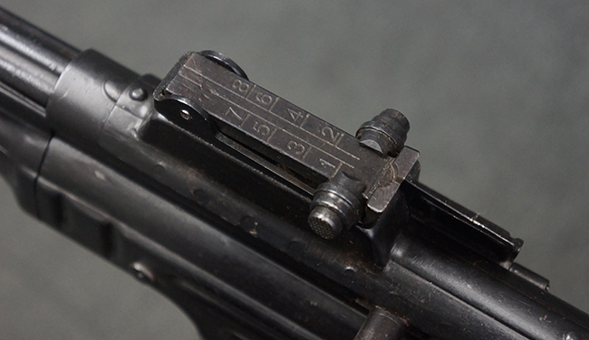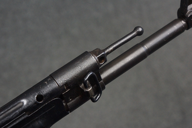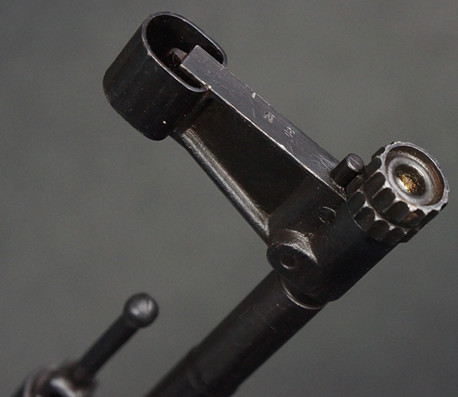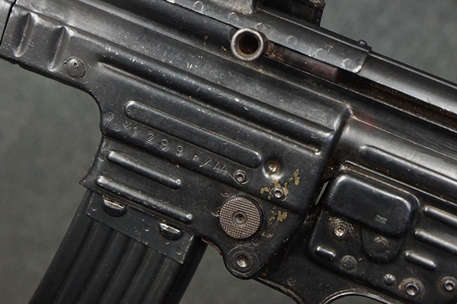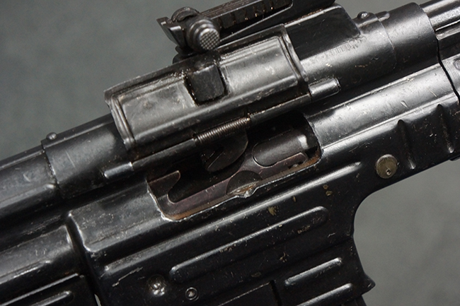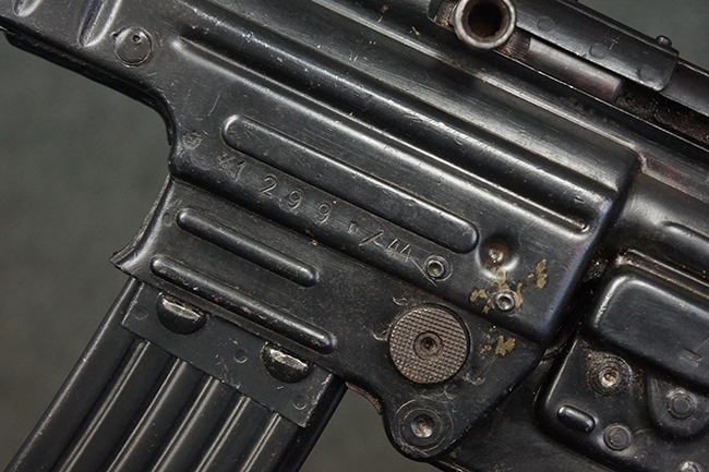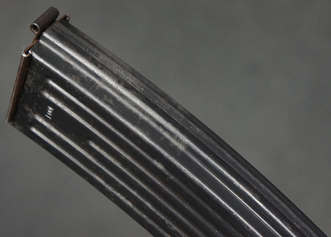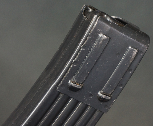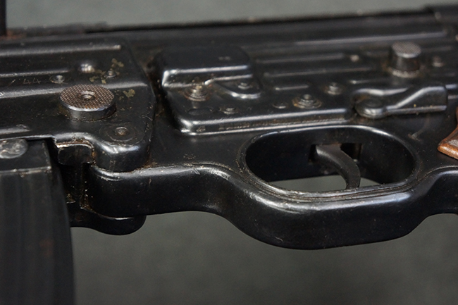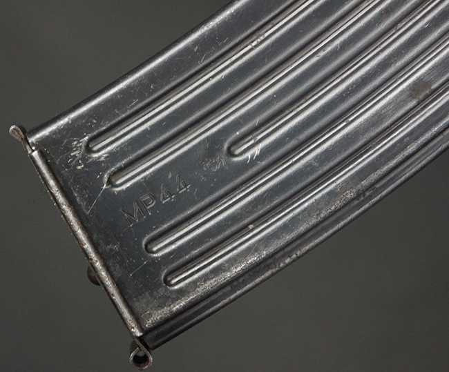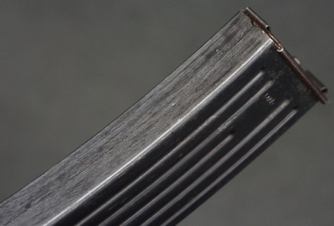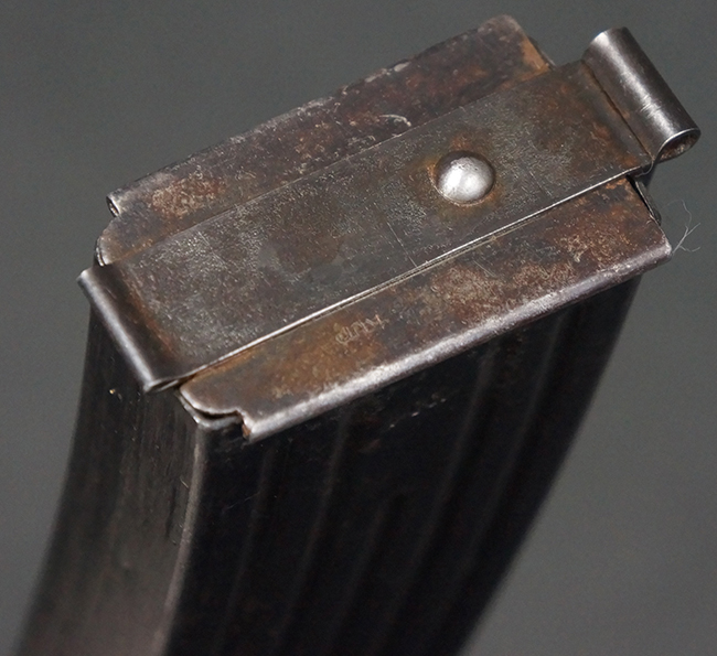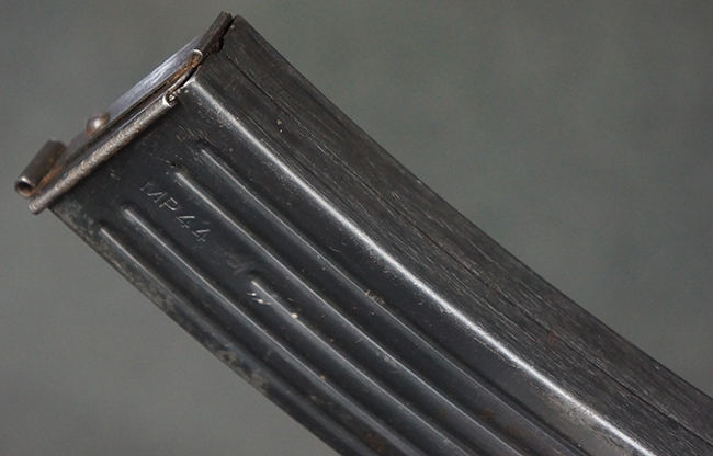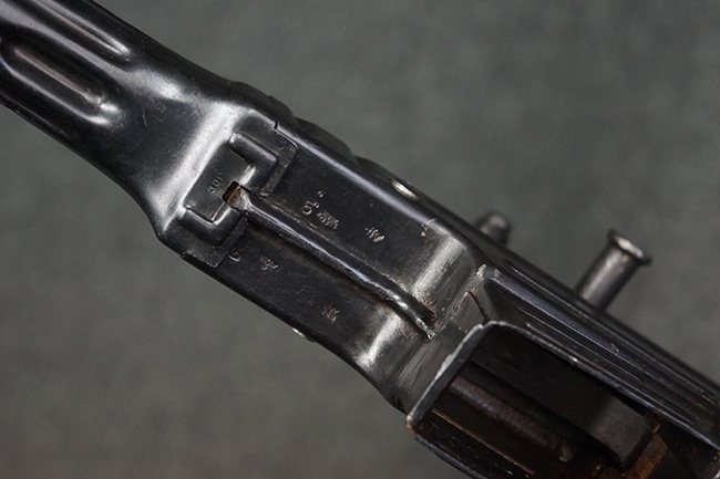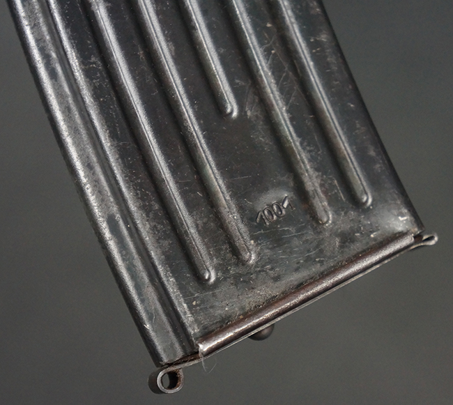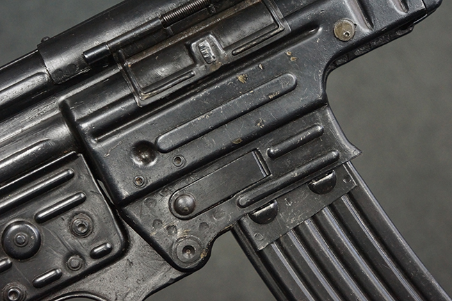 リア・サイトの調整やマガジンの着脱については問題なく行う事が可能です。 マガジンは装着時に若干の遊びが見られますが、固定自体はしっかりとしています。 付属のマガジンには「MP44」のモデル名刻印及び「1001」のコードが確認出来ます。 また、マガジン・ボトム・プレートにはステアー社を示す「kur」の刻印が入っています。 マガジンはやや打ち傷や擦れ、表面錆痕が見受けられますが、目立った凹みや変形等は見られず、概ねしっかりとした状態が保たれています。 セーフティ・レバーやセレクター・ボタンの切り替えについても問題なく行う事が可能で、セーフティは安全位置でトリガーがロックされます。
