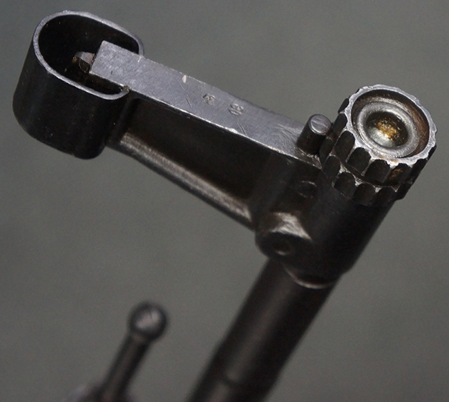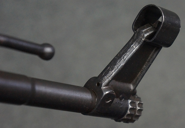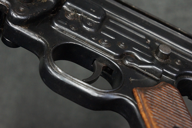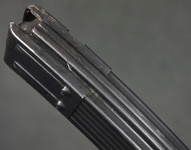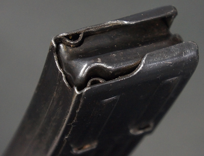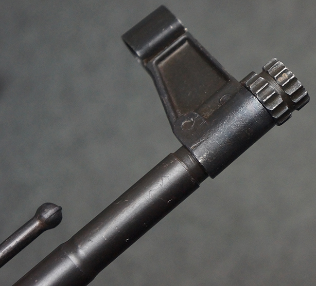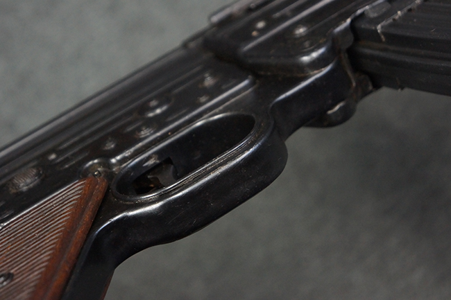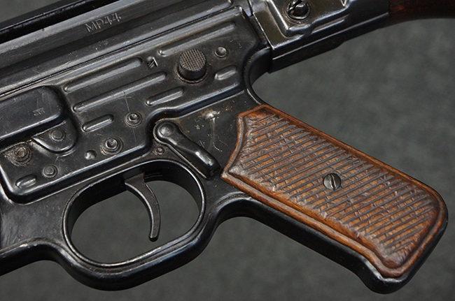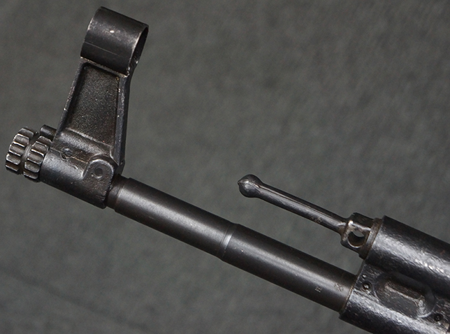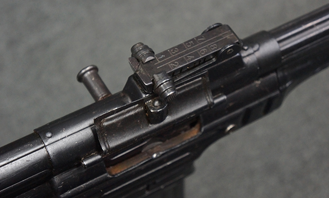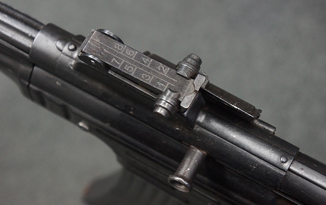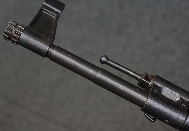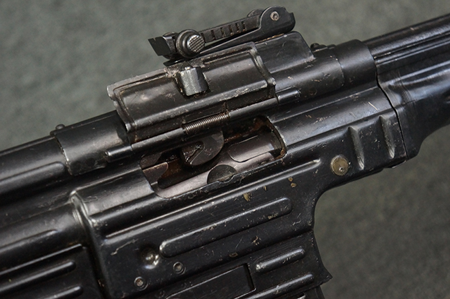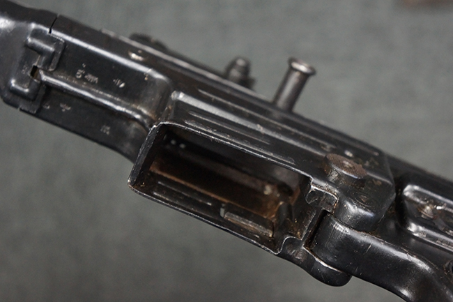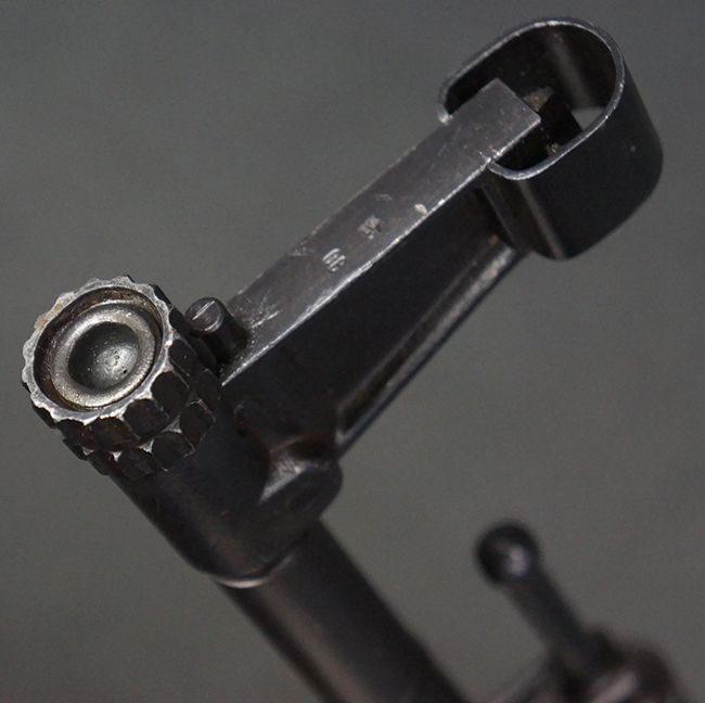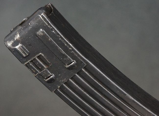 リア・サイトの調整やマガジンの着脱については問題なく行う事が可能です。 マガジンは装着時に若干の遊びが見られますが、固定自体はしっかりとしています。 付属のマガジンには「MP44」のモデル名刻印及び「1001」のコードが確認出来ます。 また、マガジン・ボトム・プレートにはステアー社を示す「kur」の刻印が入っています。 マガジンはやや打ち傷や擦れ、表面錆痕が見受けられますが、目立った凹みや変形等は見られず、概ねしっかりとした状態が保たれています。 セーフティ・レバーやセレクター・ボタンの切り替えについても問題なく行う事が可能で、セーフティは安全位置でトリガーがロックされます。